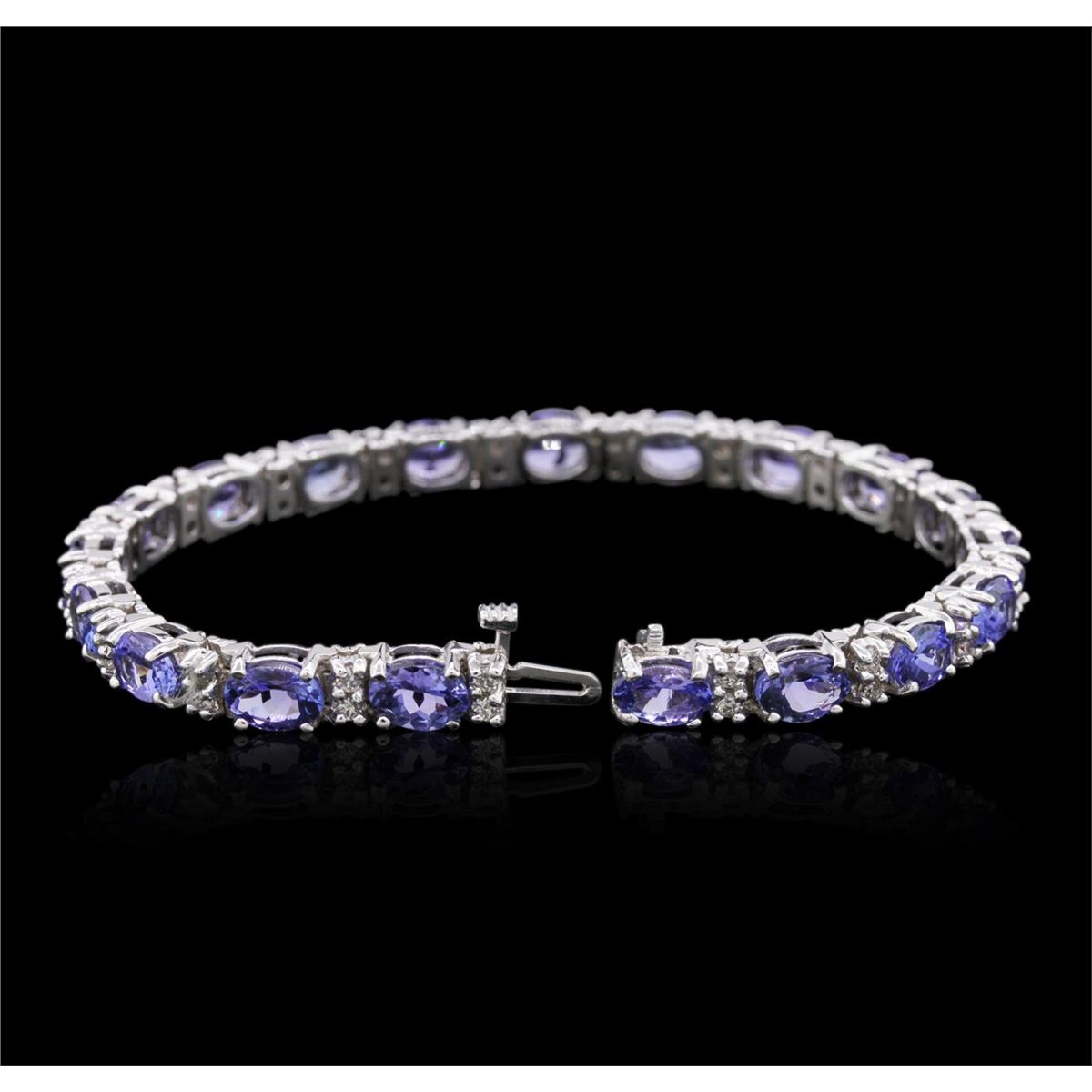 One electronically tested 14KT white gold ladies combination cast & assembled tanzanite and diamond bracelet with a hidden box clasp with a bright polish finish. Measurements: 7" in length. Identified with markings of "14K". Condition is new. Containing: Nineteen prong set oval modified brilliant cut natural tanzanites, measuring 7.00 x 4.90 x 3.43mm, approximate total weight of 15.39ct., clarity is eye clean, type I, medium, moderately strong, violet color, (GIA V 5/4), cut is good. Thirty-Eight prong set round brilliant cut diamonds, measuring 1.60 - 1.60 x 0.96mm (depth est.) approximate total weight of 38 Stones = 0.57ct. Clarity: SI-2 to I-1. Color: I - J, Cut is Good. Colored gemstones are presumed to have been subjected to commonly used enhancement processes. All diamonds and colored gemstones are graded in the mounting, unless otherwise stated. Total Weight of Colored Stones 15.39ct. Total Weight of Diamonds 0.57ct. Total Weight of Bracelet 21.50 grams. GGL Appraised at $14,530.00.