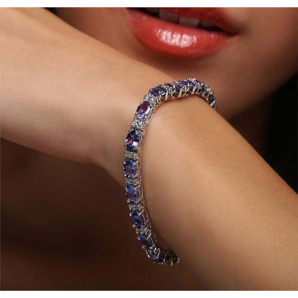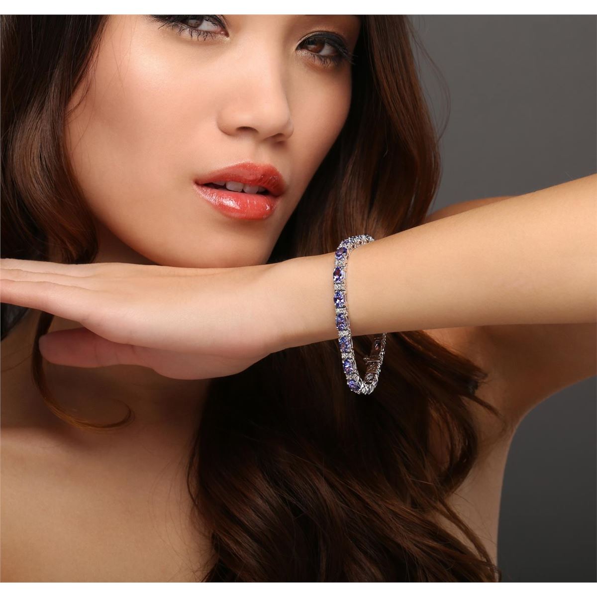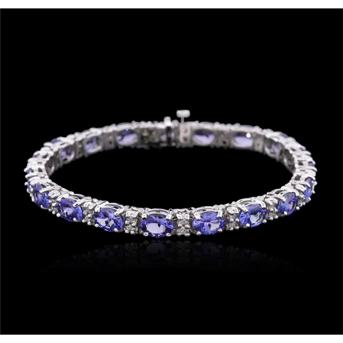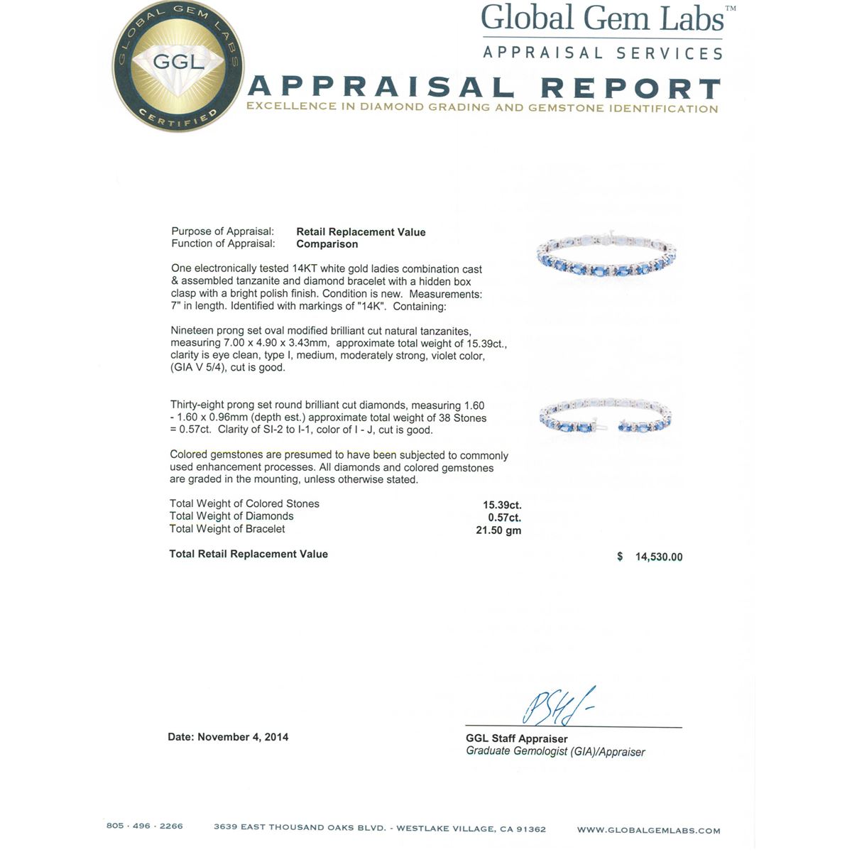 One electronically tested 14KT white gold ladies combination cast & assembled tanzanite and diamond bracelet with a hidden box clasp with a bright polish finish. Measurements: 7" in length. Identified with markings of "14K". Condition is new. Containing: Nineteen prong set oval modified brilliant cut natural tanzanites, measuring 7.00 x 4.90 x 3.43mm, approximate total weight of 15.39ct., clarity is eye clean, type I, medium, moderately strong, violet color, (GIA V 5/4), cut is good. Thirty-Eight prong set round brilliant cut diamonds, measuring 1.60 - 1.60 x 0.96mm (depth est.) approximate total weight of 38 Stones = 0.57ct. Clarity: SI-2 to I-1. Color: I - J, Cut is Good. Colored gemstones are presumed to have been subjected to commonly used enhancement processes. All diamonds and colored gemstones are graded in the mounting, unless otherwise stated. Total Weight of Colored Stones 15.39ct. Total Weight of Diamonds 0.57ct. Total Weight of Bracelet 21.50 grams. GGL Appraised at $14,530.00.