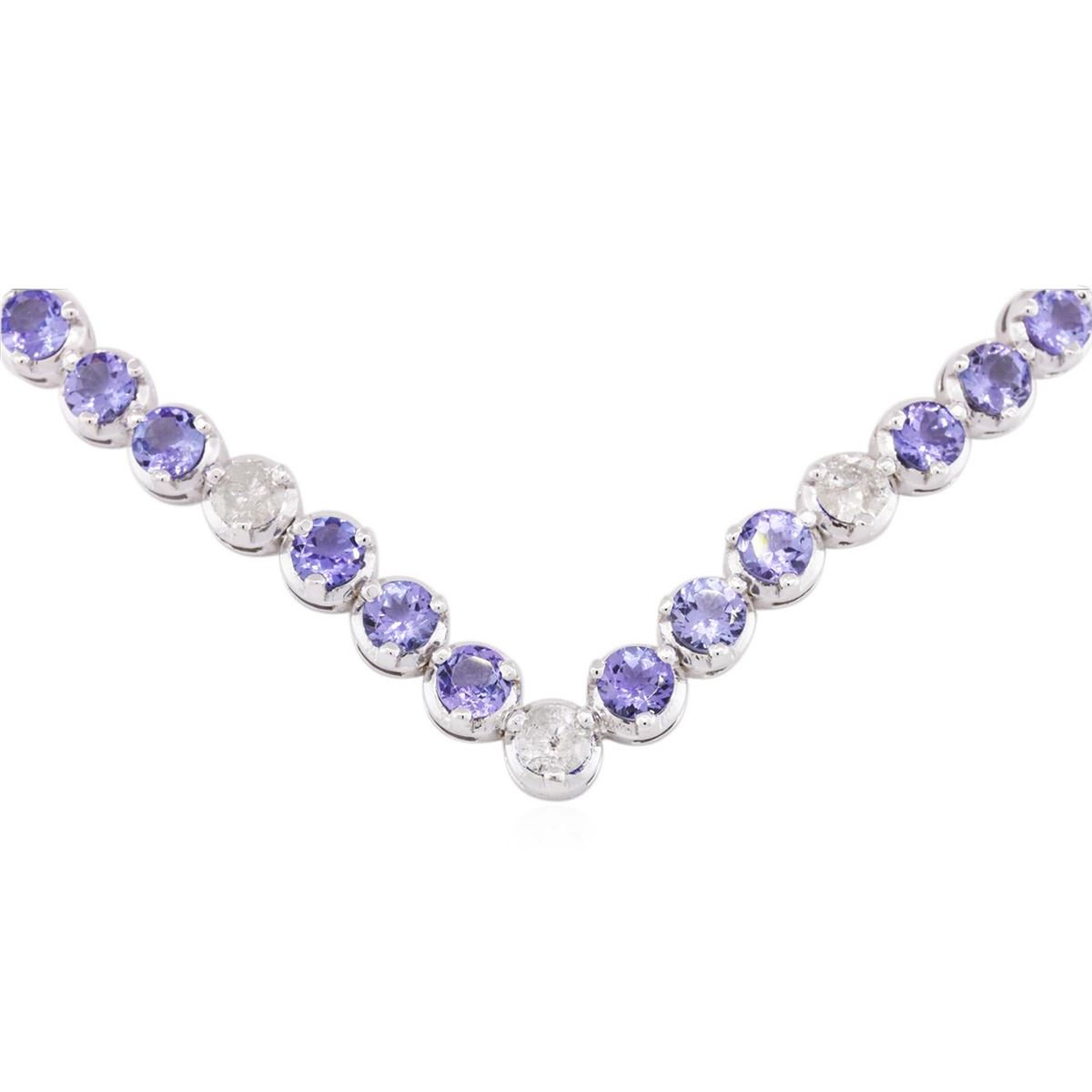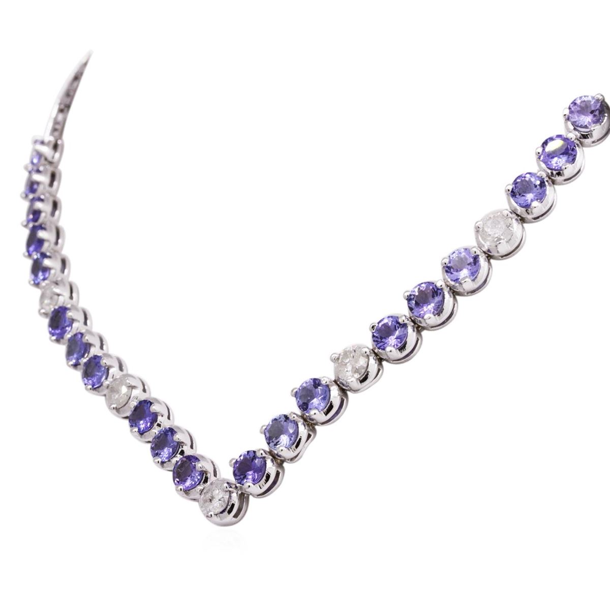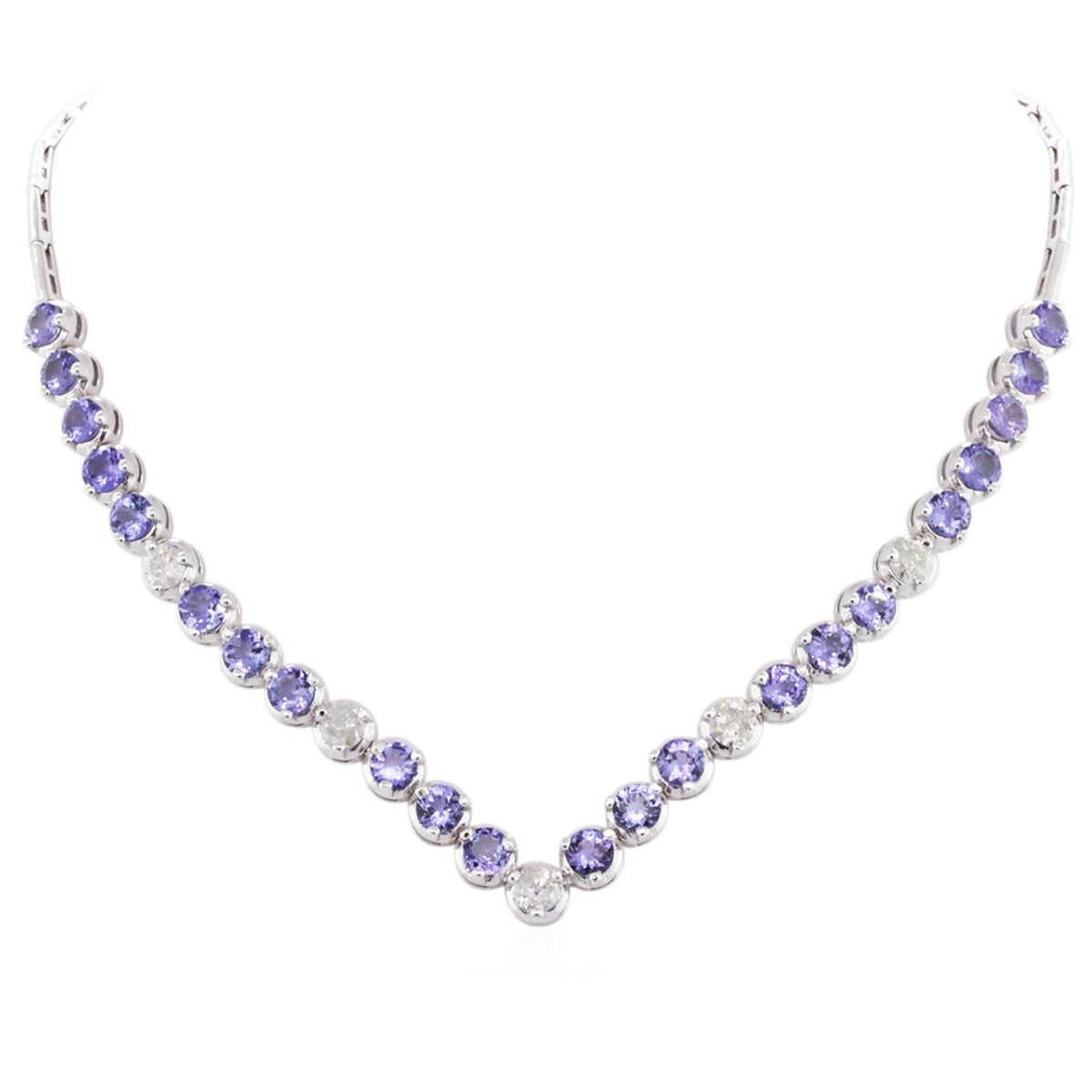 One electronically tested 14KT white gold ladies combination cast & assembled tanzanite and diamond necklace with a hidden box clasp with safety closer with a bright polish finish. Identified with markings of "14K". Condition is new. Containing: Twenty-two prong set round modified brilliant cut natural tanzanites, measuring 5.54 - 5.42 x 3.38 mm, approximate total weight of 15.40ct., clarity is eye clean, type I, medium light, very slightly grayish, violet color, (GIA V 4/3), cut is good. Five prong set round brilliant cut diamonds, measuring 5.59 - 5.33 x 3.28mm (depth est.) approximate total weight of 5 Stones = 2.98ct. Clarity: I-2 to I-3. Color: I - J, Cut is Good. All diamonds and colored gemstones are graded in the mounting, unless otherwise stated. Colored gemstones are presumed to have been subjected to commonly used enhancement processes. Total Weight of Colored Stones 15.40ct. Total Weight of Diamonds 2.98ct. Total Weight of Necklace 34.00 grams. GGL Appraised at $15,925.00.