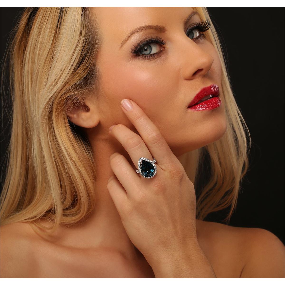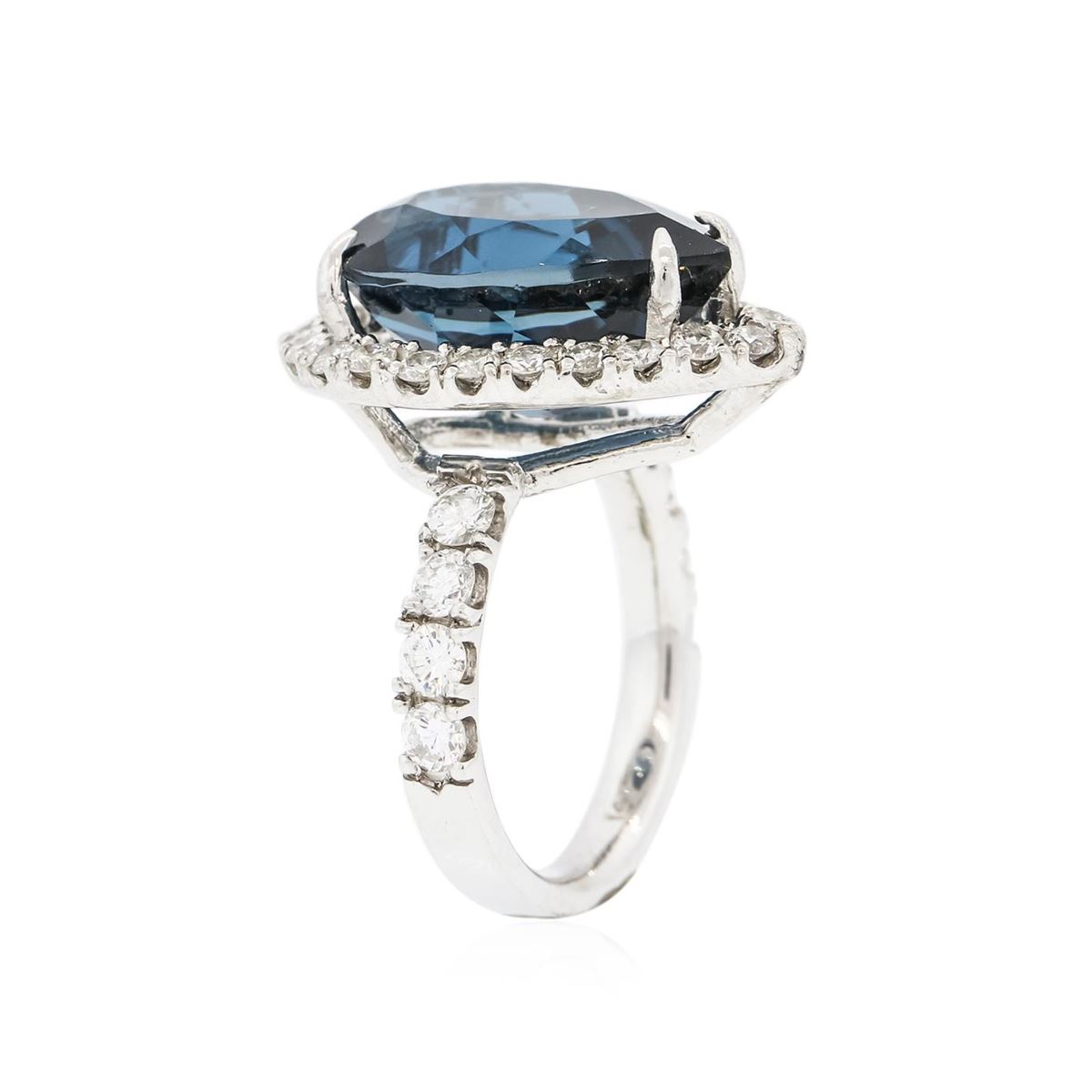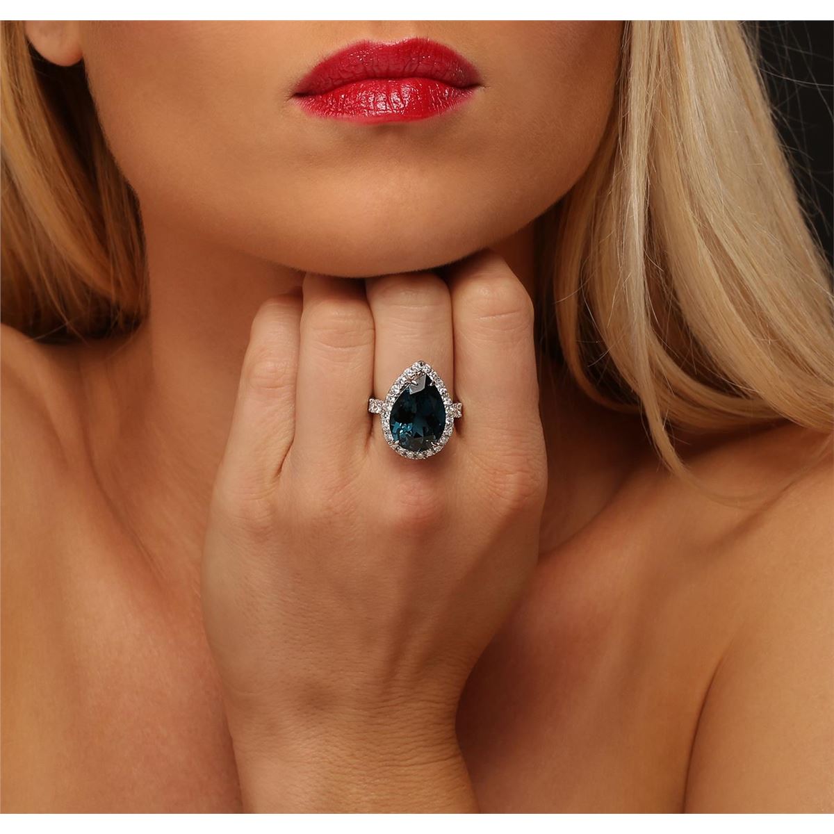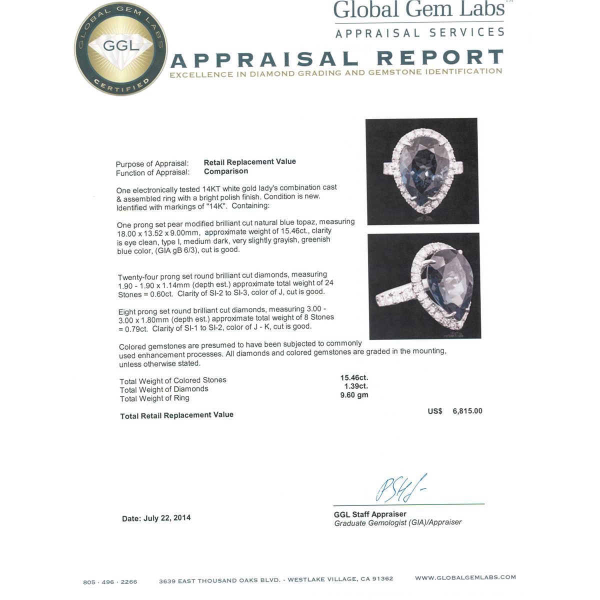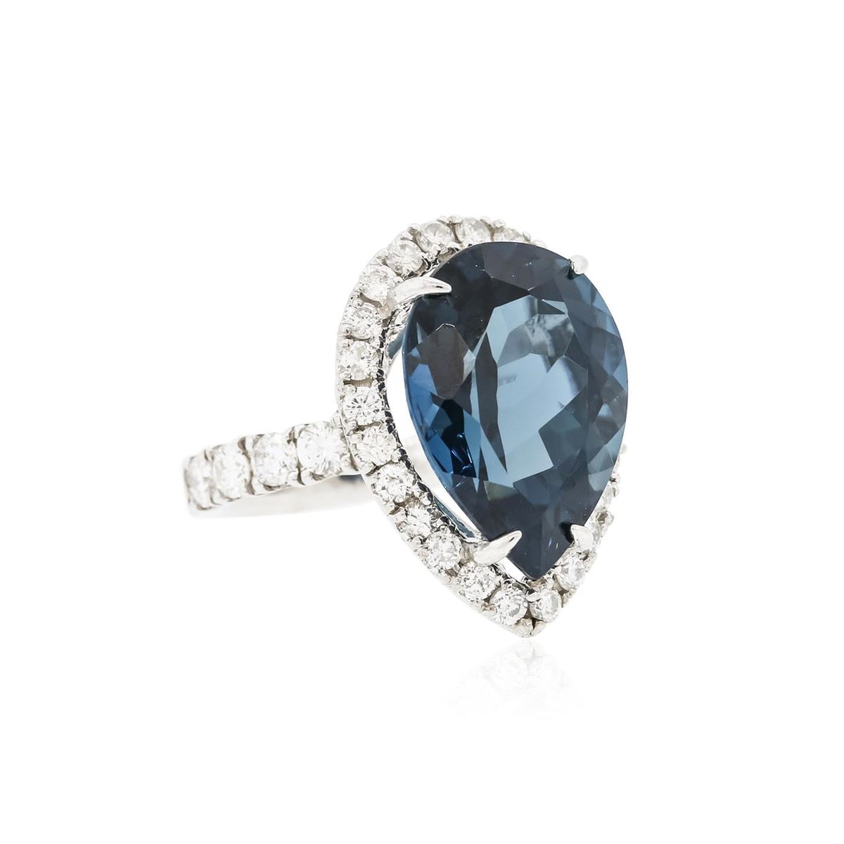 One electronically tested 14KT white gold ladies combination cast & assembled ring with a bright polish finish. Condition is new. Identified with markings of "14K". Containing: One prong set pear modified brilliant cut natural blue topaz, measuring 18.00 x 13.52 x 9.00mm, approximate weight of 15.46ct., clarity is eye clean, type I, medium dark, very slightly grayish, greenish blue color, (GIA gB 6/3), cut is good. Twenty-Four prong set round brilliant cut diamonds, measuring 1.90 - 1.90 x 1.14mm (depth est.) approximate total weight of 24 Stones = 0.60ct. Clarity: SI-2 to SI-3. Color: J, Cut is Good. Eight prong set round brilliant cut diamonds, measuring 3.00 - 3.00 x 1.80mm (depth est.) approximate total weight of 8 Stones = 0.79ct. Clarity: SI-1 to SI-2. Color: J - K, Cut is Good. Colored gemstones are presumed to have been subjected to commonly used enhancement processes. All diamonds and colored gemstones are graded in the mounting, unless otherwise stated. Total Weight of Colored Stones 15.46ct. Total Weight of Diamonds 1.39ct. Total Weight of Ring 9.60 grams. GGL Appraised at $6,815.00.