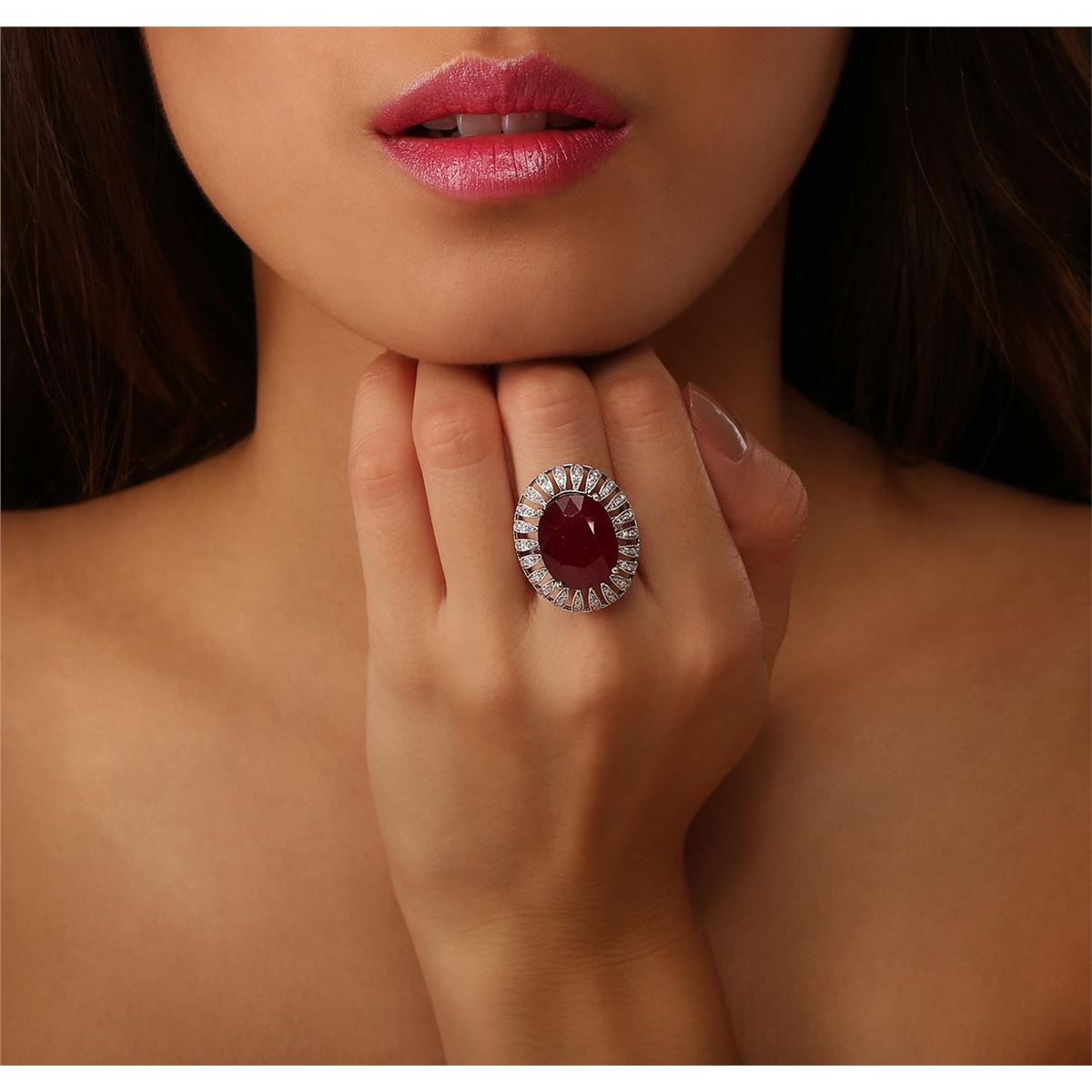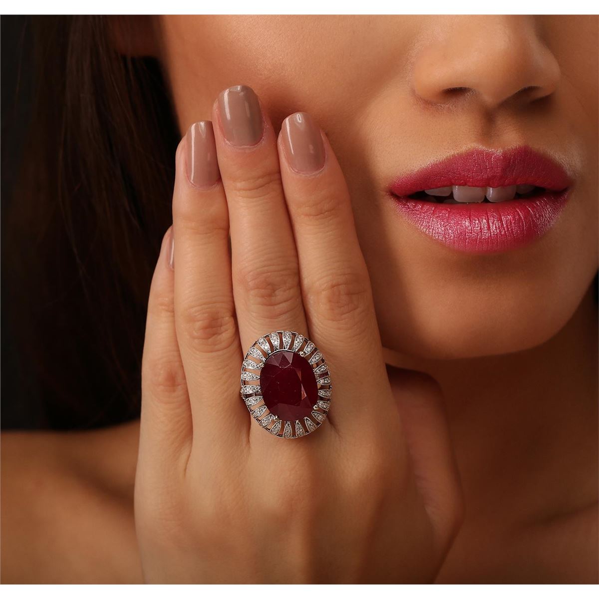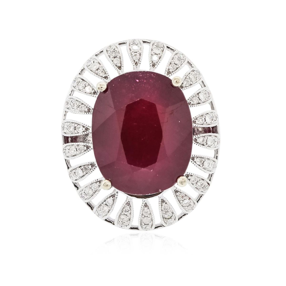 One electronically tested 14KT white gold ladies cast ruby and diamond ring. Condition is new, good workmanship. The featured ruby is set within a stylized diamond bezel supported by diamond set shoulders, completed by a two and one-half millimeter wide band. Bright polish finish with milgrain detailing throughout. Trademark is PMI. Identified with markings of "14K". Containing: One prong set oval mixed cut natural ruby, measuring 16.80 x 13.50 x 7.70mm, 10%. bulge factor, approximate weight of 15.55ct., clarity is heavily included, type II, dark, very slightly brownish, slightly purplish red color, (GIA slpR 7/3), cut is good. Transmitting light somewhat diffusely, transparent to translucent. Naturally occurring internal & external characteristics are present. Indications of laboratory high temperature heat treatment, with glass & flux additives. Graded in the setting. Ruby has a low tolerance to rhodium plating, repolishing the surface, & ultrasonic cleaning. Sixty-Six bead set round brilliant cut diamonds, measuring 1.30 - 1.20 x 0.75mm (depth est.) approximate. Total Weight of 66 Stones = 0.56ct. Graded in the setting. Clarity: I-1 to I-3. Color: G - I. Total Weight of Colored Stones 15.55ct. Total Weight of Diamonds 0.56ct. Total Weight of Ring 10.00 grams. AIG Appraised at $5,880.00.