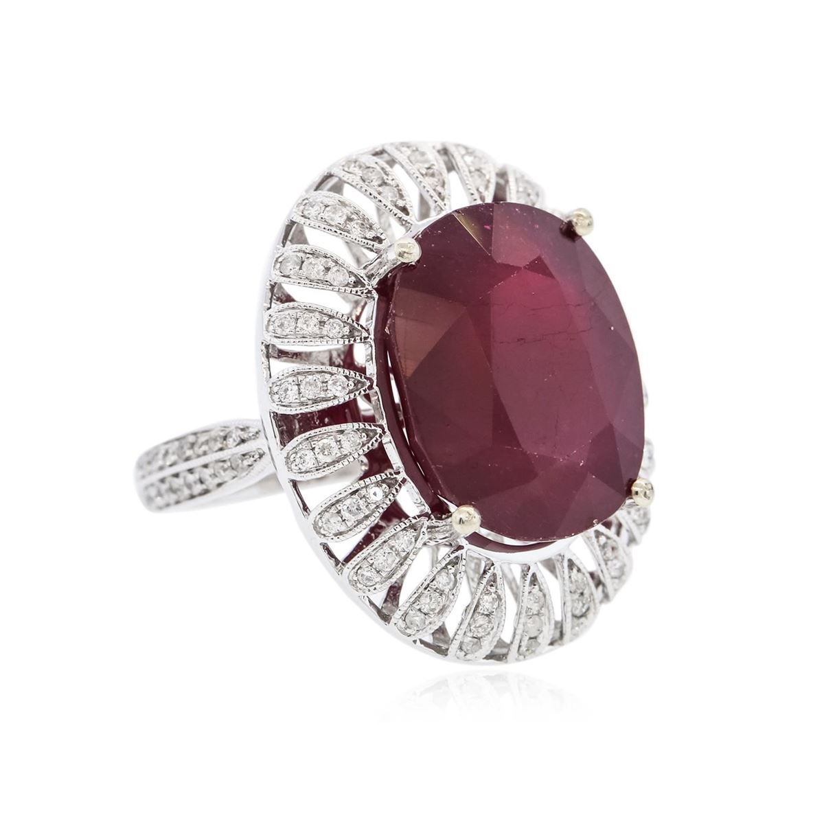 One electronically tested 14KT white gold ladies cast ruby and diamond ring. Condition is new, good workmanship. The featured ruby is set within a stylized diamond bezel supported by diamond set shoulders, completed by a two and one-half millimeter wide band. Bright polish finish with milgrain detailing throughout. Trademark is PMI. Identified with markings of "14K". Containing: One prong set oval mixed cut natural ruby, measuring 16.80 x 13.50 x 7.70mm, 10%. bulge factor, approximate weight of 15.55ct., clarity is heavily included, type II, dark, very slightly brownish, slightly purplish red color, (GIA slpR 7/3), cut is good. Transmitting light somewhat diffusely, transparent to translucent. Naturally occurring internal & external characteristics are present. Indications of laboratory high temperature heat treatment, with glass & flux additives. Graded in the setting. Ruby has a low tolerance to rhodium plating, repolishing the surface, & ultrasonic cleaning. Sixty-Six bead set round brilliant cut diamonds, measuring 1.30 - 1.20 x 0.75mm (depth est.) approximate. Total Weight of 66 Stones = 0.56ct. Graded in the setting. Clarity: I-1 to I-3. Color: G - I. Total Weight of Colored Stones 15.55ct. Total Weight of Diamonds 0.56ct. Total Weight of Ring 10.00 grams. AIG Appraised at $5,880.00.