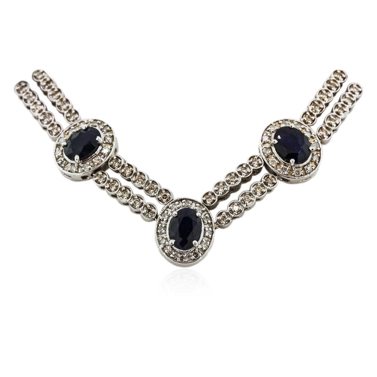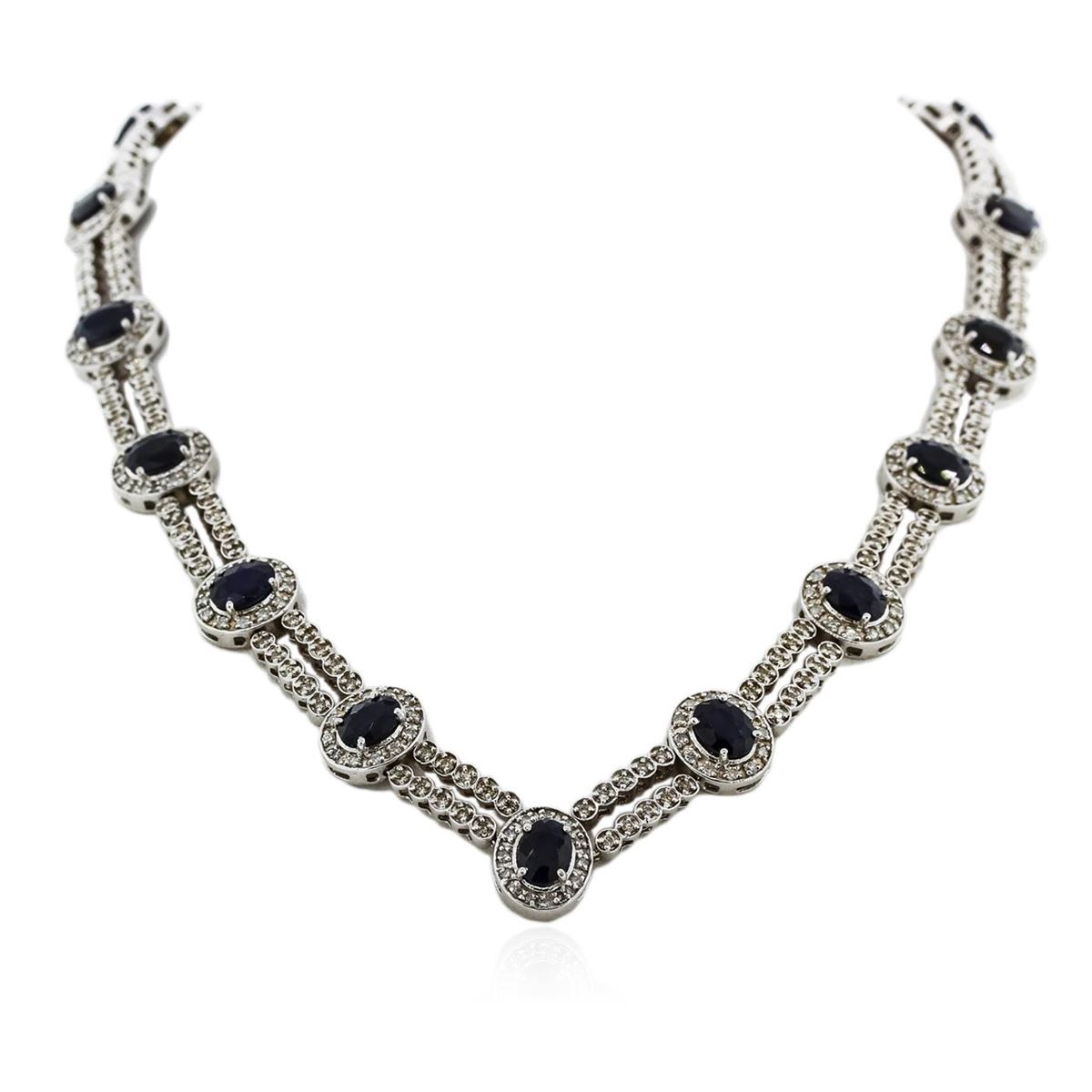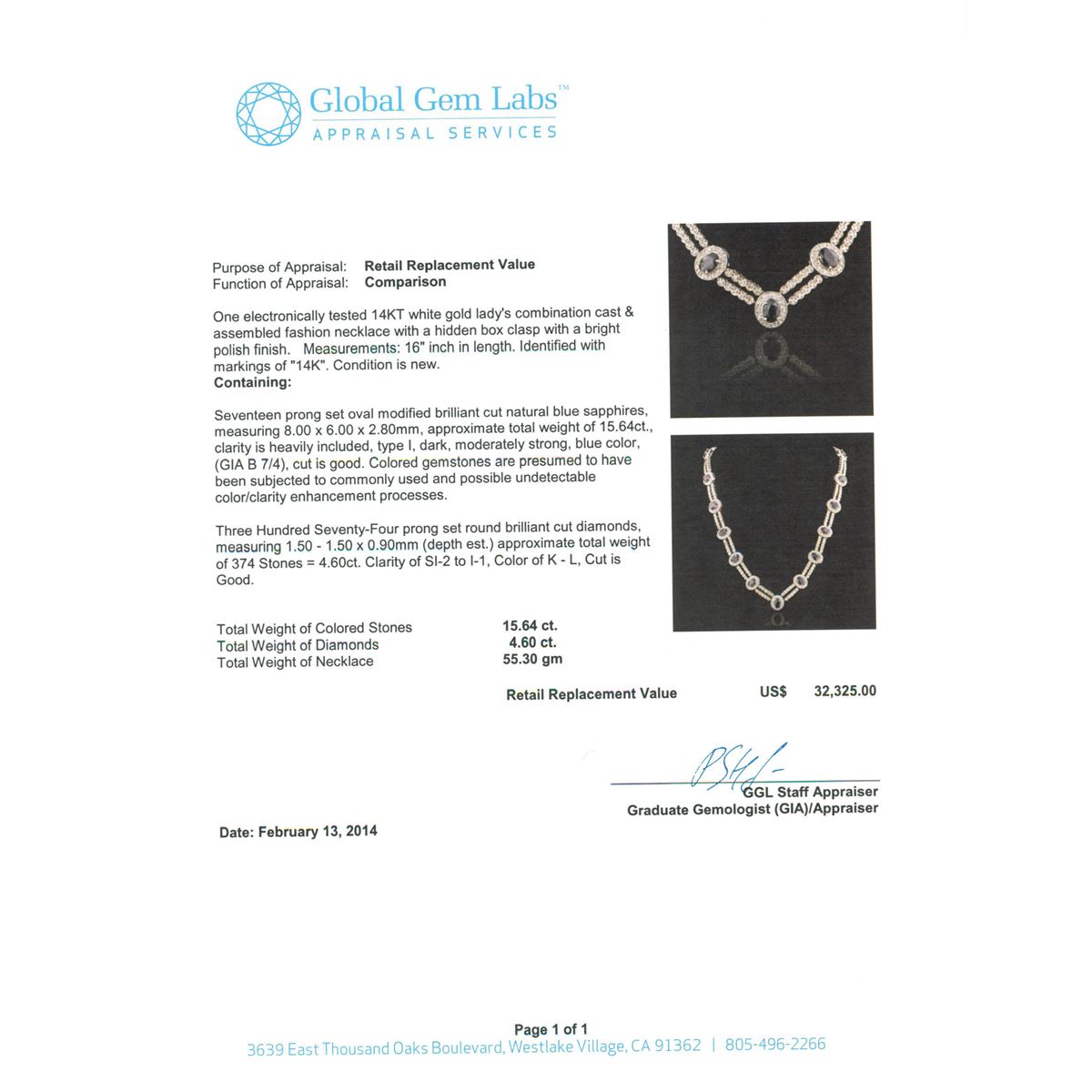 One electronically tested 14KT White Gold Ladies combination cast & assembled fashion necklace with a hidden box clasp with a bright polish finish. Condition is new. Measurements: 16" inch in length. Identified with markings of "14K". Containing: Seventeen prong set oval modified brilliant cut natural blue sapphires, measuring 8.00 x 6.00 x 2.80mm, approximate total weight of 15.64ct., clarity is heavily included, type I, dark, moderately strong, blue color, (GIA B 7/4), cut is good. Colored gemstones are presumed to have been subjected to commonly used and possible undetectable color/clarity enhancement processes. Three Hundred Seventy-Four prong set round brilliant cut diamonds, measuring 1.50 - 1.50 x 0.90mm (depth est.) approximate total weight of 374 Stones = 4.60ct. Clarity of SI-2 to I-1, Color of K - L, Cut is Good. Total Weight of Colored Stones 15.64ct. Total Weight of Diamonds 4.60ct. Total Weight of Necklace 55.30gm. GGL Appraised at $32,325.00.