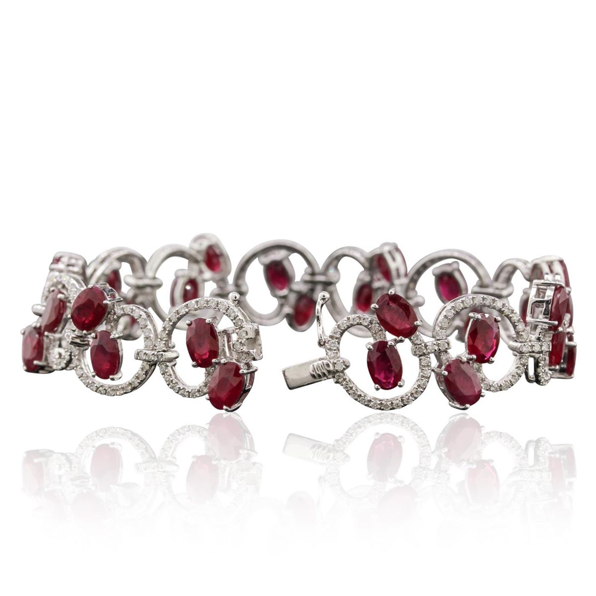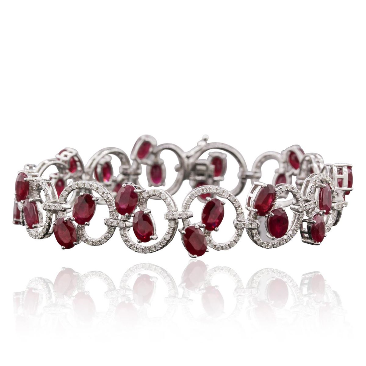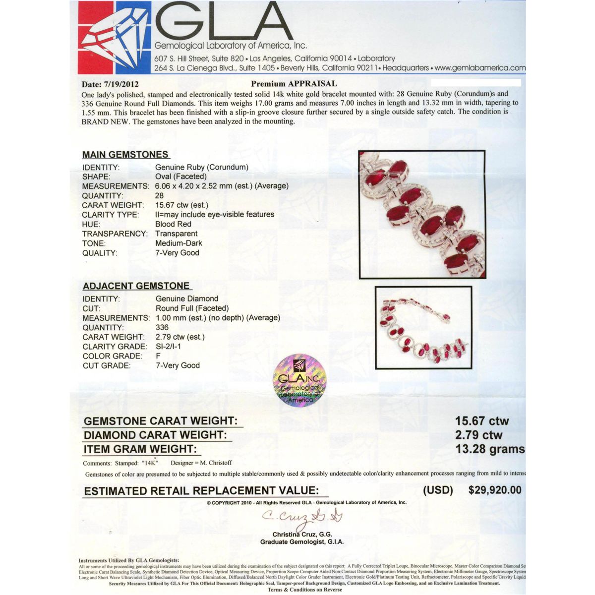 One Ladies polished, stamped and electronically tested solid 14KT white gold bracelet mounted with 28 genuine ruby (corundum)s and 336 genuine round full diamonds. This item weighs 17.00 grams and measures 7.00 inches in length and 13.32mm in width, tapering to 1.55mm. This bracelet has been finished with a slip-in groove closure further secured by a single outside safety catch. The condition is brand new. The gemstone have been analyzed in the mounting. Main gemstones identity genuine ruby (corundum). Shape oval (faceted). Measurements 6.06 x 4.20 x 2.52mm (est) (average). Quantity 28. Carat weight 15.67ctw (est). Clarity type II-may include eye visible features. Hue blood red. Transparency transparent. Tone medium dark. Quality 7 very good. Adjacent gemstone identity genuine diamond. Cut round full (faceted). Measurements 1.00mm (est) (no depth) (Average). Quantity 336. Carat weight 2.79ctw (est). Clarity grade SI-2/I-1. Color grade F. Cut grade 7 - very good. Gemstone carat weight 15.67ctw. Diamond carat weight 2.79ctw. Item gram weight 13.28 grams. GLA Appraised at $29,920.00.
