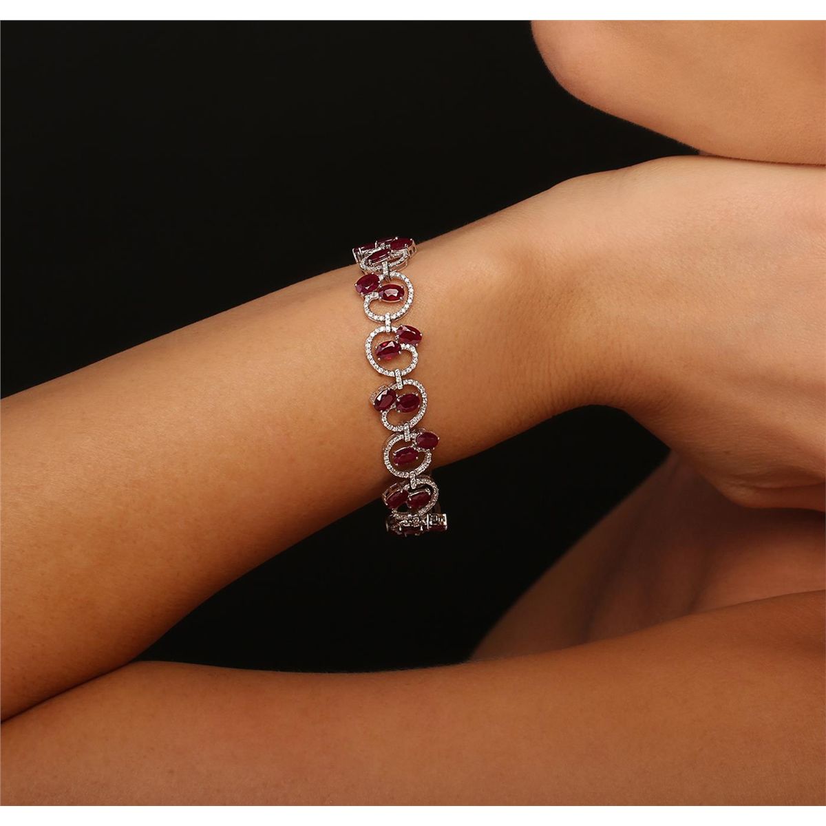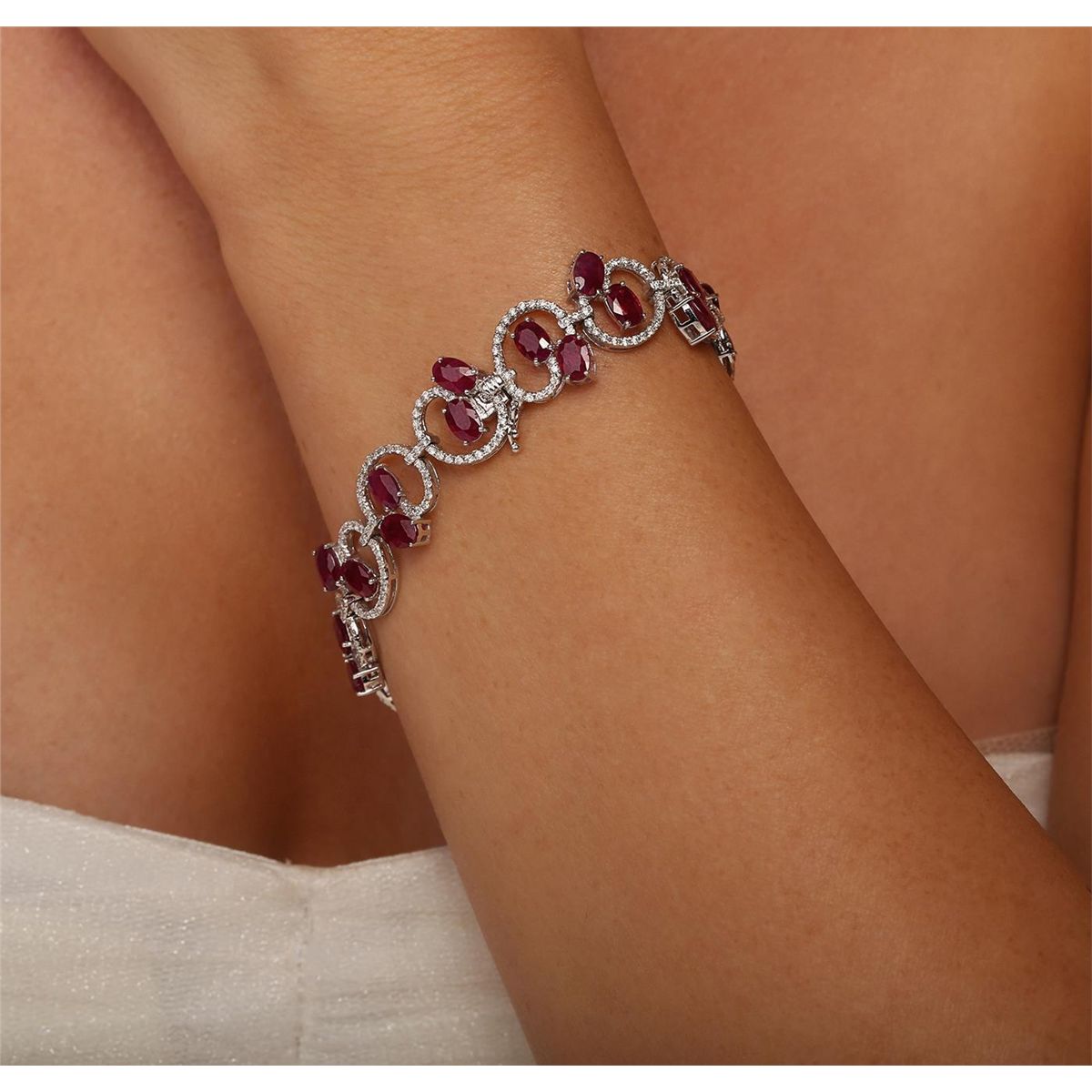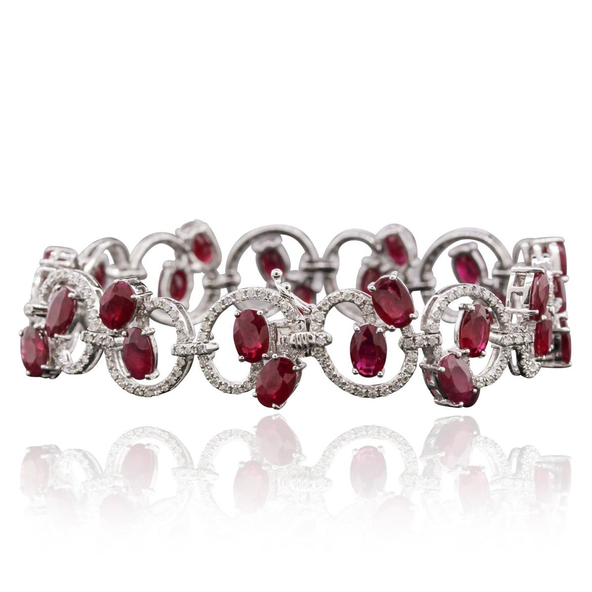 One Ladies polished, stamped and electronically tested solid 14KT white gold bracelet mounted with 28 genuine ruby (corundum)s and 336 genuine round full diamonds. This item weighs 17.00 grams and measures 7.00 inches in length and 13.32mm in width, tapering to 1.55mm. This bracelet has been finished with a slip-in groove closure further secured by a single outside safety catch. The condition is brand new. The gemstone have been analyzed in the mounting. Main gemstones identity genuine ruby (corundum). Shape oval (faceted). Measurements 6.06 x 4.20 x 2.52mm (est) (average). Quantity 28. Carat weight 15.67ctw (est). Clarity type II-may include eye visible features. Hue blood red. Transparency transparent. Tone medium dark. Quality 7 very good. Adjacent gemstone identity genuine diamond. Cut round full (faceted). Measurements 1.00mm (est) (no depth) (Average). Quantity 336. Carat weight 2.79ctw (est). Clarity grade SI-2/I-1. Color grade F. Cut grade 7 - very good. Gemstone carat weight 15.67ctw. Diamond carat weight 2.79ctw. Item gram weight 13.28 grams. GLA Appraised at $29,920.00.