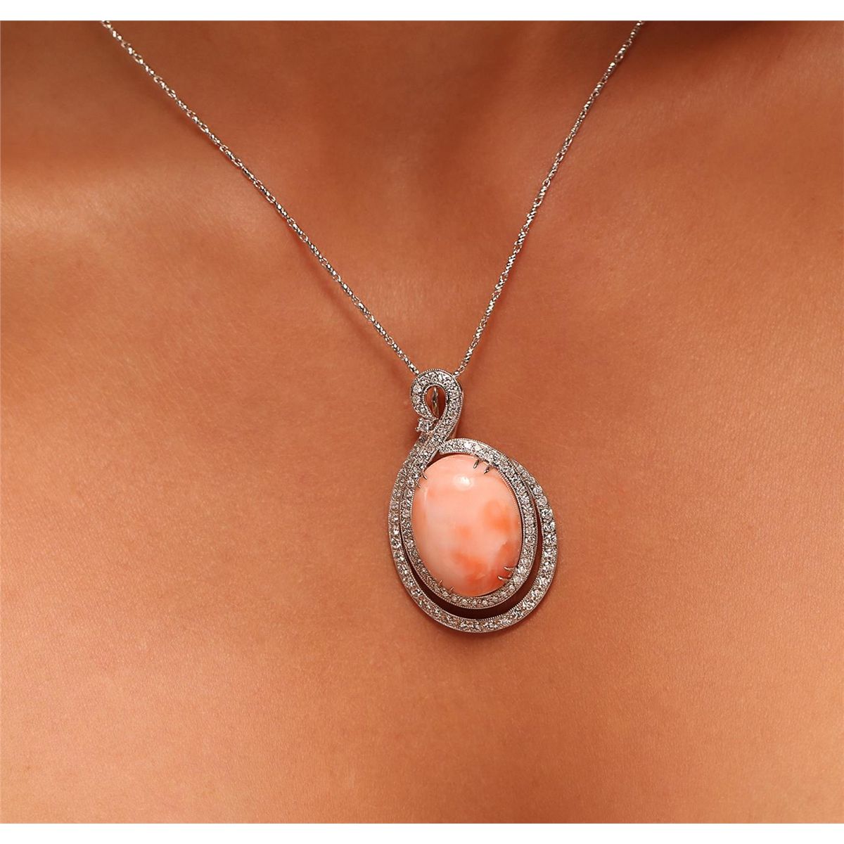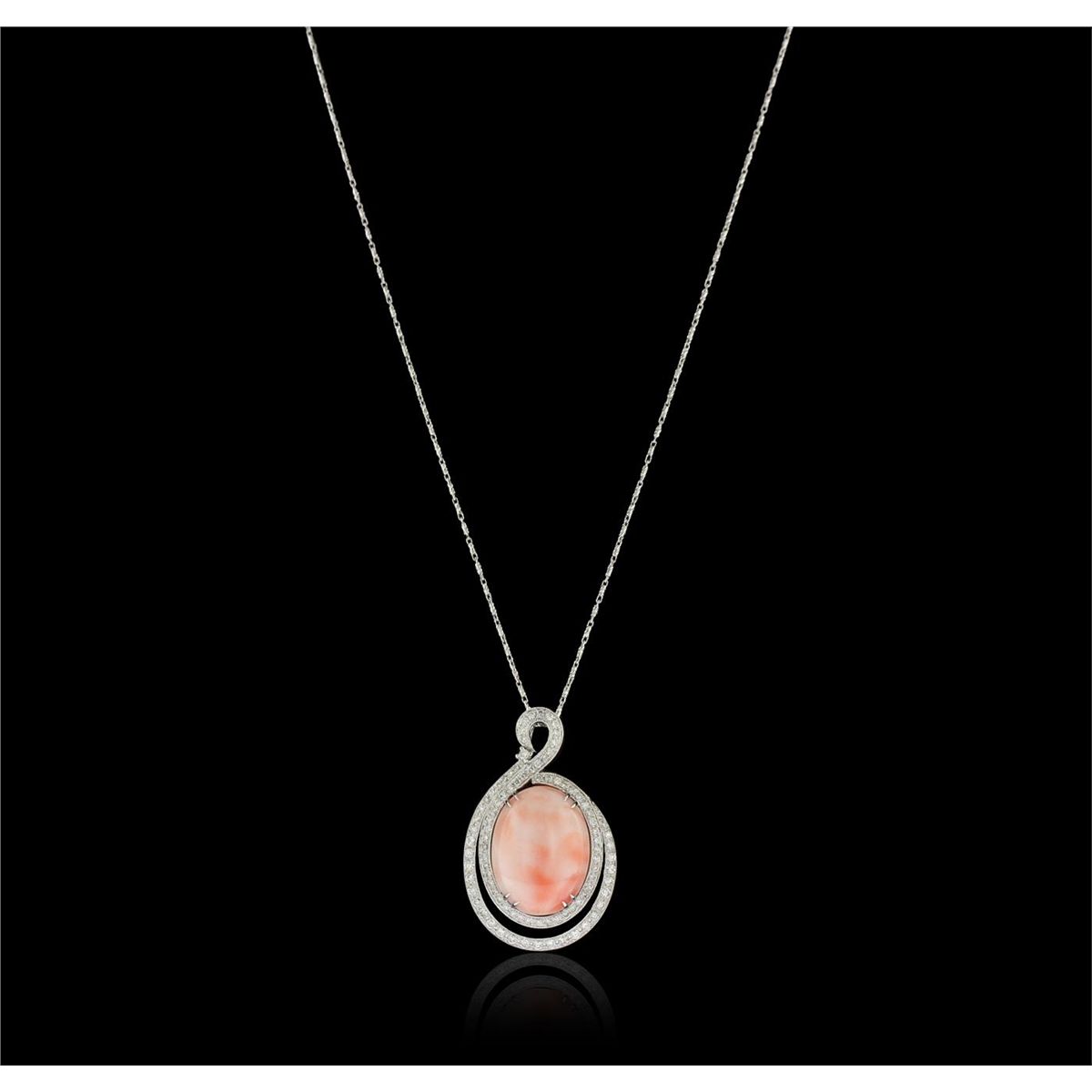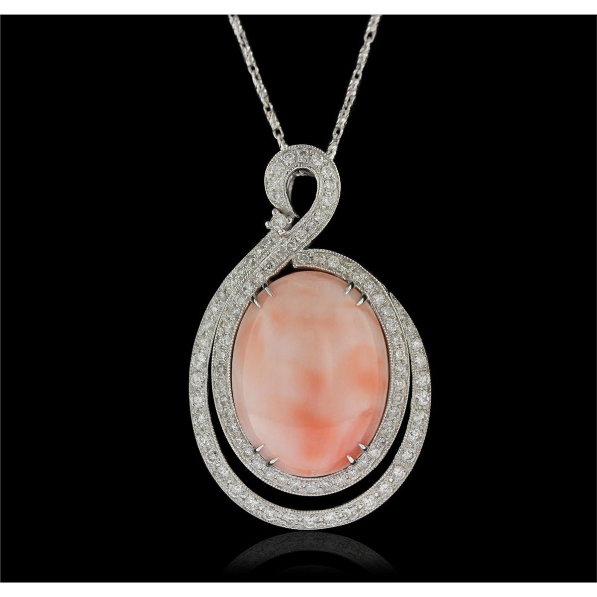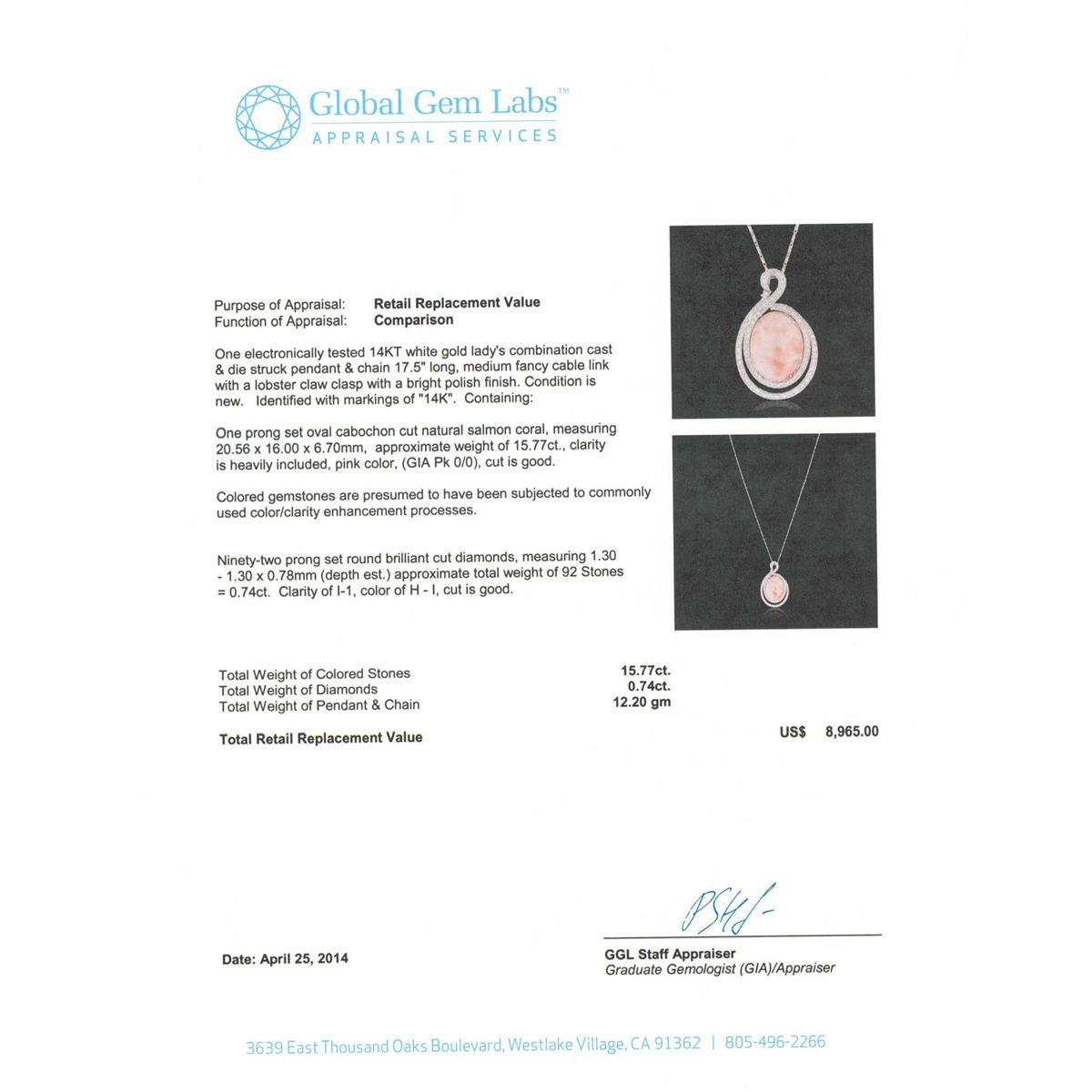 One electronically tested 14KT white gold Ladies combination cast & die struck pendant & chain 17.5" long, medium fancy cable link with a lobster claw clasp with a bright polish finish. Condition is new. Identified with markings of "14K". Containing: One prong set oval cabochon cut natural salmon coral, measuring 20.56 x 16.00 x 6.70mm, approximate weight of 15.77ct., clarity is heavily included, pink color, (GIA Pk 0/0), cut is good. Colored gemstones are presumed to have been subjected to commonly used color/clarity enhancement processes. Ninety-Two prong set round brilliant cut diamonds, measuring 1.30 - 1.30 x 0.78mm (depth est.) approximate. Total Weight of 92 Stones = 0.74ct. Clarity: I-1. Color: H - I, Cut is Good. Total Weight of Colored Stones 15.77ct. Total Weight of Diamonds 0.74ct. Total Weight of Pendant & Chain 12.20 grams. GGL Appraised at $8,965.00.
