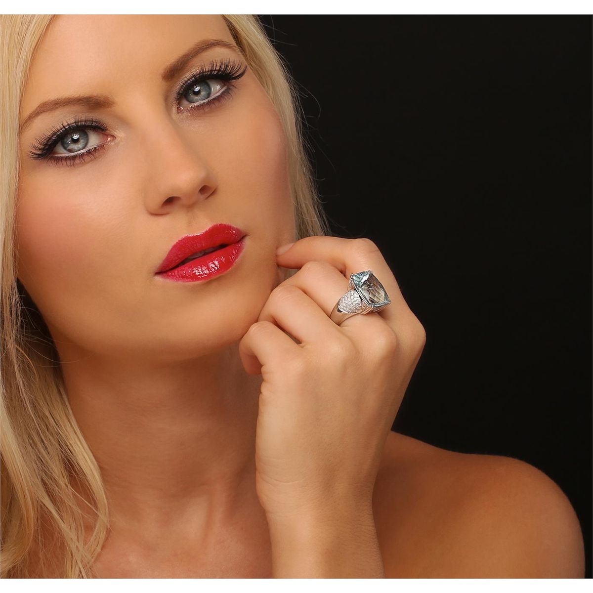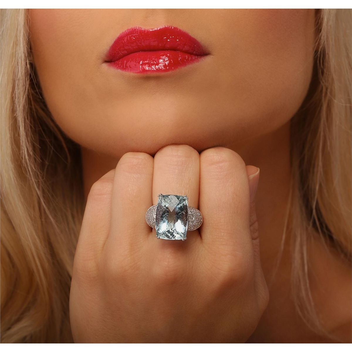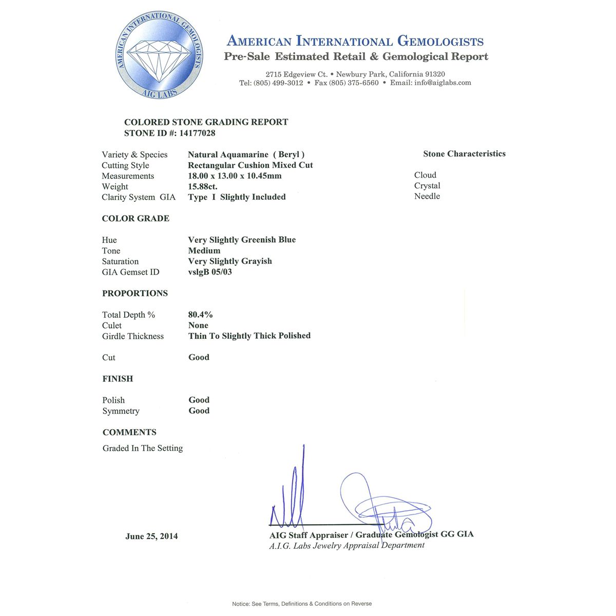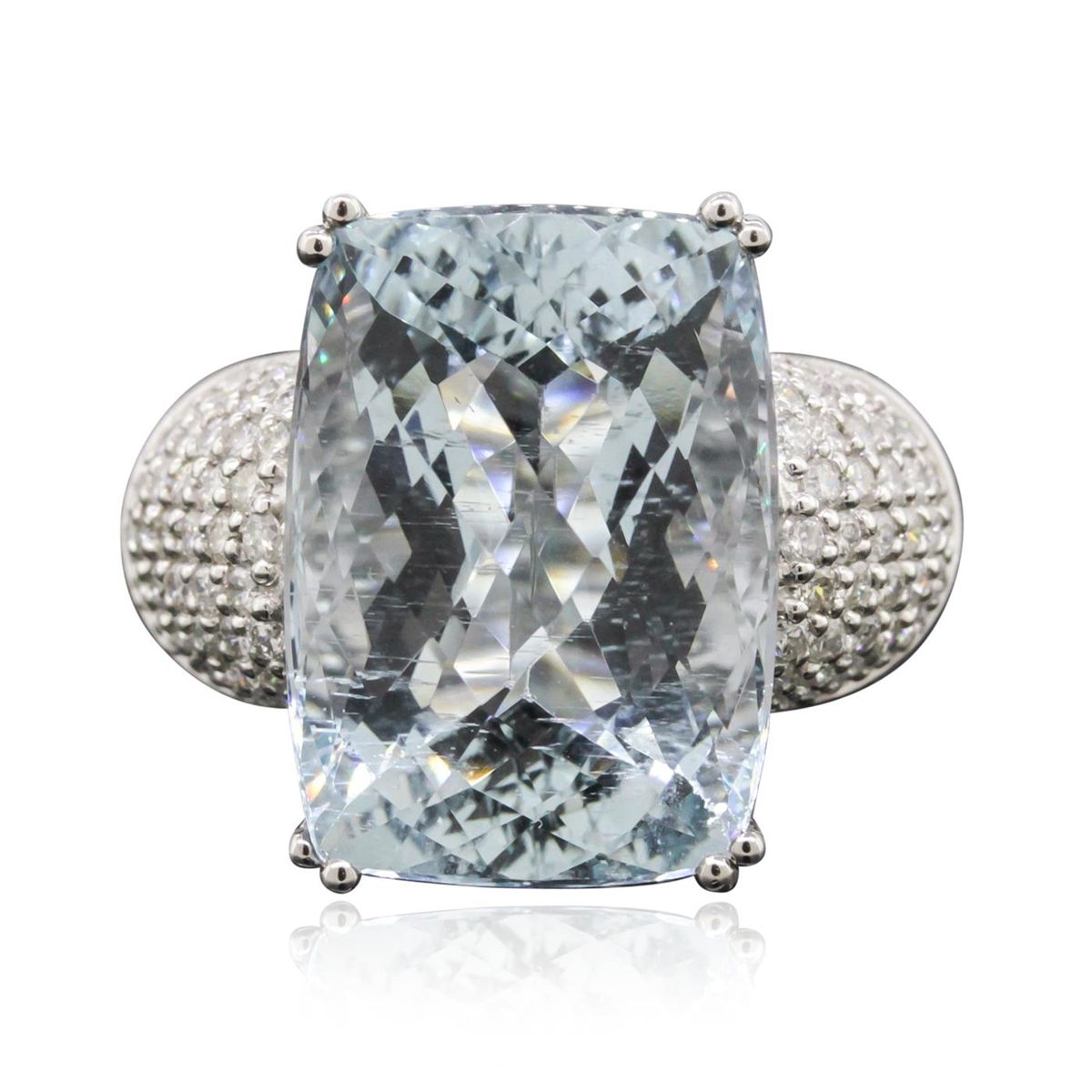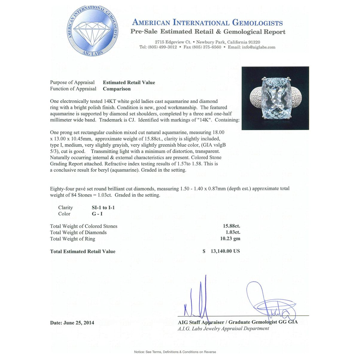 One electronically tested 14KT white gold ladies cast aquamarine and diamond ring with a bright polish finish. Condition is new, good workmanship. The featured aquamarine is supported by diamond set shoulders, completed by a three and one-half millimeter wide band. Trademark is CJ. Identified with markings of "14K". Containing: One prong set rectangular cushion mixed cut natural aquamarine, measuring 18.00 x 13.00 x 10.45mm, approximate weight of 15.88ct., clarity is slightly included, type I, medium, very slightly grayish, very slightly greenish blue color, (GIA vslgB 5/3), cut is good. Transmitting light with a minimum of distortion, transparent. Naturally occurring internal & external characteristics are present. Colored Stone Grading Report attached. Refractive index testing results of 1.57to 1.58. This is a conclusive result for beryl (aquamarine). Graded in the setting. Eighty-Four pave set round brilliant cut diamonds, measuring 1.50 - 1.40 x 0.87mm (depth est.) approximate total weight of 84 Stones = 1.03ct. Graded in the setting. Clarity SI-1 to I-1. Color G - I. Total Weight of Colored Stones 15.88 ct. Total Weight of Diamonds 1.03 ct. Total Weight of Ring 10.23 grams. AIG Appraised at $13,140.00.