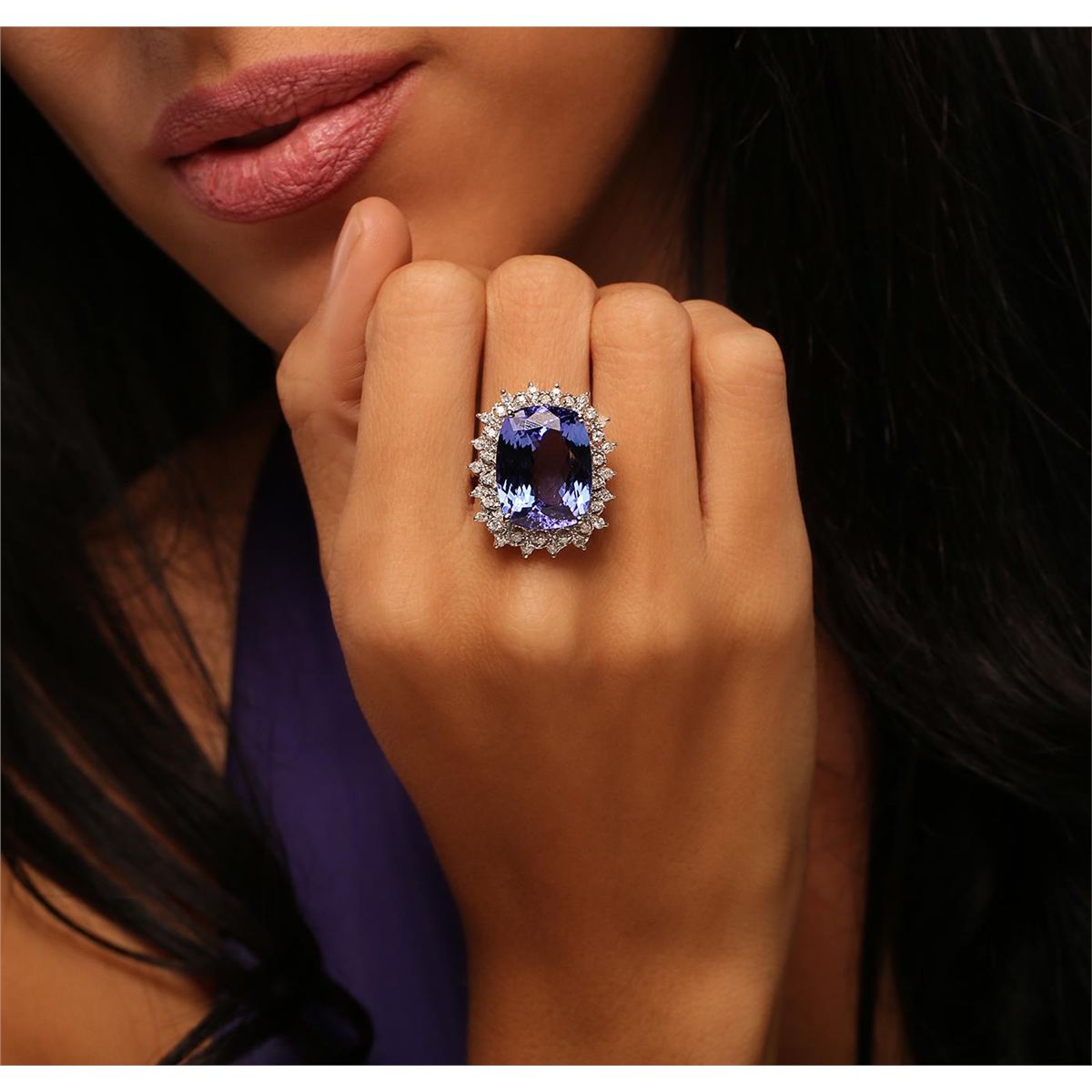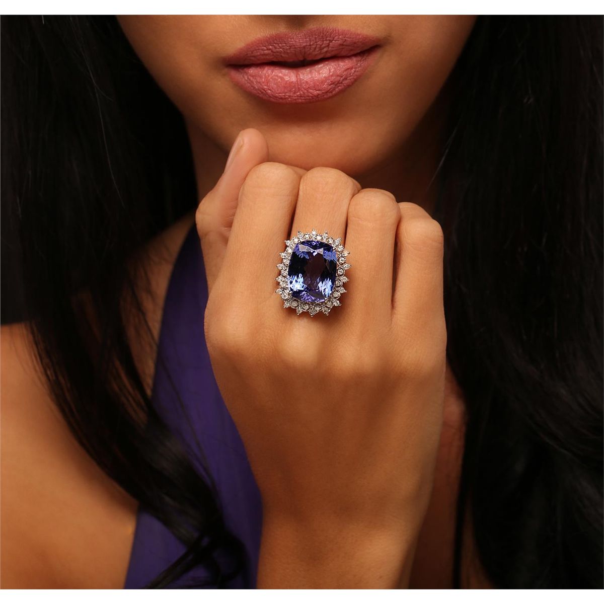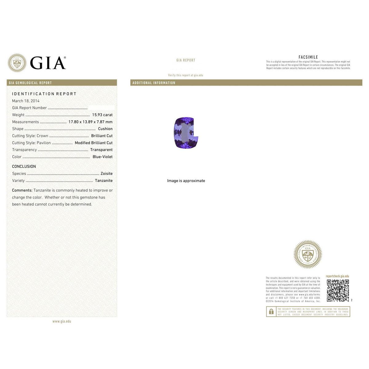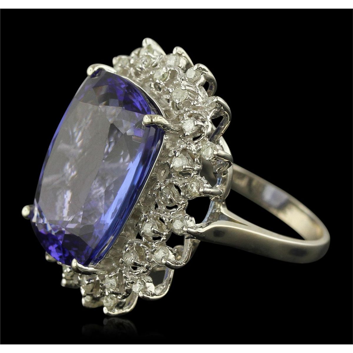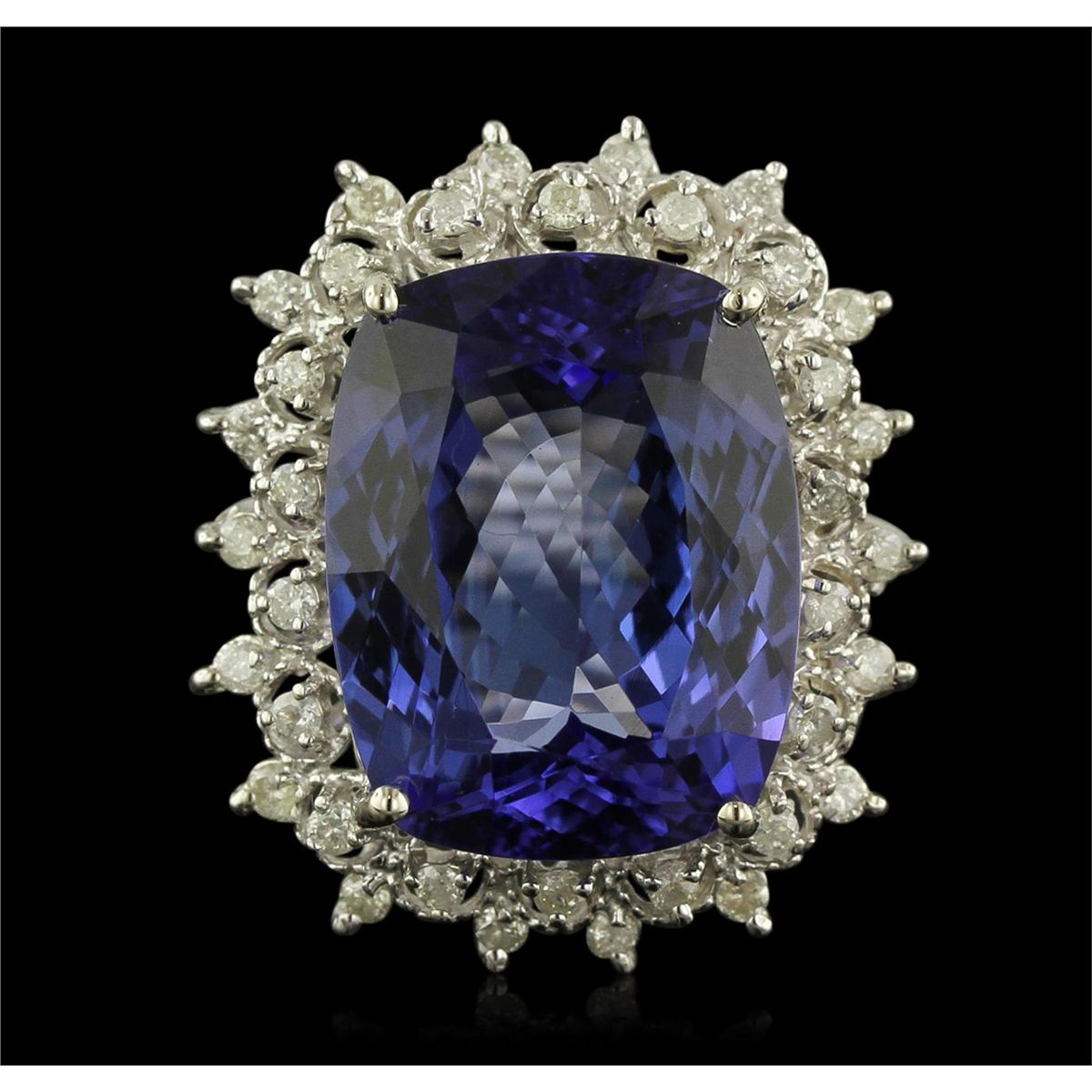 One electronically tested 14KT white gold Ladies combination cast & assembled fancy ring with a high polish finish. Condition is new. Identified with markings of "14K". Containing: Thirty-Six prong set round brilliant cut diamonds, measuring 1.40 - 1.40 x 0.84mm (depth est.) approximate. Total Weight of 36 Stones = 0.57ct. Clarity: I-1 to I-2. Color: H - I, Cut is Good. One prong set rectangular cushion modified brilliant cut natural tanzanite, measuring 17.80 x 13.89 x 7.87mm, exact weight 15.93ct., clarity is eye clean, type I, medium light, moderately strong, bluish violet color, (GIA bV 4/4), cut is excellent. GIA Report: 6157962504.Total Weight of Colored Stones 15.93ct. Total Weight of Diamonds 0.57ct. Total Weight of Ring 9.10 grams. GGL Appraised at $24,710.00.