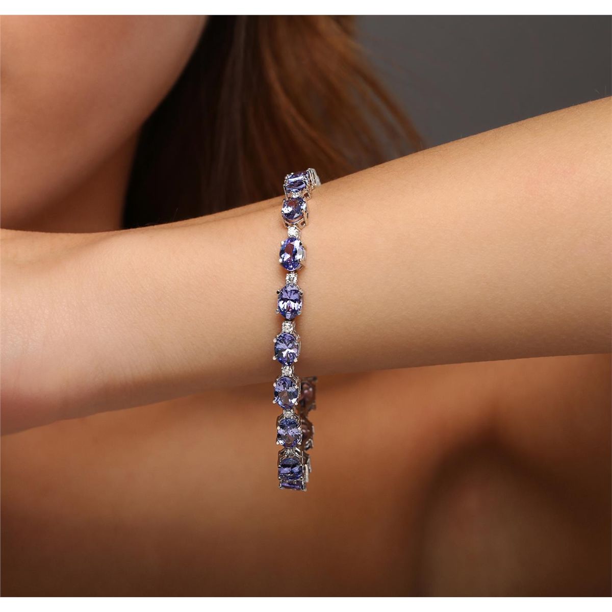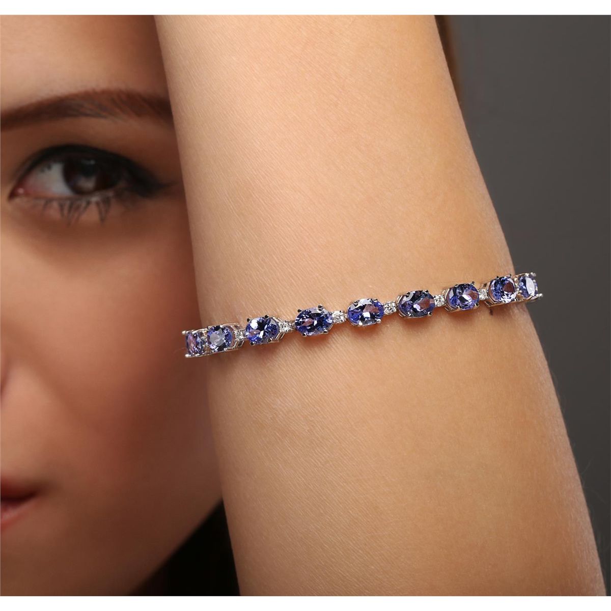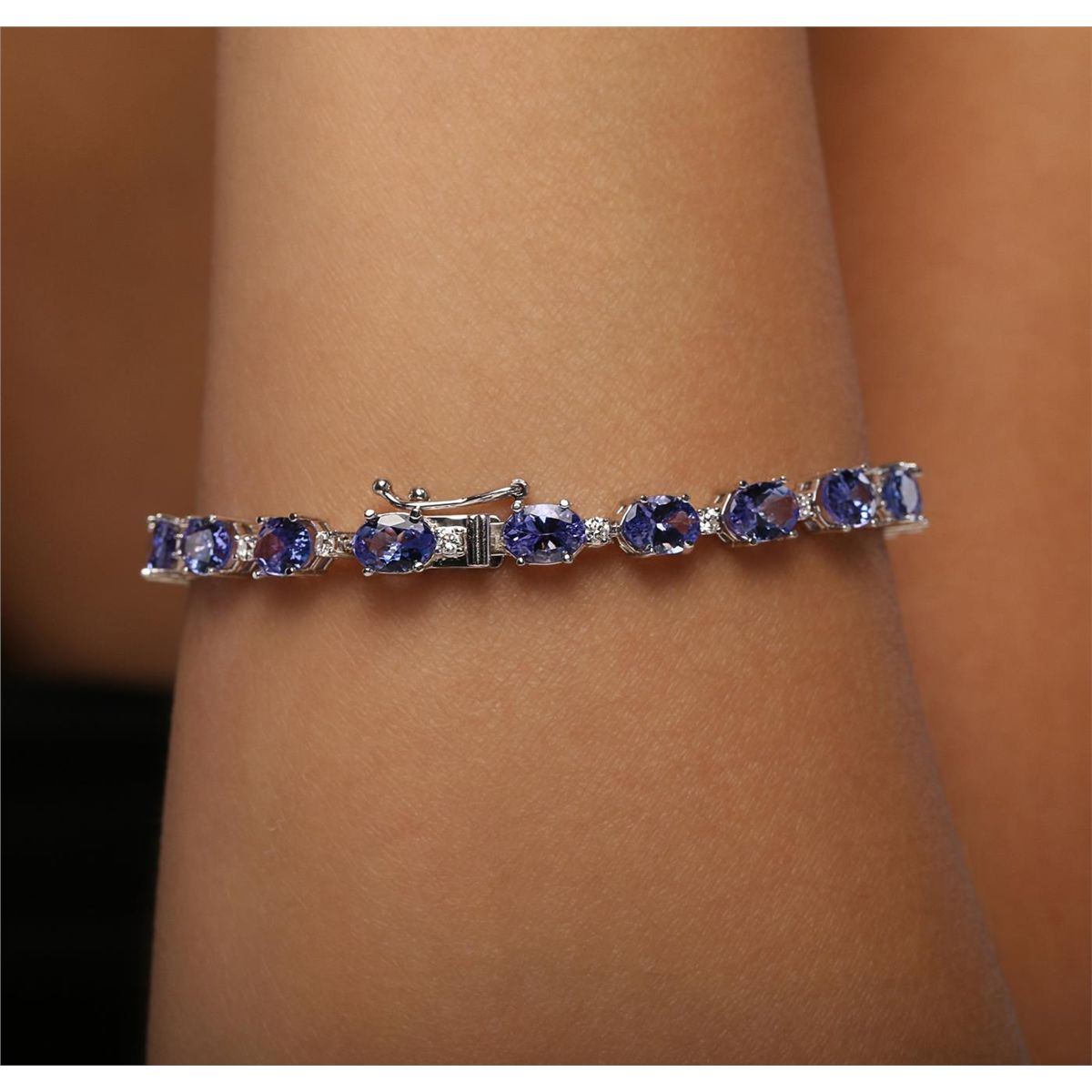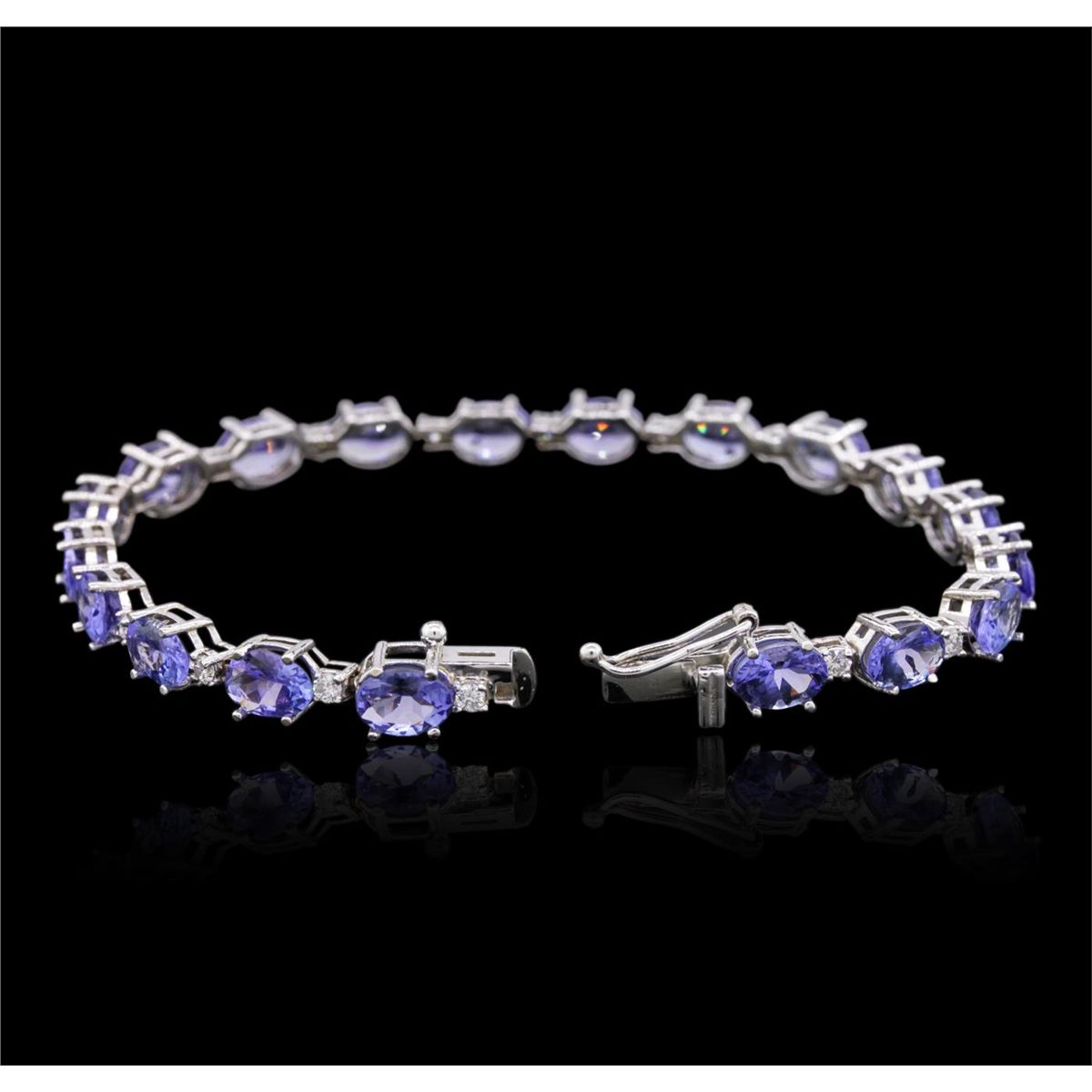 One electronically tested 14KT white gold ladies combination cast & assembled tanzanite and diamond bracelet with a hidden box clasp with a bright polish finish. Measurements: 7" in length. Condition is new. Containing: Nineteen prong set oval modified brilliant cut natural tanzanites, measuring 7.00 x 5.00 x 3.50mm, approximate total weight of 15.96ct., clarity is eye clean, type I, medium, moderately strong, violet color, (GIA V 5/4), cut is good. Nineteen prong set round brilliant cut diamonds, measuring 2.00 - 2.00 x 1.20mm (depth est.) approximate total weight of 19 Stones = 0.56ct. Clarity: SI-2 to I-1. Color: J - K, Cut is Good. Colored gemstones are presumed to have been subjected to commonly used enhancement processes. All diamonds and colored gemstones are graded in the mounting, unless otherwise stated. Total Weight of Colored Stones 15.96ct. Total Weight of Diamonds 0.56ct. Total Weight of Bracelet 11.90 grams. GGL Appraised at $12,555.00.