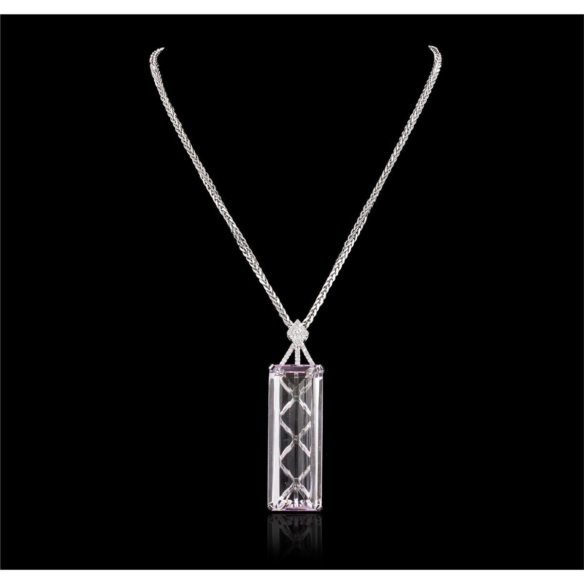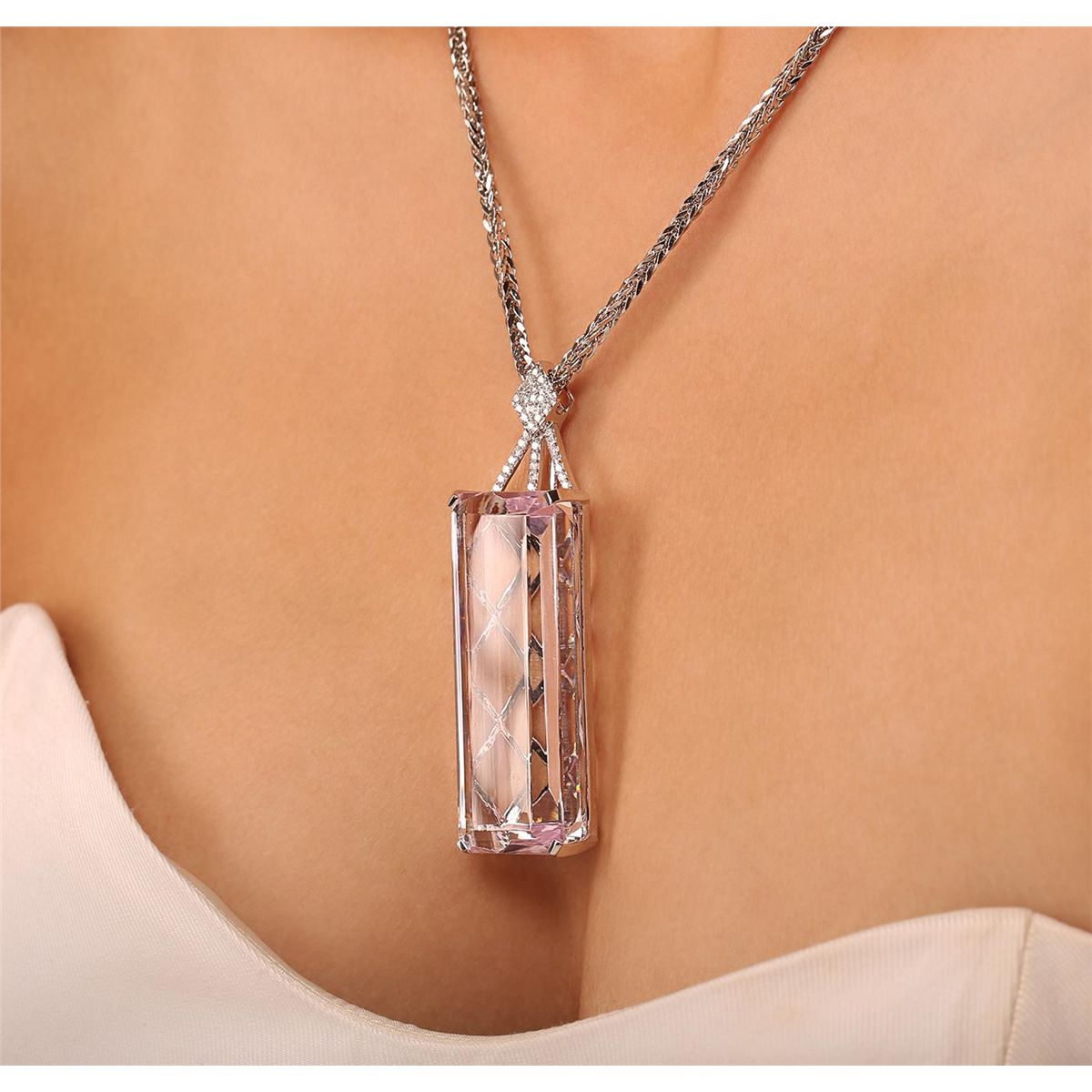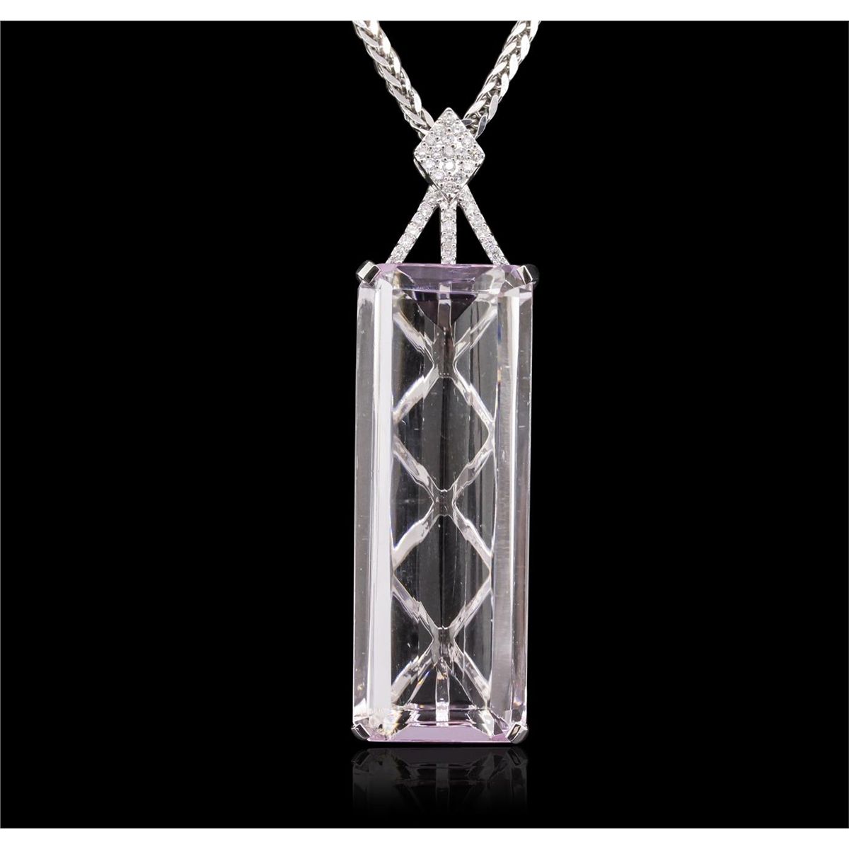 One electronically tested 14KT white gold ladies cast & assembled kunzite and diamond pendant with chain. Condition is new, good workmanship. The pendant features a kunzite set within a lattice basket, completed by a diamond set bail. The pendant is supported by an eighteen inch length 14KT white gold designer style chain, terminating in a lobster claw clasp. Bright polish finish. Identified with markings of "14K". Containing: One prong set rectangular step cut natural kunzite, measuring 56.00 x 21.00 x 13.10mm, 6%. bulge factor, approximate weight of 155.79ct., clarity is eye clean, type I, medium light, very slightly grayish, reddish purple color, (GIA rP 4/3), cut is good. Transmitting light with no distortion, transparent. Colored Stone Grading Report attached. Graded in the setting. Thirty-Six prong set round brilliant cut diamonds, measuring 1.70 - 1.60 x 0.99mm (depth est.) approximate. Total Weight of 36 Stones = 0.69ct. Graded in the setting. Clarity: SI-1 to I-1. Color: F - H. Total Weight of Colored Stones155.79ct. Total Weight of Diamonds 0.69ct. Total Weight of Pendant With Chain 52.41 grams. AIG Appraised at $37,015.00.