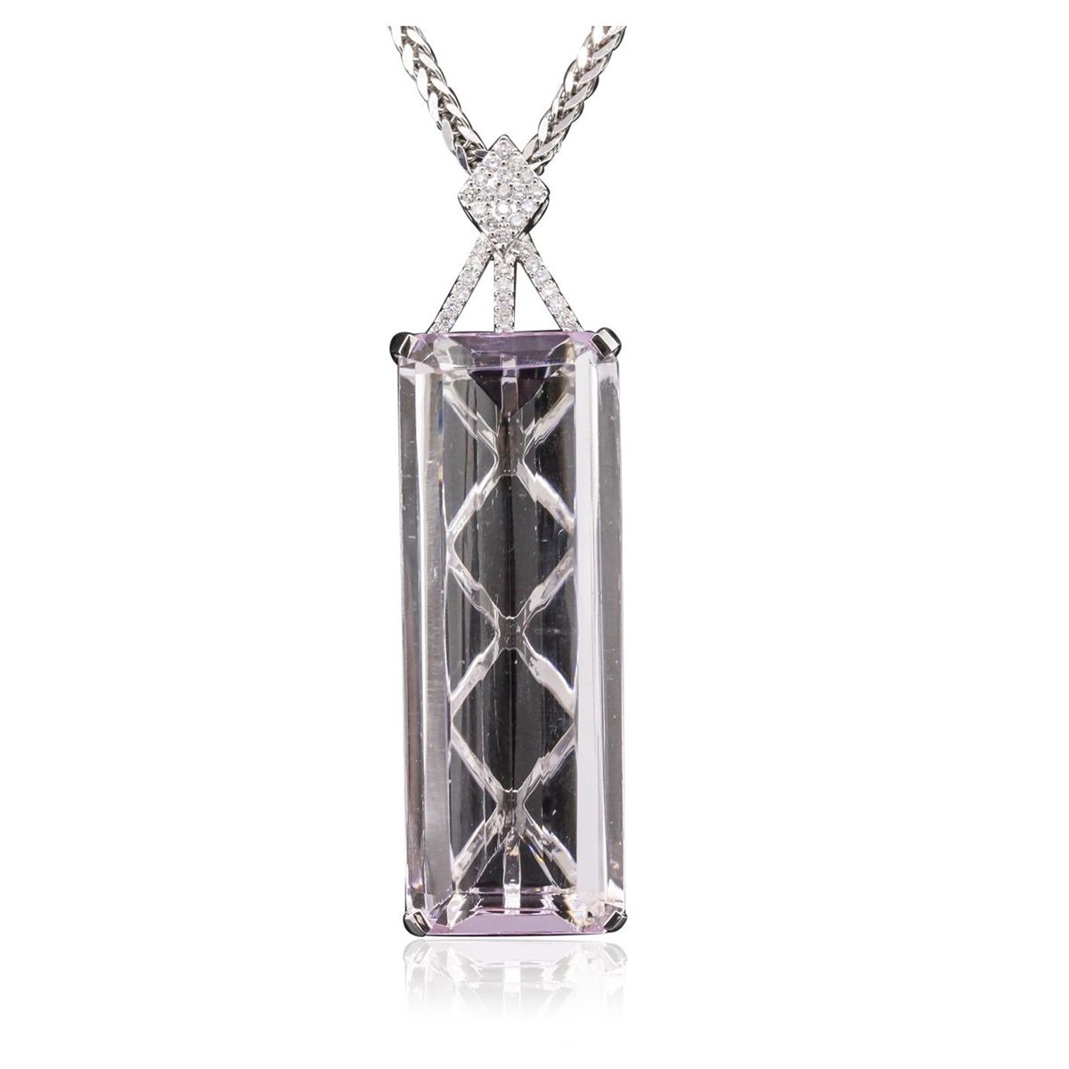 One electronically tested 14KT white gold ladies cast & assembled kunzite and diamond pendant with chain. Condition is new, good workmanship. The pendant features a kunzite set within a lattice basket, completed by a diamond set bail. The pendant is supported by an eighteen inch length 14KT white gold designer style chain, terminating in a lobster claw clasp. Bright polish finish. Identified with markings of "14K". Containing: One prong set rectangular step cut natural kunzite, measuring 56.00 x 21.00 x 13.10mm, 6%. bulge factor, approximate weight of 155.79ct., clarity is eye clean, type I, medium light, very slightly grayish, reddish purple color, (GIA rP 4/3), cut is good. Transmitting light with no distortion, transparent. Colored Stone Grading Report attached. Graded in the setting. Thirty-Six prong set round brilliant cut diamonds, measuring 1.70 - 1.60 x 0.99mm (depth est.) approximate. Total Weight of 36 Stones = 0.69ct. Graded in the setting. Clarity: SI-1 to I-1. Color: F - H. Total Weight of Colored Stones155.79ct. Total Weight of Diamonds 0.69ct. Total Weight of Pendant With Chain 52.41 grams. AIG Appraised at $37,015.00.
