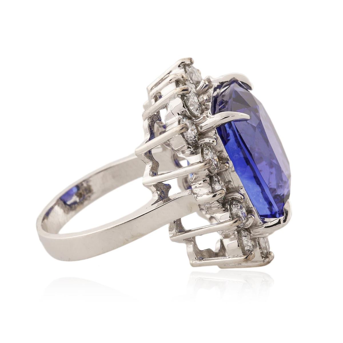 One electronically tested 14KT white gold ladies cast tanzanite and diamond ring with a bright polish finish. Condition is new, good workmanship. The featured tanzanite is set within a diamond bezel, completed by a three millimeter wide band. Identified with markings of "K14". Containing: One prong set cushion modified brilliant cut natural tanzanite, measuring 14.80 x 12.74 x 10.36mm, exact weight 16.04ct., clarity is eye clean, type I, medium dark, very slightly grayish, violetish blue color, (GIA vB 6/3), cut is good. Transmitting light with no distortion, transparent. GIA Colored Stone Grading Report attached. Graded loose prior to setting in the GIA Laboratory, Report #2151735658.Tanzanite is a very rare gemstone that is only found in the country of Tanzania. Originally discovered in 1967. Tiffany & Company, named the stone Tanzanite. It is found in the Usumburu Mountains that border the Umba Valley of northern Tanzania. Tanzanite occurs in gray, brown, violet, blue, reddish-purple, & green. The gem is interesting because of its exceptional pleochroism. Rotated in different directions a tanzanite will exhibit multiple changes of color. Tanzanite has a low tolerance to ultrasonic cleaning, and should not be cleaned using this method. Sixteen prong set round brilliant cut diamonds, measuring 3.40 - 3.30 x 2.01mm (depth est.) approximate. Total Weight of 16 Stones = 2.37ct. Graded in the setting. Clarity: I-1 to I-2. Color: G - I. Total Weight of Colored Stones 16.04ct. Total Weight of Diamonds 2.37ct. Total Weight of Ring 11.40 grams. AIG Appraised at $46,825.00.