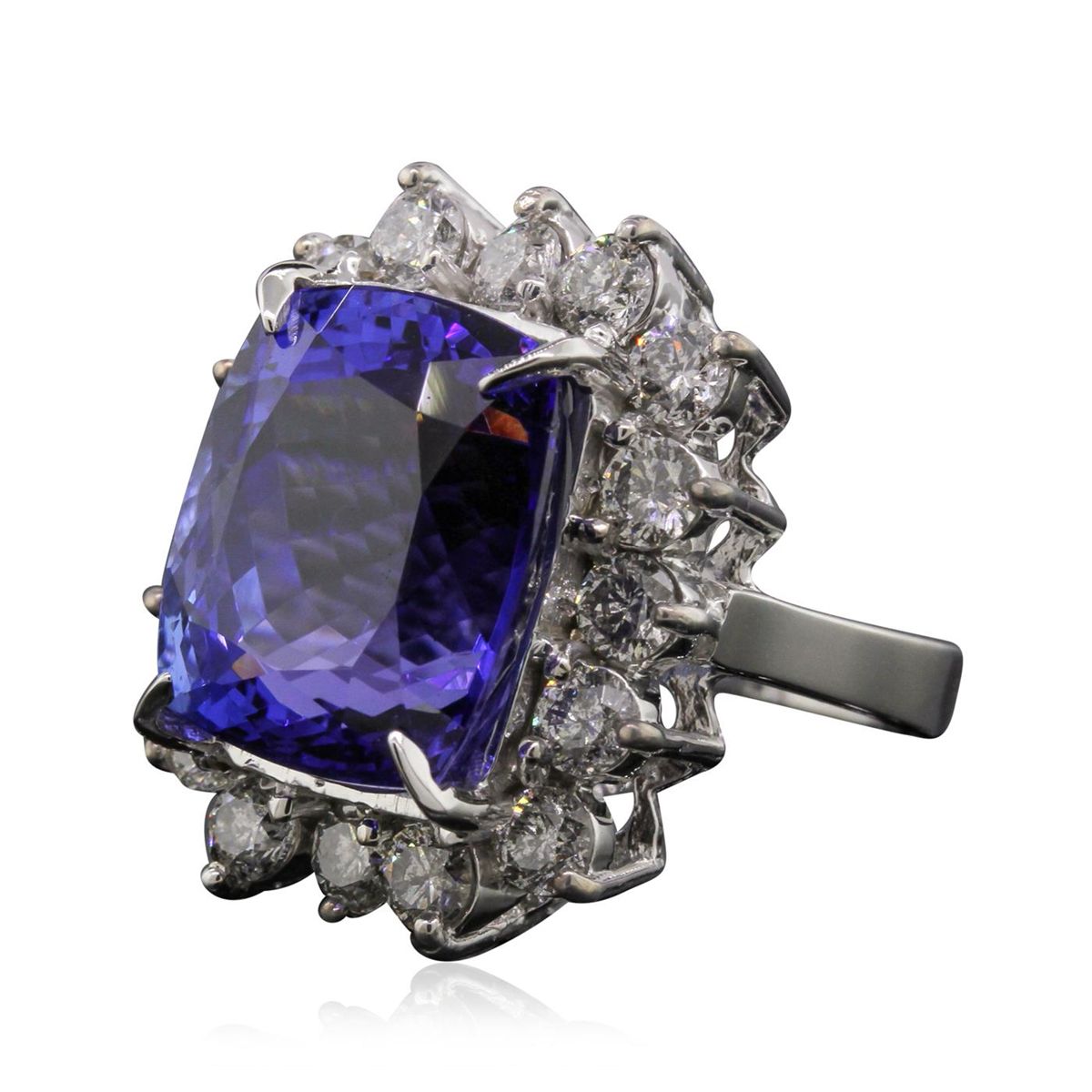 One electronically tested 14KT white gold ladies cast tanzanite and diamond ring with a bright polish finish. Condition is new, good workmanship. The featured tanzanite is set within a diamond bezel, completed by a three millimeter wide band. Identified with markings of "K14". Containing: One prong set cushion modified brilliant cut natural tanzanite, measuring 14.80 x 12.74 x 10.36mm, exact weight 16.04ct., clarity is eye clean, type I, medium dark, very slightly grayish, violetish blue color, (GIA vB 6/3), cut is good. Transmitting light with no distortion, transparent. GIA Colored Stone Grading Report attached. Graded loose prior to setting in the GIA Laboratory, Report #2151735658.Tanzanite is a very rare gemstone that is only found in the country of Tanzania. Originally discovered in 1967. Tiffany & Company, named the stone Tanzanite. It is found in the Usumburu Mountains that border the Umba Valley of northern Tanzania. Tanzanite occurs in gray, brown, violet, blue, reddish-purple, & green. The gem is interesting because of its exceptional pleochroism. Rotated in different directions a tanzanite will exhibit multiple changes of color. Tanzanite has a low tolerance to ultrasonic cleaning, and should not be cleaned using this method. Sixteen prong set round brilliant cut diamonds, measuring 3.40 - 3.30 x 2.01mm (depth est.) approximate. Total Weight of 16 Stones = 2.37ct. Graded in the setting. Clarity: I-1 to I-2. Color: G - I. Total Weight of Colored Stones 16.04ct. Total Weight of Diamonds 2.37ct. Total Weight of Ring 11.40 grams. AIG Appraised at $46,825.00.