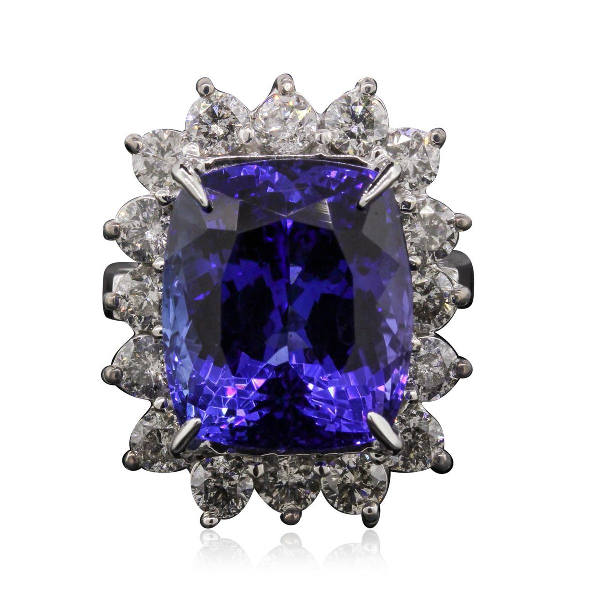 One electronically tested 14KT white gold ladies cast tanzanite and diamond ring with a bright polish finish. Condition is new, good workmanship. The featured tanzanite is set within a diamond bezel, completed by a three millimeter wide band. Identified with markings of "K14". Containing: One prong set cushion modified brilliant cut natural tanzanite, measuring 14.80 x 12.74 x 10.36mm, exact weight 16.04ct., clarity is eye clean, type I, medium dark, very slightly grayish, violetish blue color, (GIA vB 6/3), cut is good. Transmitting light with no distortion, transparent. GIA Colored Stone Grading Report attached. Graded loose prior to setting in the GIA Laboratory, Report #2151735658.Tanzanite is a very rare gemstone that is only found in the country of Tanzania. Originally discovered in 1967. Tiffany & Company, named the stone Tanzanite. It is found in the Usumburu Mountains that border the Umba Valley of northern Tanzania. Tanzanite occurs in gray, brown, violet, blue, reddish-purple, & green. The gem is interesting because of its exceptional pleochroism. Rotated in different directions a tanzanite will exhibit multiple changes of color. Tanzanite has a low tolerance to ultrasonic cleaning, and should not be cleaned using this method. Sixteen prong set round brilliant cut diamonds, measuring 3.40 - 3.30 x 2.01mm (depth est.) approximate. Total Weight of 16 Stones = 2.37ct. Graded in the setting. Clarity: I-1 to I-2. Color: G - I. Total Weight of Colored Stones 16.04ct. Total Weight of Diamonds 2.37ct. Total Weight of Ring 11.40 grams. AIG Appraised at $46,825.00.