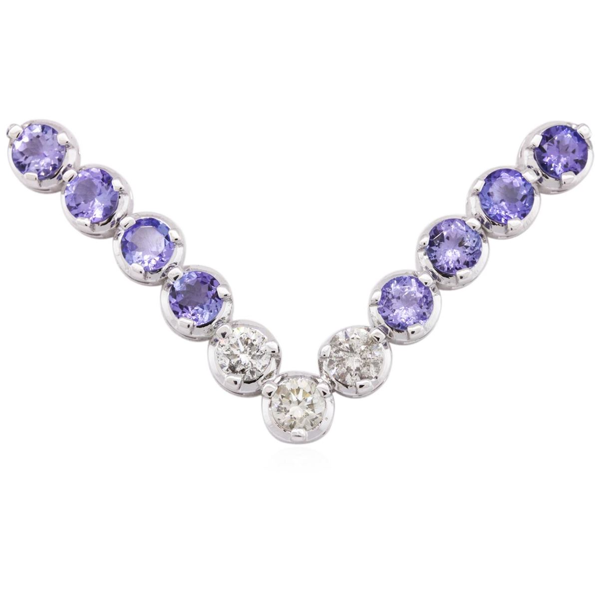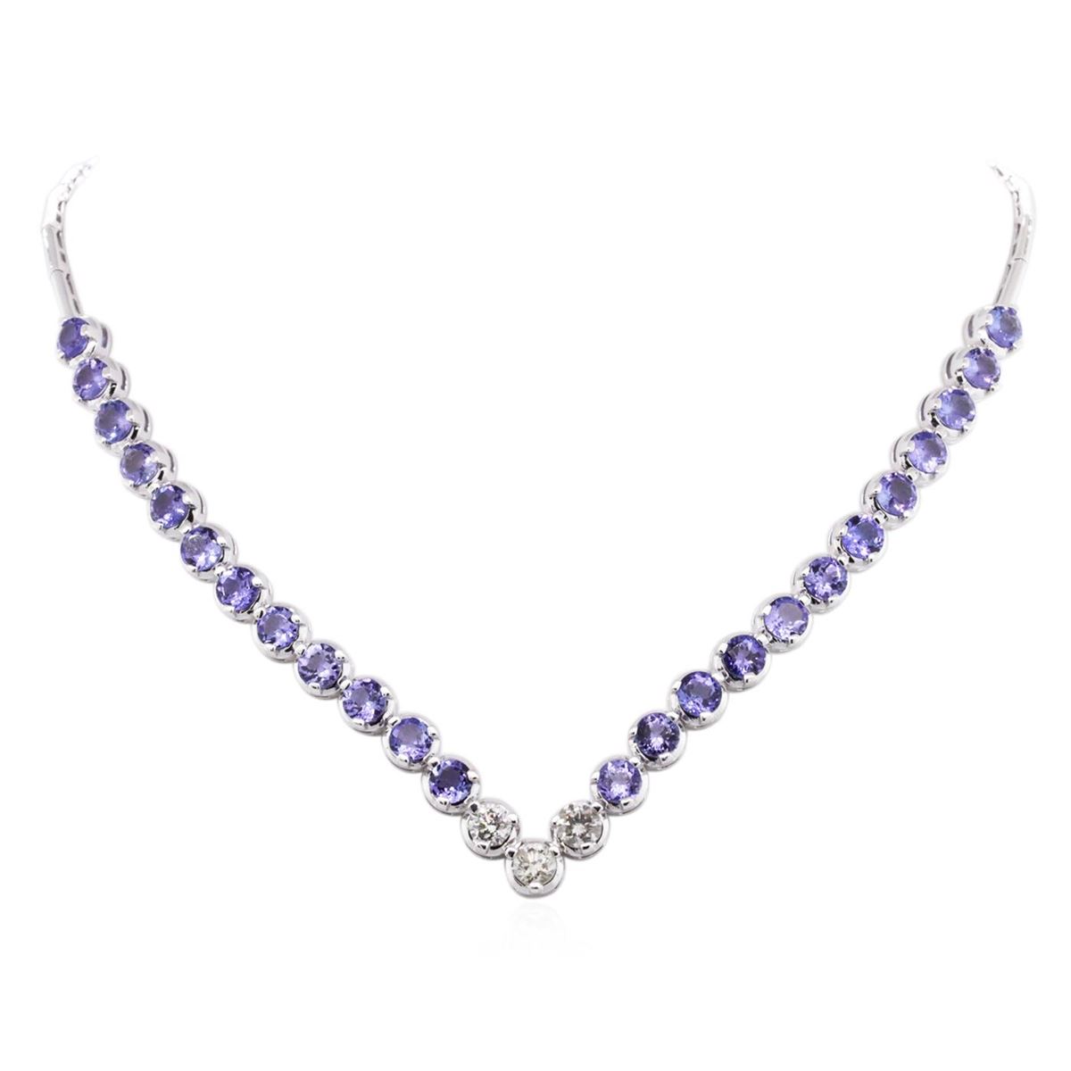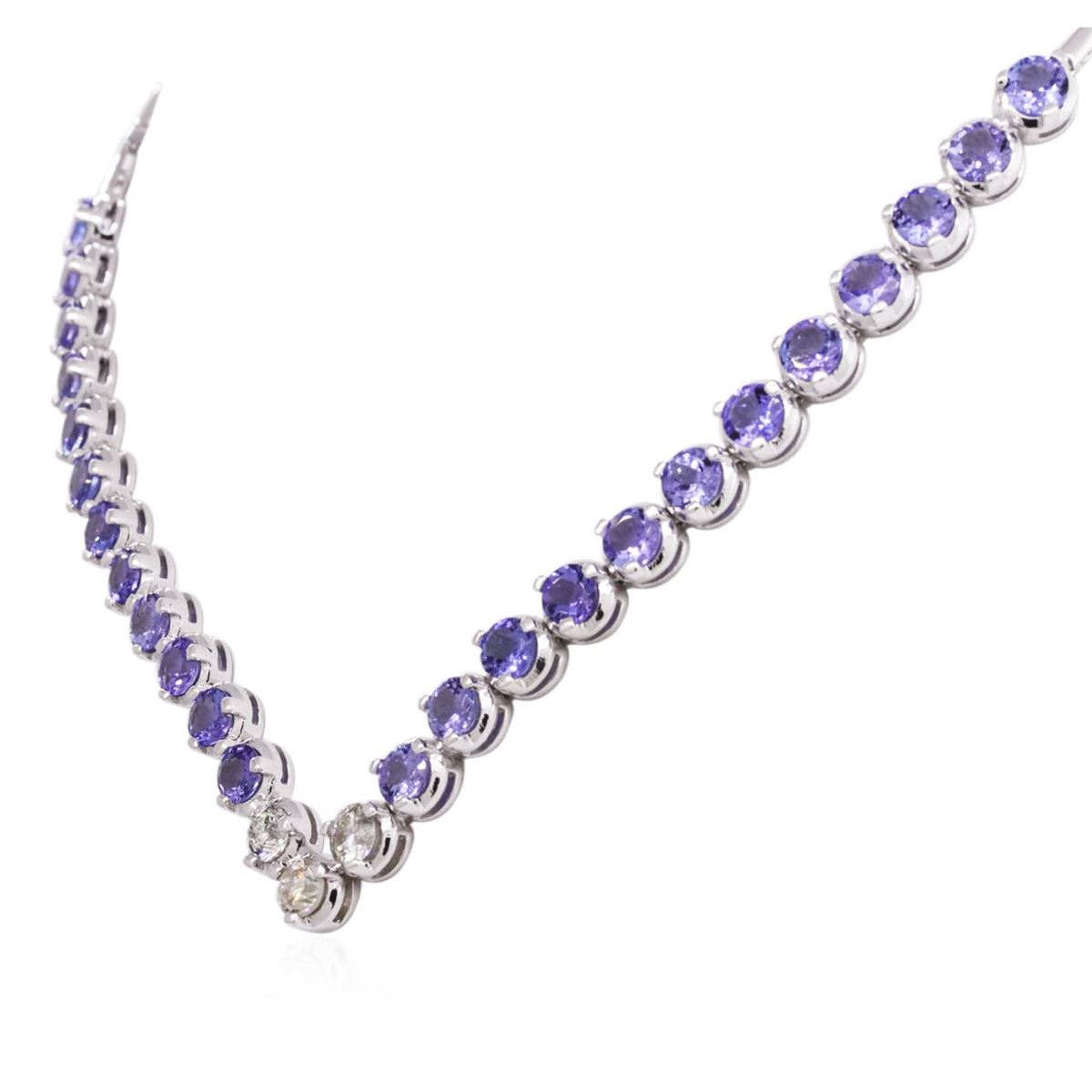 One electronically tested 14KT white gold ladies combination cast & assembled tanzanite and diamond necklace with a hidden box clasp with safety closer with a bright polish finish. Identified with markings of "14K". Condition is new. Containing: Twenty-four prong set round modified brilliant cut natural tanzanites, measuring 5.46 - 5.38 x 3.35 mm, approximate total weight of 16.08ct., clarity is eye clean, type I, medium light, very slightly grayish, violet color, (GIA V 4/3), cut is good. Three prong set round brilliant cut diamonds, measuring 5.50 - 5.15 x 3.20mm (depth est.) approximate total weight of 3 Stones = 1.66ct. Clarity: I-1 to I-2. Color: K - L, Cut is Good. All diamonds and colored gemstones are graded in the mounting, unless otherwise stated. Colored gemstones are presumed to have been subjected to commonly used enhancement processes. Total Weight of Colored Stones 16.08ct. Total Weight of Diamonds 1.66ct. Total Weight of Necklace 34.19 grams. GGL Appraised at $13,020.00.
