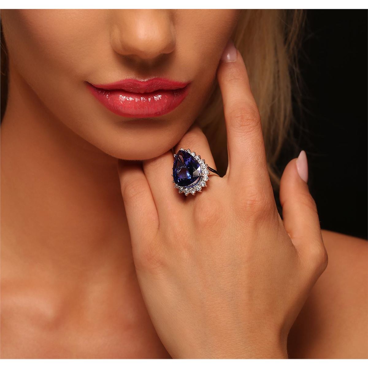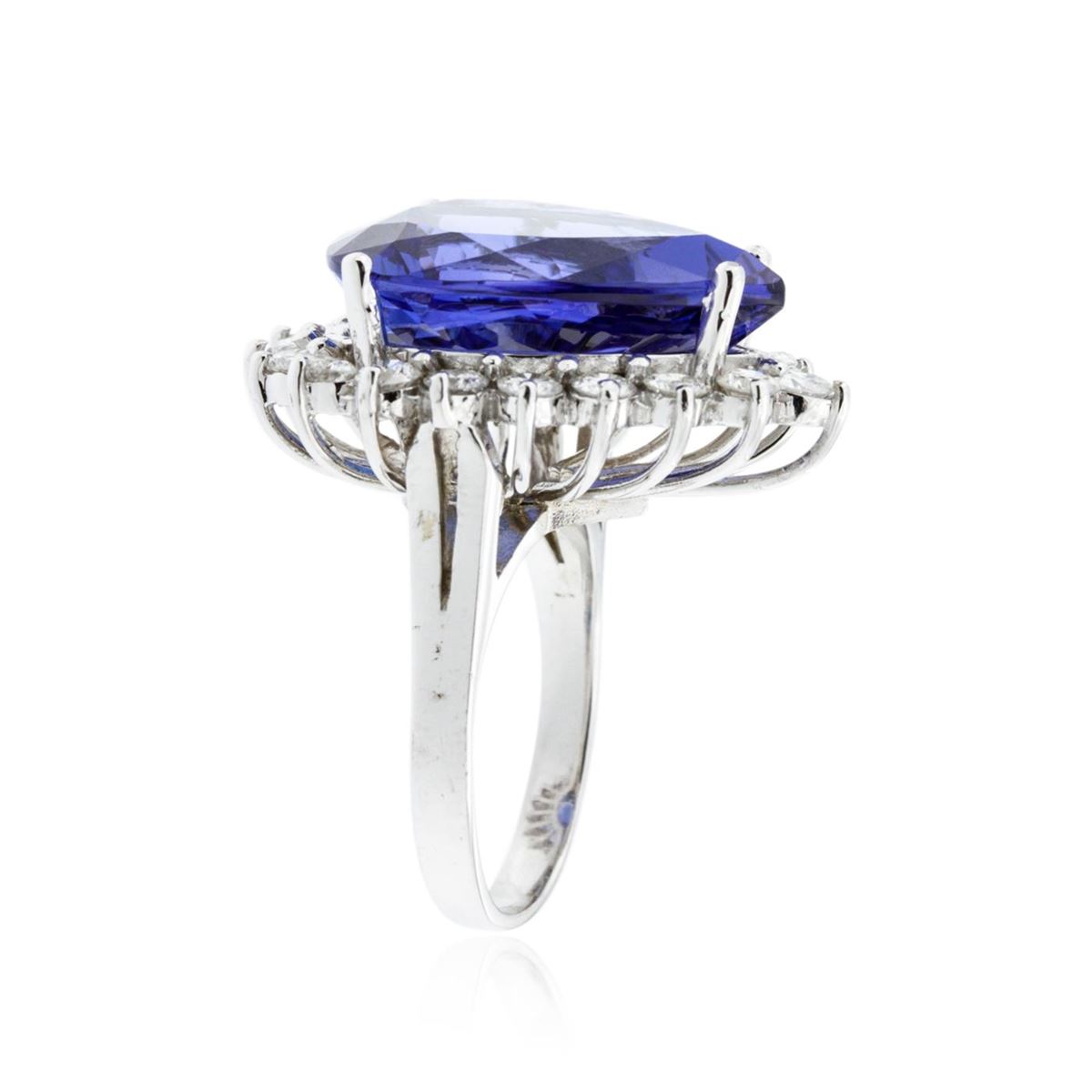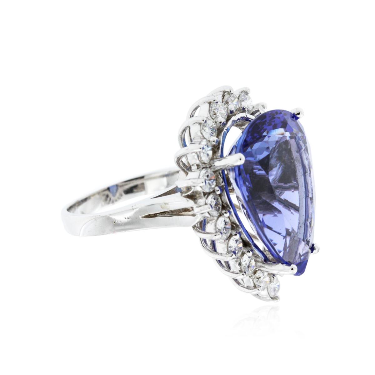 One electronically tested 14KT white gold ladies cast tanzanite and diamond ring with a bright polish finish. Condition is new, good workmanship. The featured tanzanite is set within a diamond bezel supported by split shoulders, completed by a two and one-half millimeter wide band. Identified with markings of "K14". Containing: One prong set pear modified brilliant cut natural tanzanite, measuring 19.66 x 15.35 x 8.71mm, approximate weight of 16.20ct., clarity is eye clean, type I, medium dark, very slightly grayish, violetish blue color, (GIA vB 6/3), cut is good. Transmitting light with no distortion, transparent. GIA Gemological Report attached. Graded loose prior to setting in the GIA Laboratory, Report #2151952617.Tanzanite is a very rare gemstone that is only found in the country of Tanzania. Originally discovered in 1967. Tiffany & Company, named the stone Tanzanite. It is found in the Usumburu Mountains that border the Umba Valley of northern Tanzania. Tanzanite occurs in gray, brown, violet, blue, reddish-purple, & green. The gem is interesting because of its exceptional pleochroism. Rotated in different directions a tanzanite will exhibit multiple changes of color. Tanzanite has a low tolerance to ultrasonic cleaning, and should not be cleaned using this method. Nineteen prong set round brilliant cut diamonds, measuring 2.90 - 2.80 x 1.71mm (depth est.) approximate. Total Weight of 19 Stones = 1.70ct. Graded in the setting. Clarity: SI-1 to I-1. Color: G - I. Total Weight of Colored Stones 16.20ct. Total Weight of Diamonds 1.70ct. Total Weight of Ring 10.88 grams. AIG Appraised at $47,105.00.