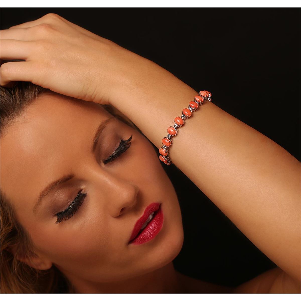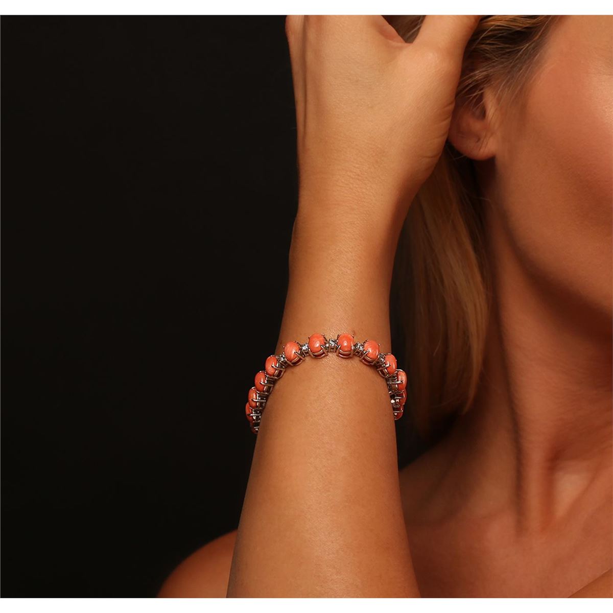 One electronically tested 14KT white gold Ladies combination cast & assembled bracelet with a tongue clasp with foldover safety with a bright polish finish. Condition is new. Measurements: 7" in length. Identified with markings of "14K". Containing: Nineteen prong set oval cabochon cut natural pink corals, measuring 8.00 x 6.00 x 2.50mm, approximate. Total Weight of 16.34ct., clarity is heavily included, medium light, moderately strong, pink color, (GIA Pk 4/4), cut is good. Colored gemstones are presumed to have been subjected to commonly used color/clarity enhancement processes. Nineteen prong set round brilliant cut diamonds, measuring 2.90 - 2.90 x 1.74mm (depth est.) approximate. Total Weight of 19 Stones = 1.70ct. Clarity: I-2 to I-3. Color: G - H, Cut is Good. Total Weight of Colored Stones 16.34ct. Total Weight of Diamonds 1.70ct. Total Weight of Bracelet 21.09 grams. GGL Appraised at $15,935.00.