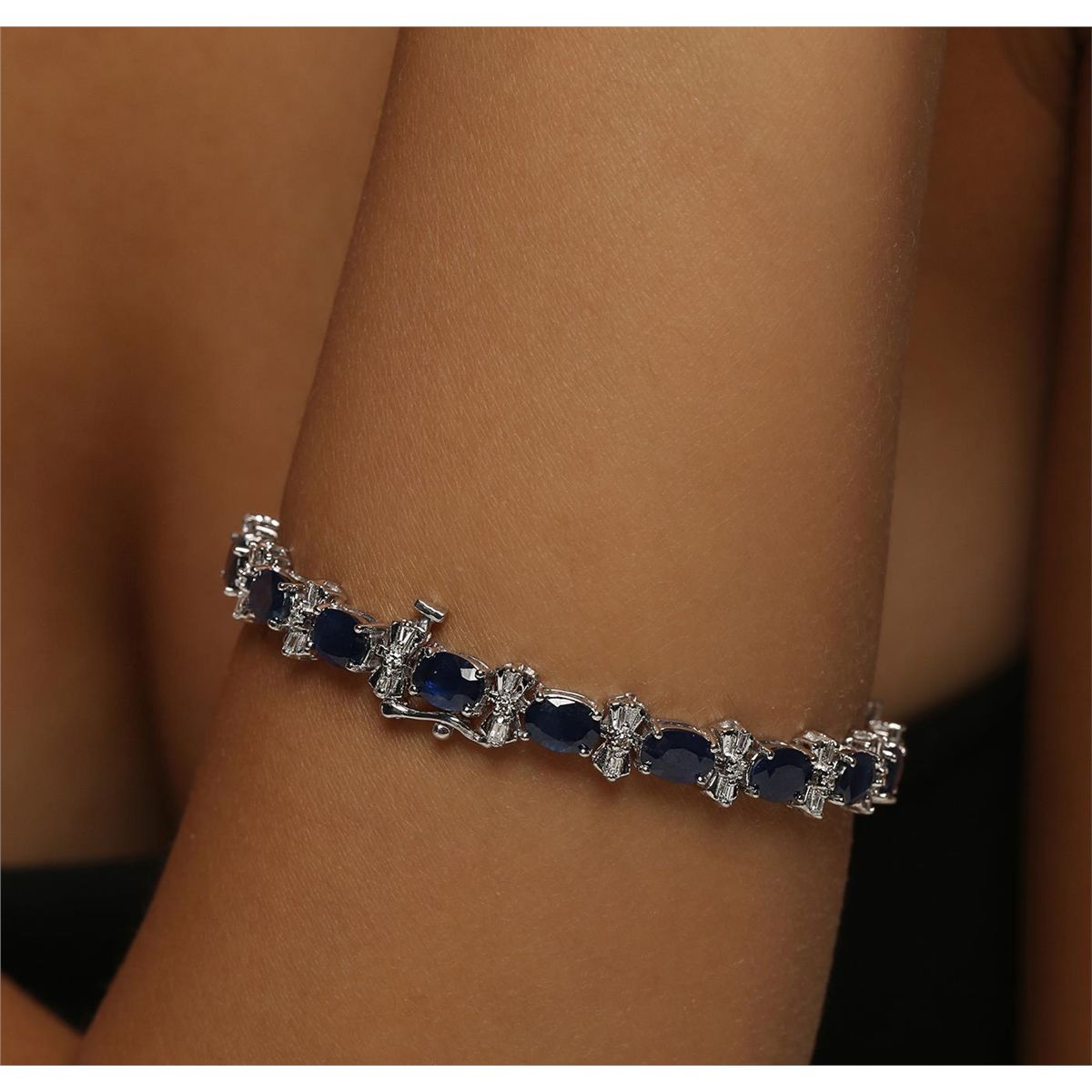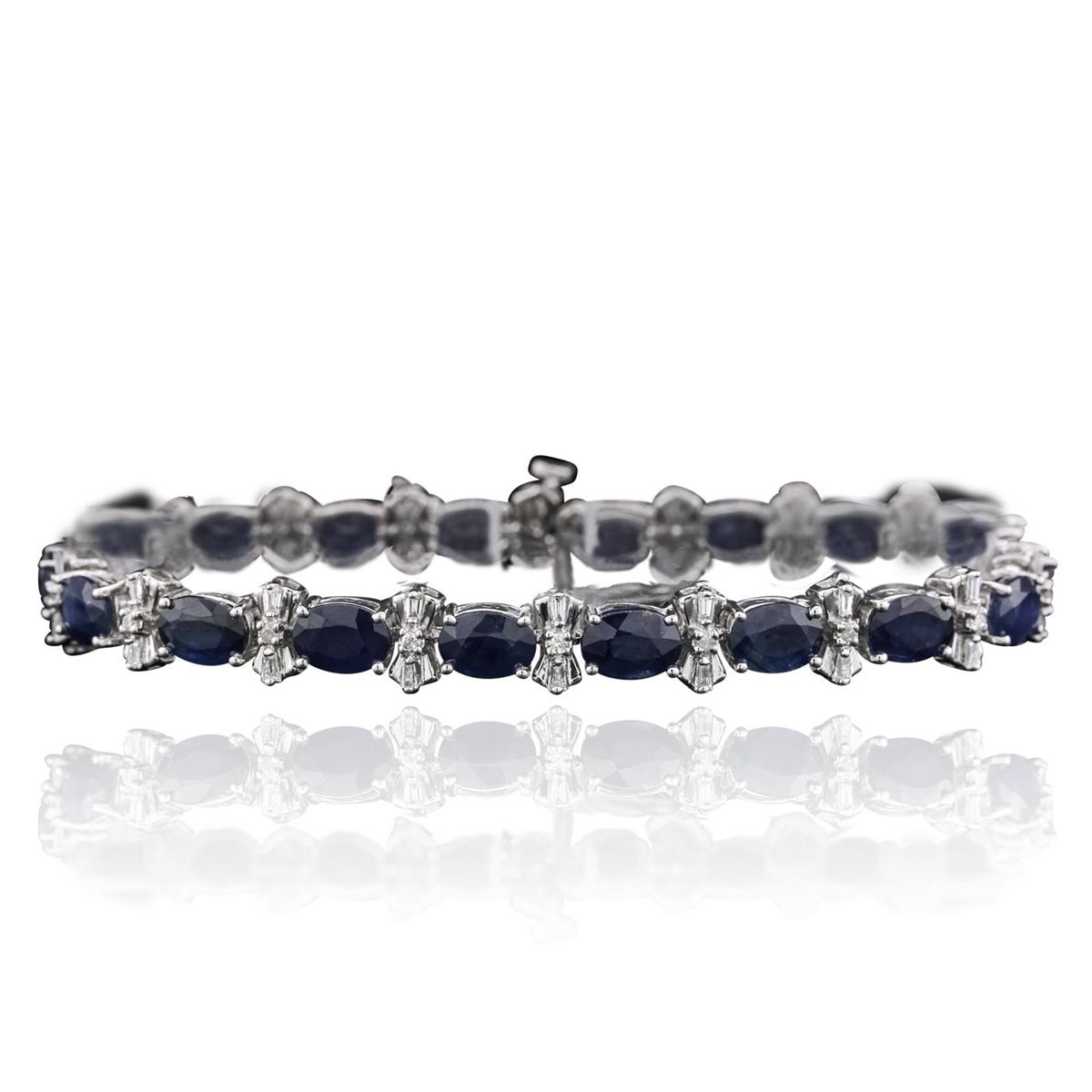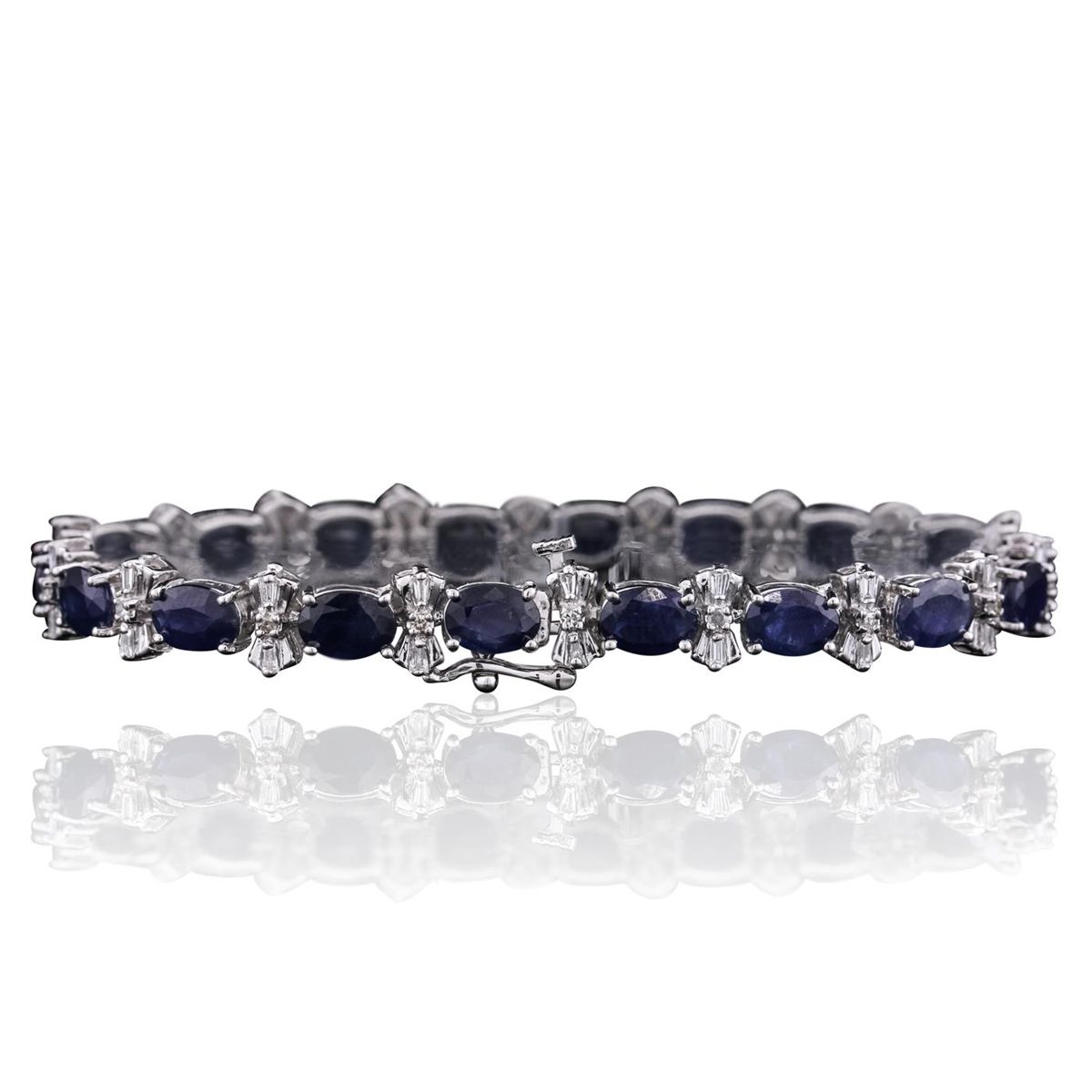 14KT White Gold 16.38ctw Sapphire and Diamond Bracelet. One electronically tested 14KT white gold ladies combination cast & assembled bracelet with a bright polish finish. Measurements: 6.85" in length. Identified with markings of "14K". Condition is new. Containing: Eighteen prong set oval modified brilliant cut natural blue sapphires, measuring 7.00 x 5.00 x 3.17mm, approximate total weight of 16.38ct., clarity is heavily included, type II, medium, very slightly grayish, blue color, (GIA B 5/3), cut is good. Sixteen prong set round brilliant cut diamonds, measuring 1.30 - 1.30 x 0.78mm (depth est.) approximate total weight of 16 Stones = 0.13ct. Clarity: SI-2 to SI-3. Color: I - J, Cut is Good. Thirty-Six prong set baguette cut diamonds, measuring 1.50 x 1.00 x 0.85mm (depth est.) approximate total weight of 36 Stones = 0.71ct. Clarity: SI-2 to I-1. Color: H - I, Cut is Good. Colored gemstones are presumed to have been subjected to commonly used enhancement processes. All diamonds and colored gemstones are graded in the mounting, unless otherwise stated. Total Weight of Colored Stones 16.38ct. Total Weight of Diamonds 0.84ct. Total Weight of Bracelet 16.90 grams. GGL Appraised at $13,380.00.