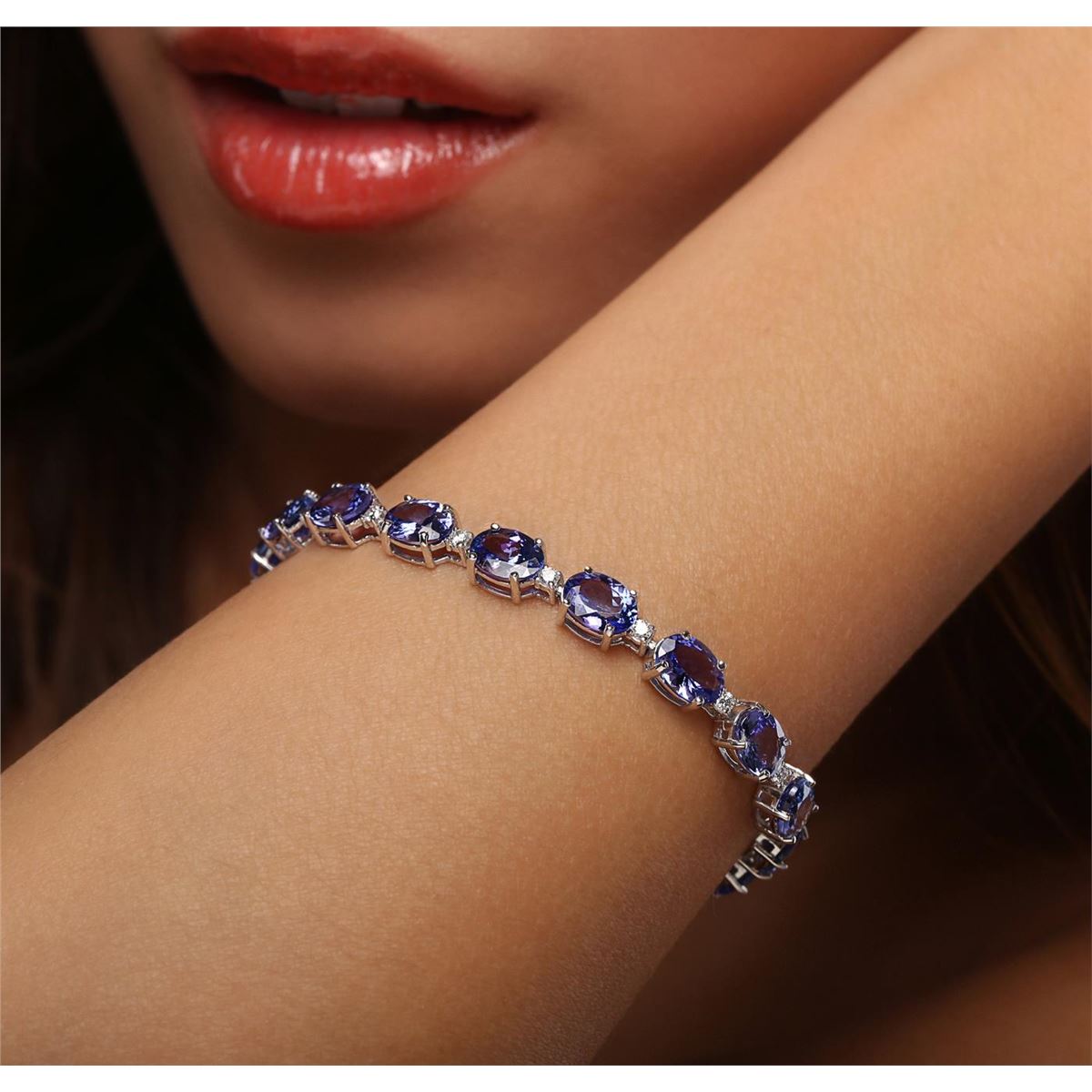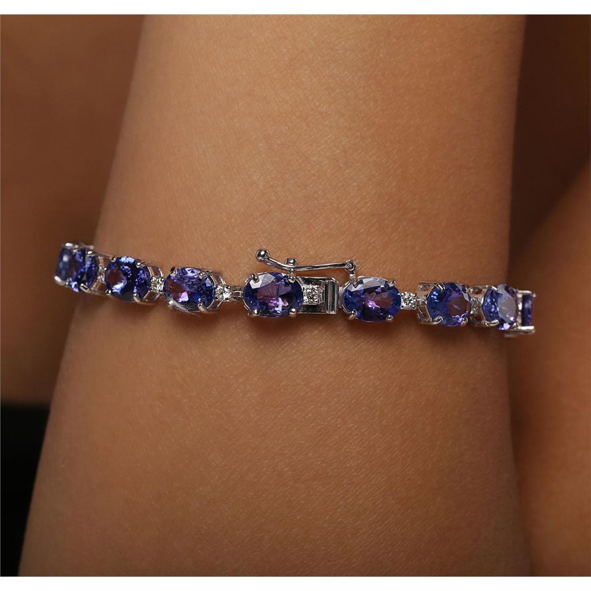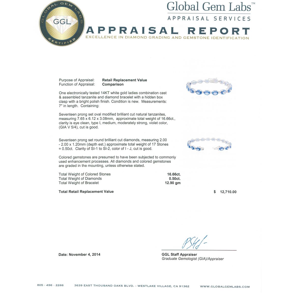 One electronically tested 14KT white gold ladies combination cast & assembled tanzanite and diamond bracelet with a hidden box clasp with a bright polish finish. Measurements: 7" in length. Condition is new. Containing: Seventeen prong set oval modified brilliant cut natural tanzanites, measuring 7.65 x 6.12 x 3.08mm, approximate total weight of 16.66ct., clarity is eye clean, type I, medium, moderately strong, violet color, (GIA V 5/4), cut is good. Seventeen prong set round brilliant cut diamonds, measuring 2.00 - 2.00 x 1.20mm (depth est.) approximate total weight of 17 Stones = 0.50ct. Clarity: SI-1 to SI-2. Color: I - J, Cut is Good. Colored gemstones are presumed to have been subjected to commonly used enhancement processes. All diamonds and colored gemstones are graded in the mounting, unless otherwise stated. Total Weight of Colored Stones 16.66ct. Total Weight of Diamonds 0.50ct. Total Weight of Bracelet 12.90 grams. GGL Appraised at $12,710.00.