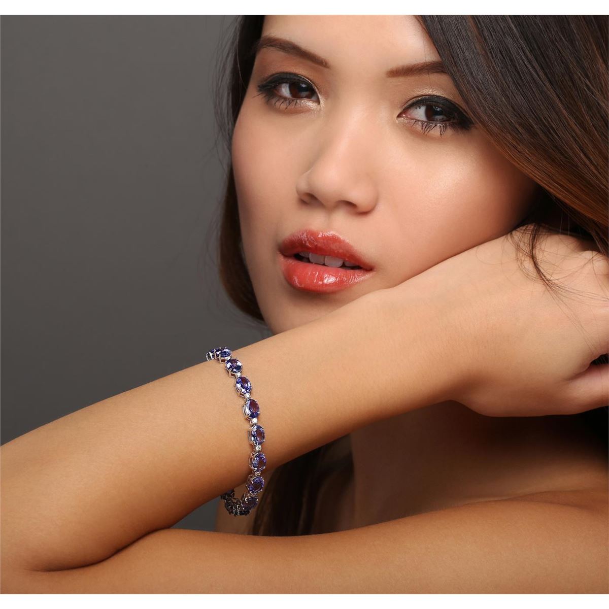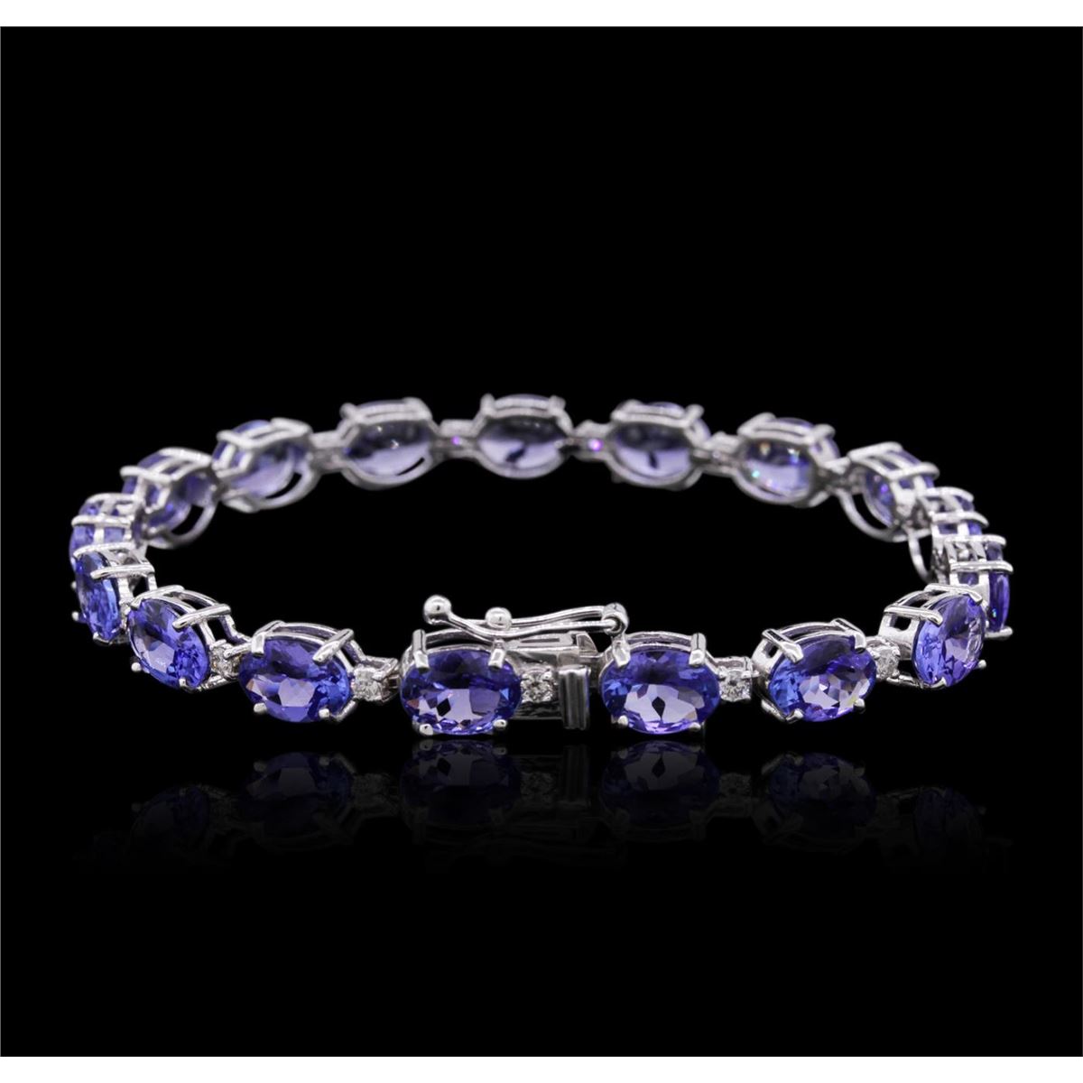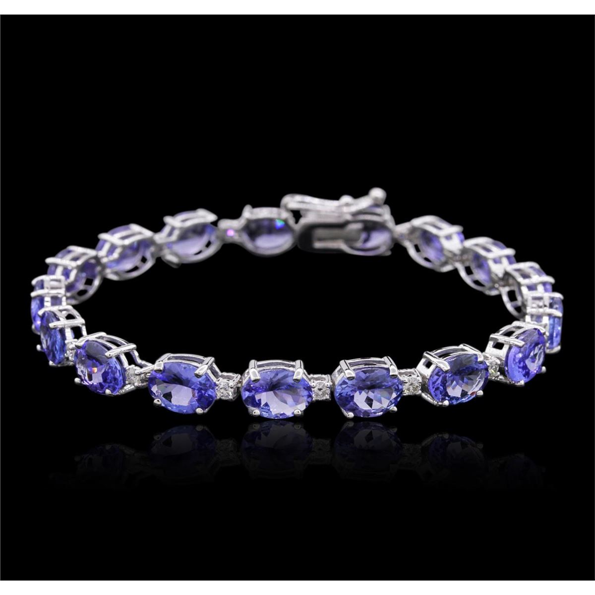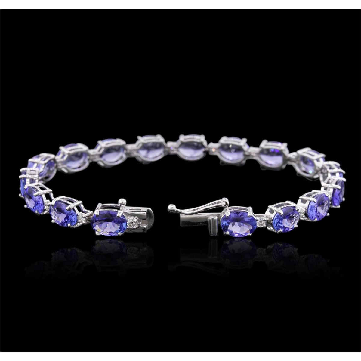 One electronically tested 14KT white gold ladies combination cast & assembled tanzanite and diamond bracelet with a hidden box clasp with a bright polish finish. Measurements: 7" in length. Condition is new. Containing: Seventeen prong set oval modified brilliant cut natural tanzanites, measuring 7.65 x 6.12 x 3.08mm, approximate total weight of 16.66ct., clarity is eye clean, type I, medium, moderately strong, violet color, (GIA V 5/4), cut is good. Seventeen prong set round brilliant cut diamonds, measuring 2.00 - 2.00 x 1.20mm (depth est.) approximate total weight of 17 Stones = 0.50ct. Clarity: SI-1 to SI-2. Color: I - J, Cut is Good. Colored gemstones are presumed to have been subjected to commonly used enhancement processes. All diamonds and colored gemstones are graded in the mounting, unless otherwise stated. Total Weight of Colored Stones 16.66ct. Total Weight of Diamonds 0.50ct. Total Weight of Bracelet 12.90 grams. GGL Appraised at $12,710.00.