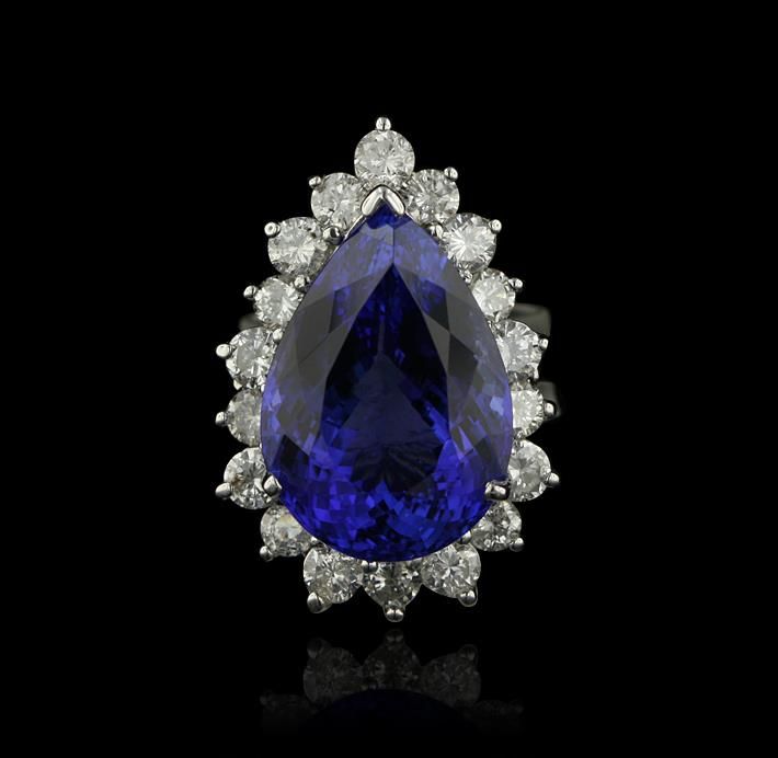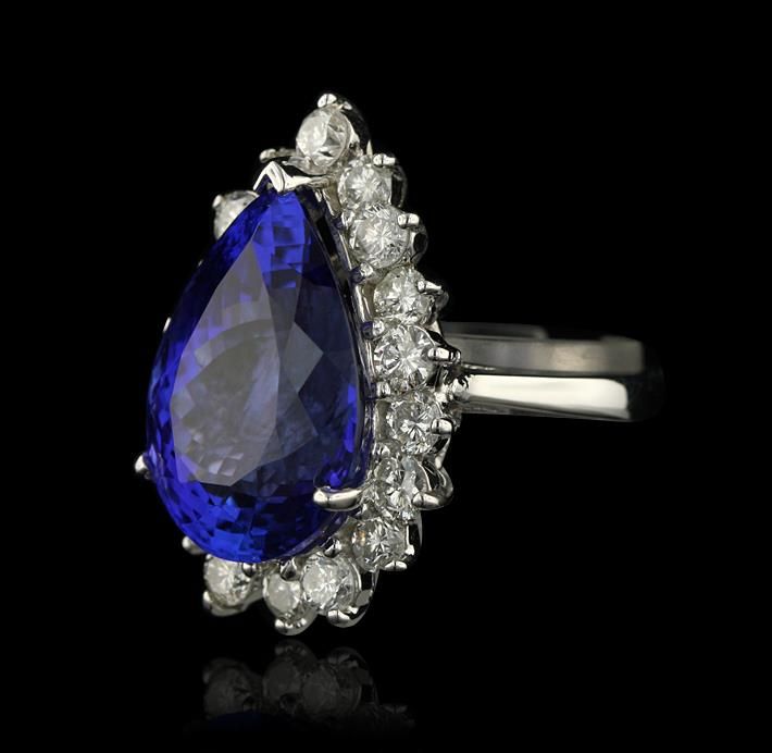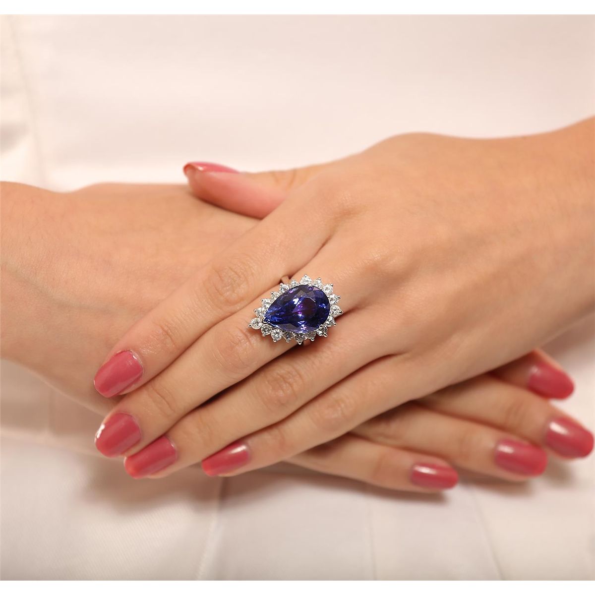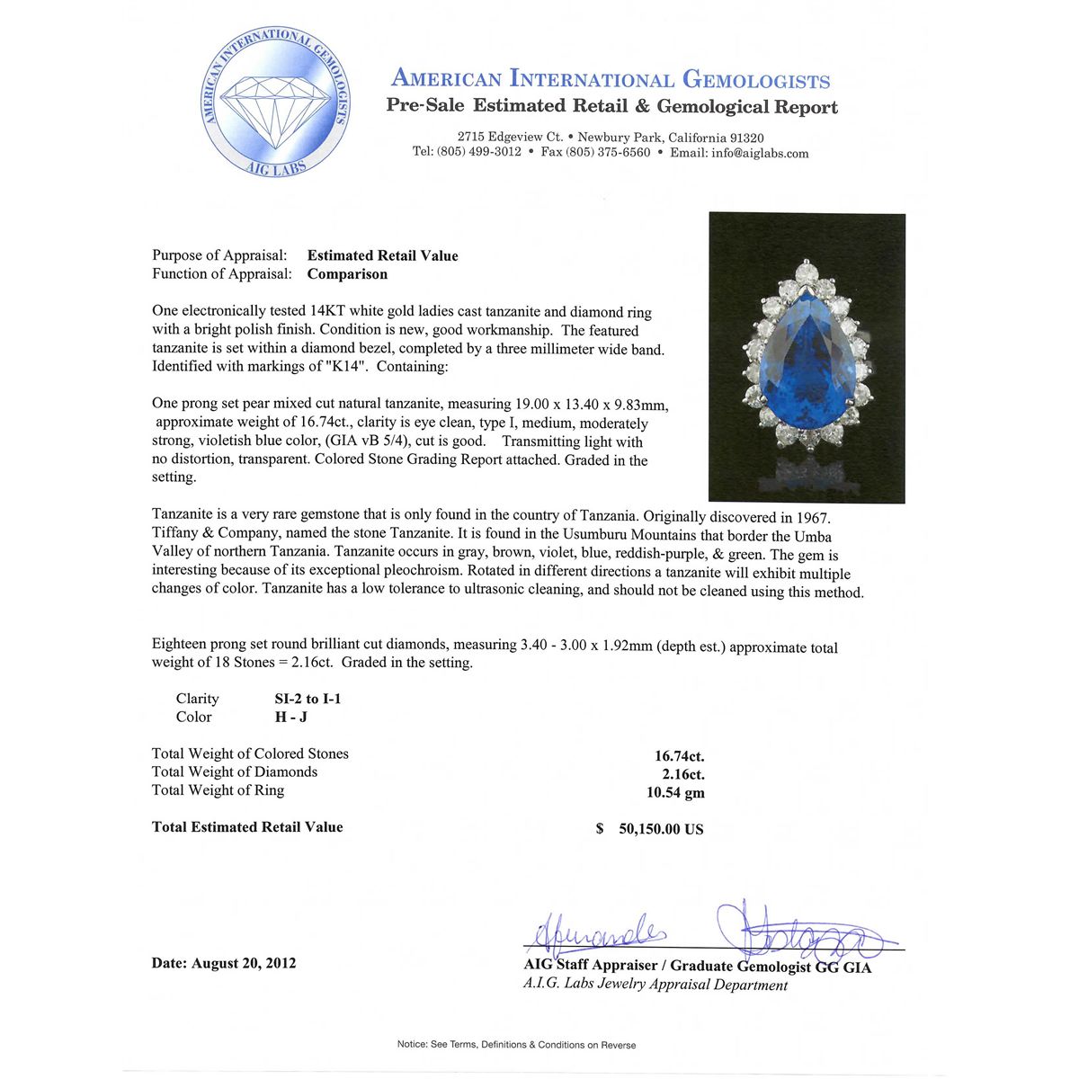 One electronically tested 14KT white gold ladies cast tanzanite and diamond ring with a bright polish finish. Condition is new, good workmanship. The featured tanzanite is set within a diamond bezel, completed by a three millimeter wide band. Identified with markings of "K14". Containing: One prong set pear mixed cut natural tanzanite, measuring 19.00 x 13.40 x 9.83mm, approximate weight of 16.74ct., clarity is eye clean, type I, medium, moderately strong, violetish blue color, (GIA vB 5/4), cut is good. Transmitting light with no distortion, transparent. Colored Stone Grading Report attached. Graded in the setting. Tanzanite is a very rare gemstone that is only found in the country of Tanzania. Originally discovered in 1967. Tiffany & Company, named the stone Tanzanite. It is found in the Usumburu Mountains that border the Umba Valley of northern Tanzania. Tanzanite occurs in gray, brown, violet, blue, reddish-purple, & green. The gem is interesting because of its exceptional pleochroism. Rotated in different directions a tanzanite will exhibit multiple changes of color. Tanzanite has a low tolerance to ultrasonic cleaning, and should not be cleaned using this method. Eighteen prong set round brilliant cut diamonds, measuring 3.40 - 3.00 x 1.92mm (depth est.) approximate total weight of 18 Stones = 2.16ct. Graded in the setting. Clarity SI-2 to I-1. Color H - J. Total Weight of Tanzanite 16.74ct. Total Weight of Diamonds 2.16ct. Total Weight of Ring 10.54gm.