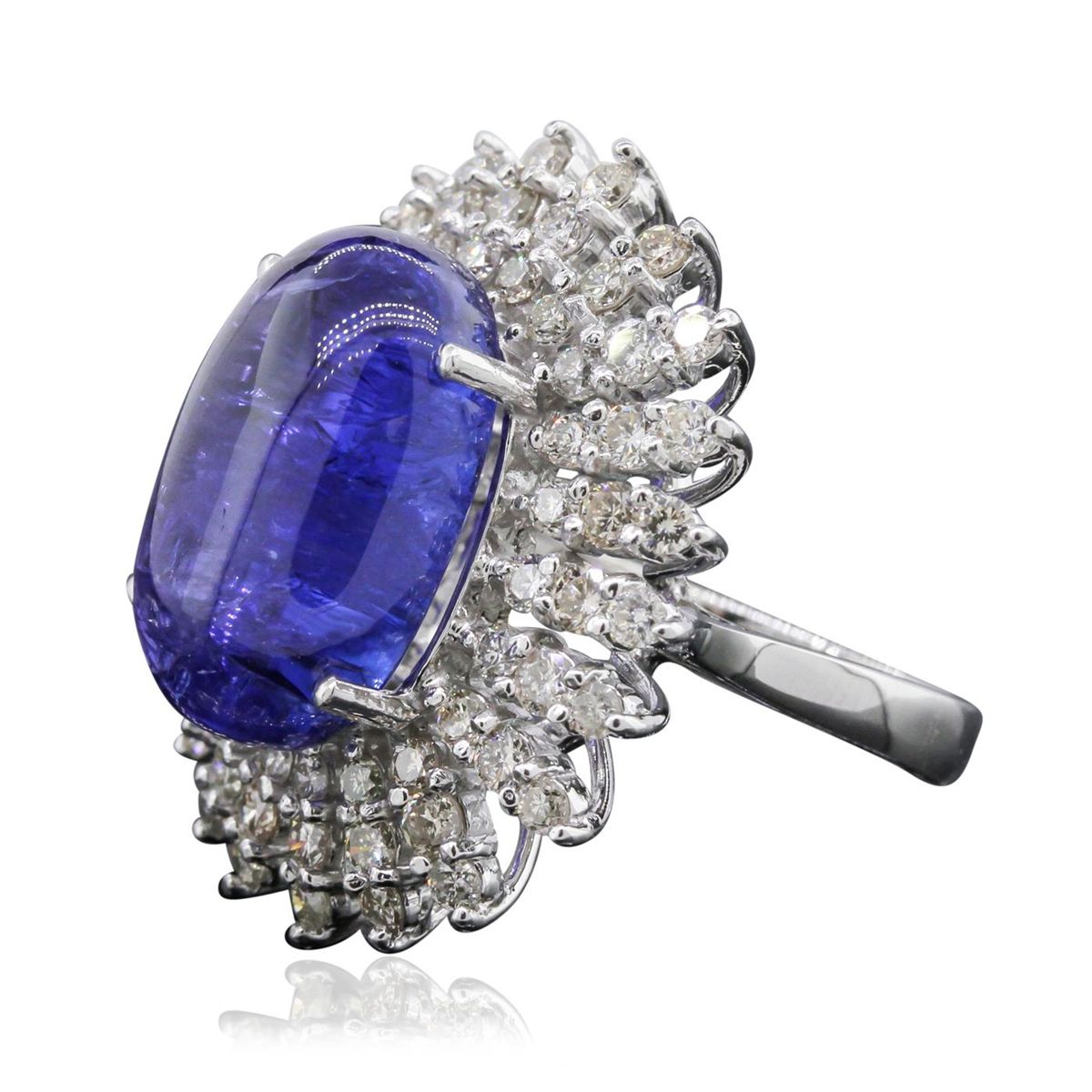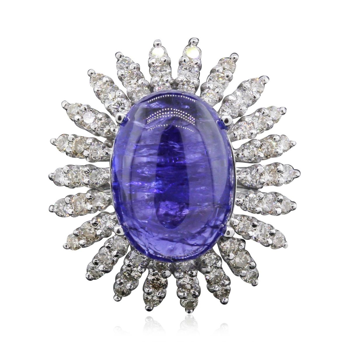 One electronically tested 14KT white gold ladies cast tanzanite and diamond ring with a bright polish finish. The featured tanzanite is set within a floral diamond bezel, completed by a three millimeter wide band. Identified with markings of "K14". Condition is new, good workmanship. Containing: One prong set oval cabochon cut natural tanzanite, measuring 18.00 x 12.65 x 8.10mm, approximate weight of 16.78ct., clarity is heavily included, type I, medium dark, very slightly grayish, bluish violet color, (GIA bV 6/3), cut is good. Transmitting light somewhat diffusely, transparent to translucent. Naturally occurring internal & external characteristics are present. Colored Stone Grading Report attached. Graded in the setting. Tanzanite is a very rare gemstone that is only found in the country of Tanzania. Originally discovered in 1967. Tiffany & Company, named the stone Tanzanite. It is found in the Usumburu Mountains that border the Umba Valley of northern Tanzania. Tanzanite occurs in gray, brown, violet, blue, reddish-purple, & green. The gem is interesting because of its exceptional pleochroism. Rotated in different directions a tanzanite will exhibit multiple changes of color. Tanzanite has a low tolerance to ultrasonic cleaning, and should not be cleaned using this method. Sixty-Six prong set round brilliant cut diamonds, measuring 2.10 - 2.00 x 1.23mm (depth est.) approximate. Total Weight of 66 Stones = 2.18ct. Faint brown secondary color throughout. Graded in the setting. Clarity: SI-1 to I-1. Color: I - K. Total Weight of Colored Stones 16.78ct. Total Weight of Diamonds 2.18ct. AIG Appraised at $18,380.00.