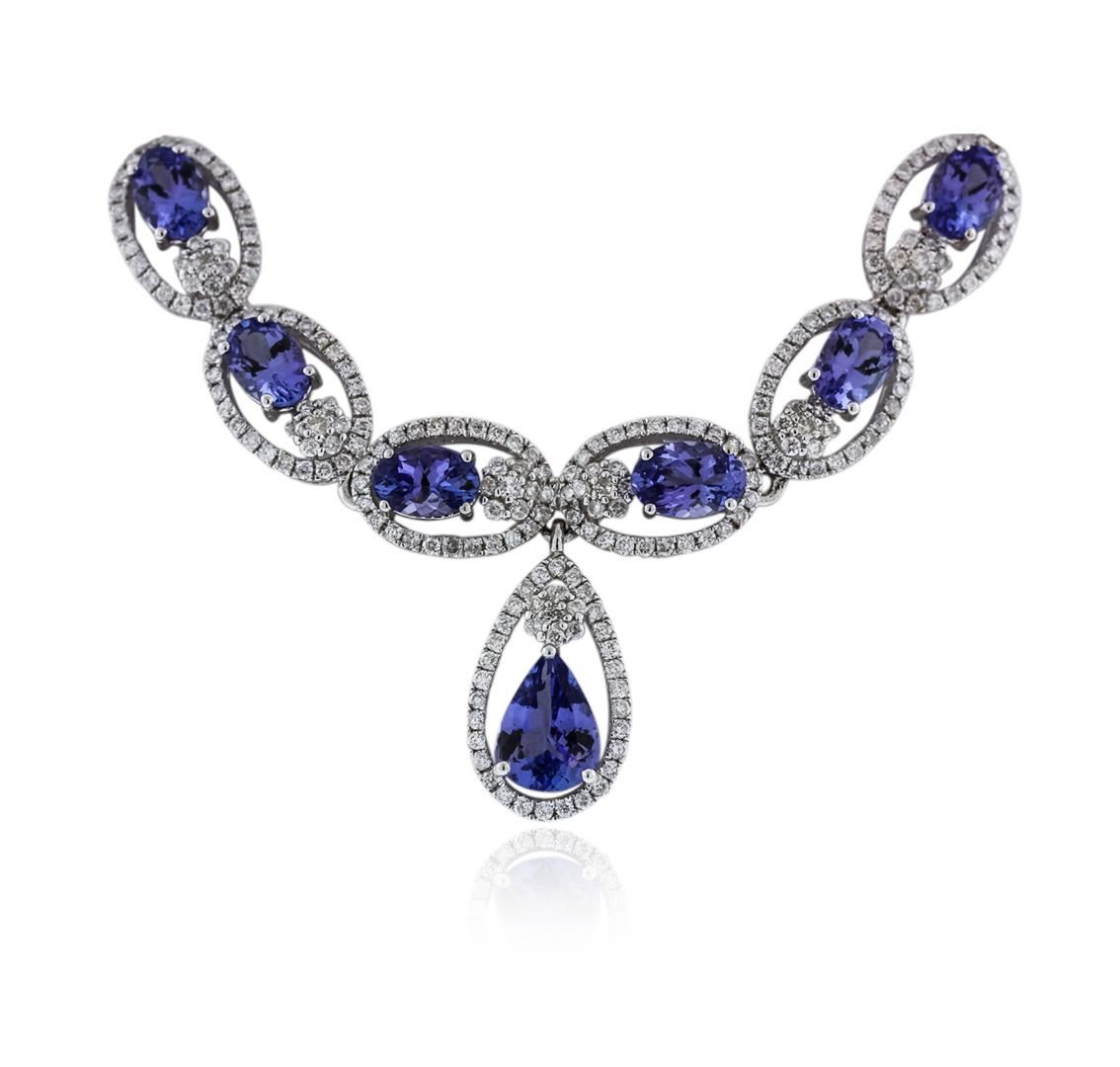 One necklace featuring: 14KT white gold weighing 28.20 grams containing tanzanite weighing a total of 16.85 carats and diamonds weighing a total of 5.93 carats.