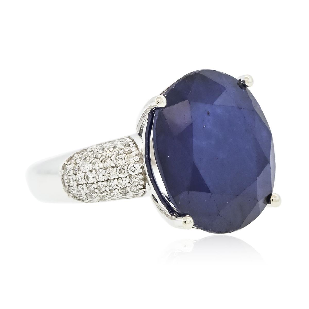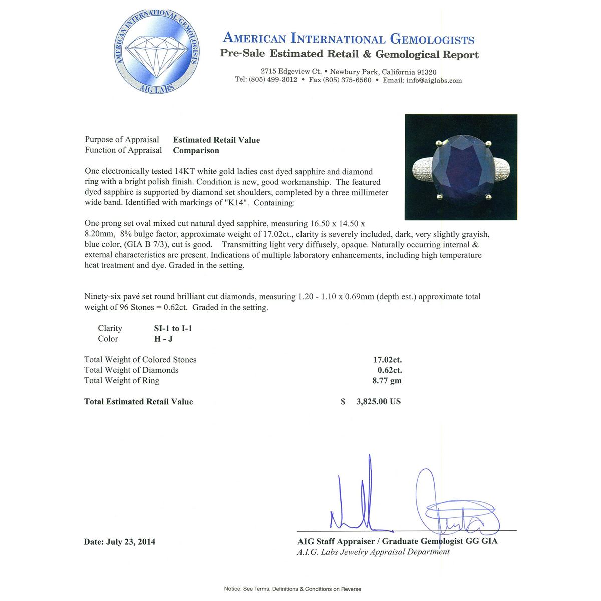 One electronically tested 14KT white gold ladies cast dyed sapphire and diamond ring with a bright polish finish. Condition is new, good workmanship. The featured dyed sapphire is supported by diamond set shoulders, completed by a three millimeter wide band. Identified with markings of "K14". Containing: One prong set oval mixed cut natural dyed sapphire, measuring 16.50 x 14.50 x 8.20mm, 8%. bulge factor, approximate weight of 17.02ct., clarity is severely included, dark, very slightly grayish, blue color, (GIA B 7/3), cut is good. Transmitting light very diffusely, opaque. Naturally occurring internal & external characteristics are present. Indications of multiple laboratory enhancements, including high temperature heat treatment and dye. Graded in the setting. Ninety-Six pav‚ set round brilliant cut diamonds, measuring 1.20 - 1.10 x 0.69mm (depth est.) approximate. Total Weight of 96 Stones = 0.62ct. Graded in the setting. Clarity: SI-1 to I-1. Color: H - J. Total Weight of Colored Stones 17.02ct. Total Weight of Diamonds 0.62ct. Total Weight of Ring 8.77 grams. AIG Appraised at $3,825.00.