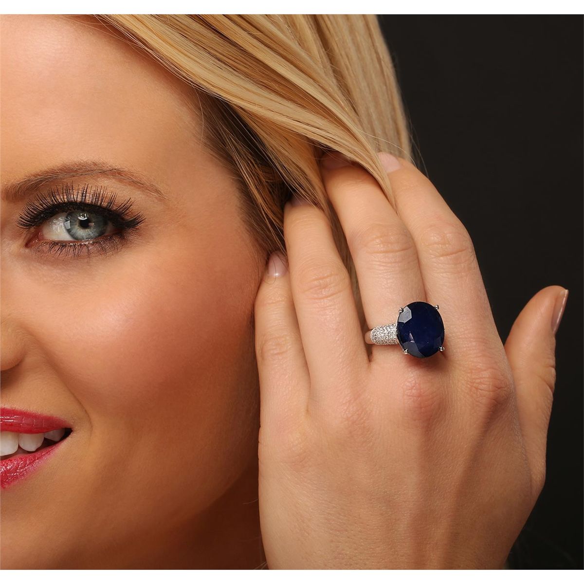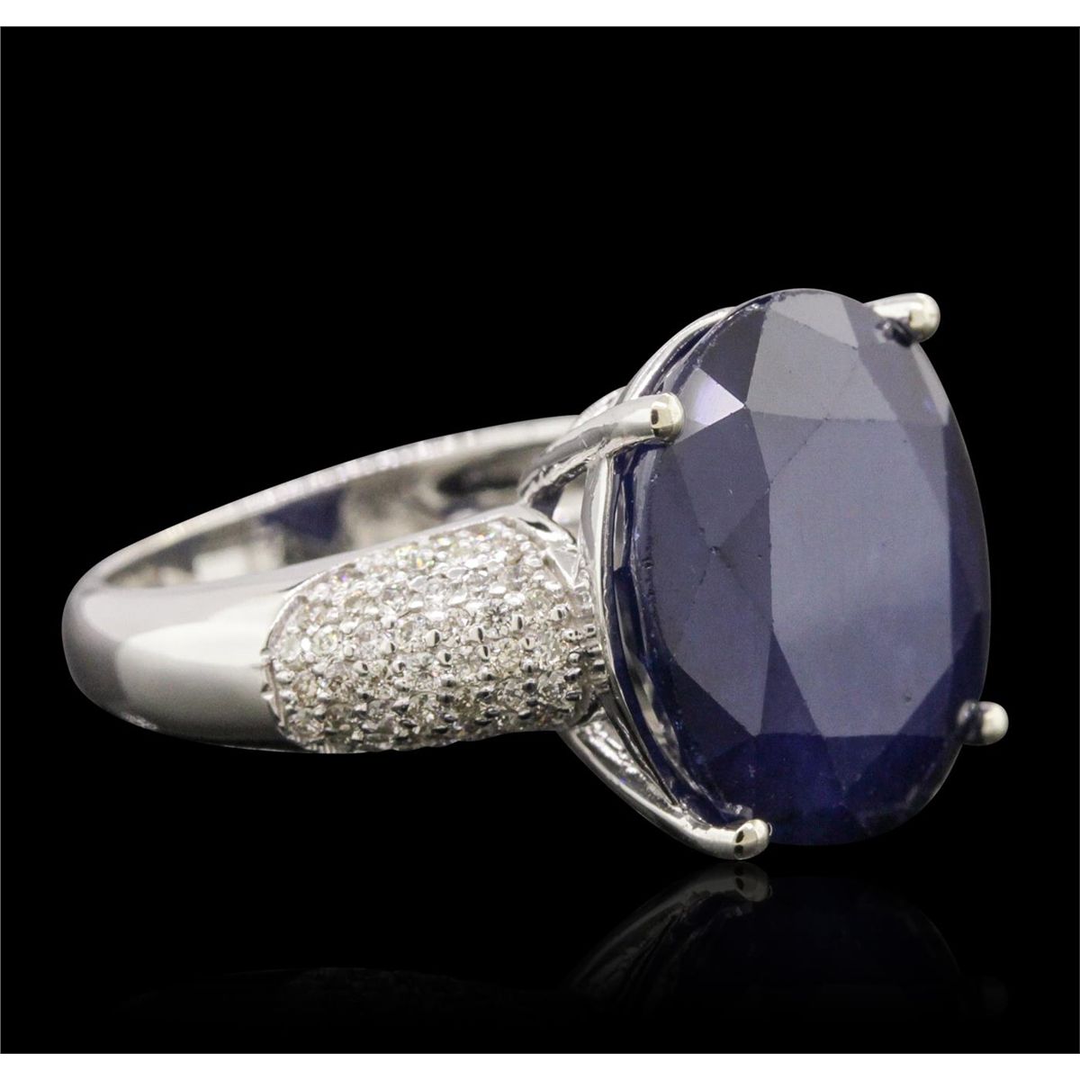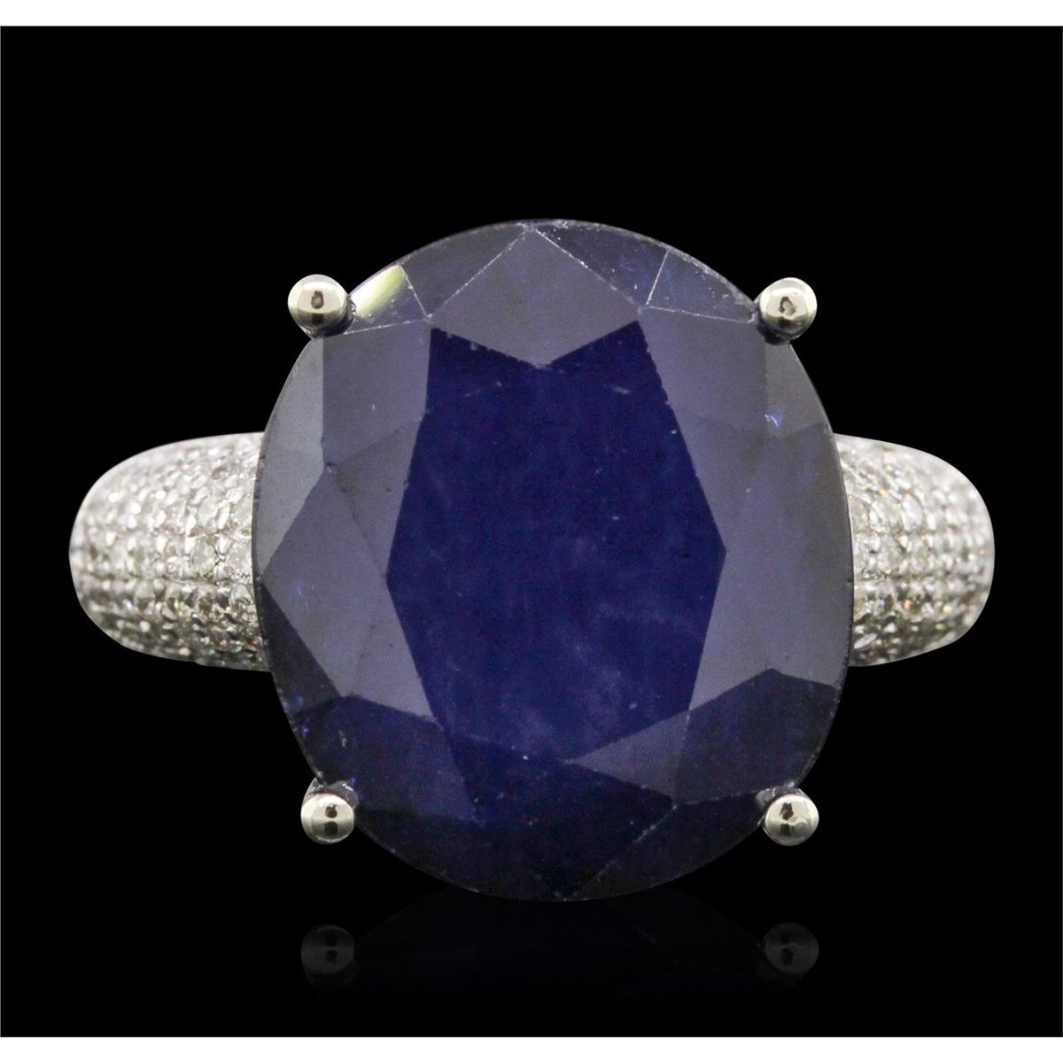 One electronically tested 14KT white gold ladies cast dyed sapphire and diamond ring with a bright polish finish. Condition is new, good workmanship. The featured dyed sapphire is supported by diamond set shoulders, completed by a three millimeter wide band. Identified with markings of "K14". Containing: One prong set oval mixed cut natural dyed sapphire, measuring 16.50 x 14.50 x 8.20mm, 8%. bulge factor, approximate weight of 17.02ct., clarity is severely included, dark, very slightly grayish, blue color, (GIA B 7/3), cut is good. Transmitting light very diffusely, opaque. Naturally occurring internal & external characteristics are present. Indications of multiple laboratory enhancements, including high temperature heat treatment and dye. Graded in the setting. Ninety-Six pav‚ set round brilliant cut diamonds, measuring 1.20 - 1.10 x 0.69mm (depth est.) approximate. Total Weight of 96 Stones = 0.62ct. Graded in the setting. Clarity: SI-1 to I-1. Color: H - J. Total Weight of Colored Stones 17.02ct. Total Weight of Diamonds 0.62ct. Total Weight of Ring 8.77 grams. AIG Appraised at $3,825.00.