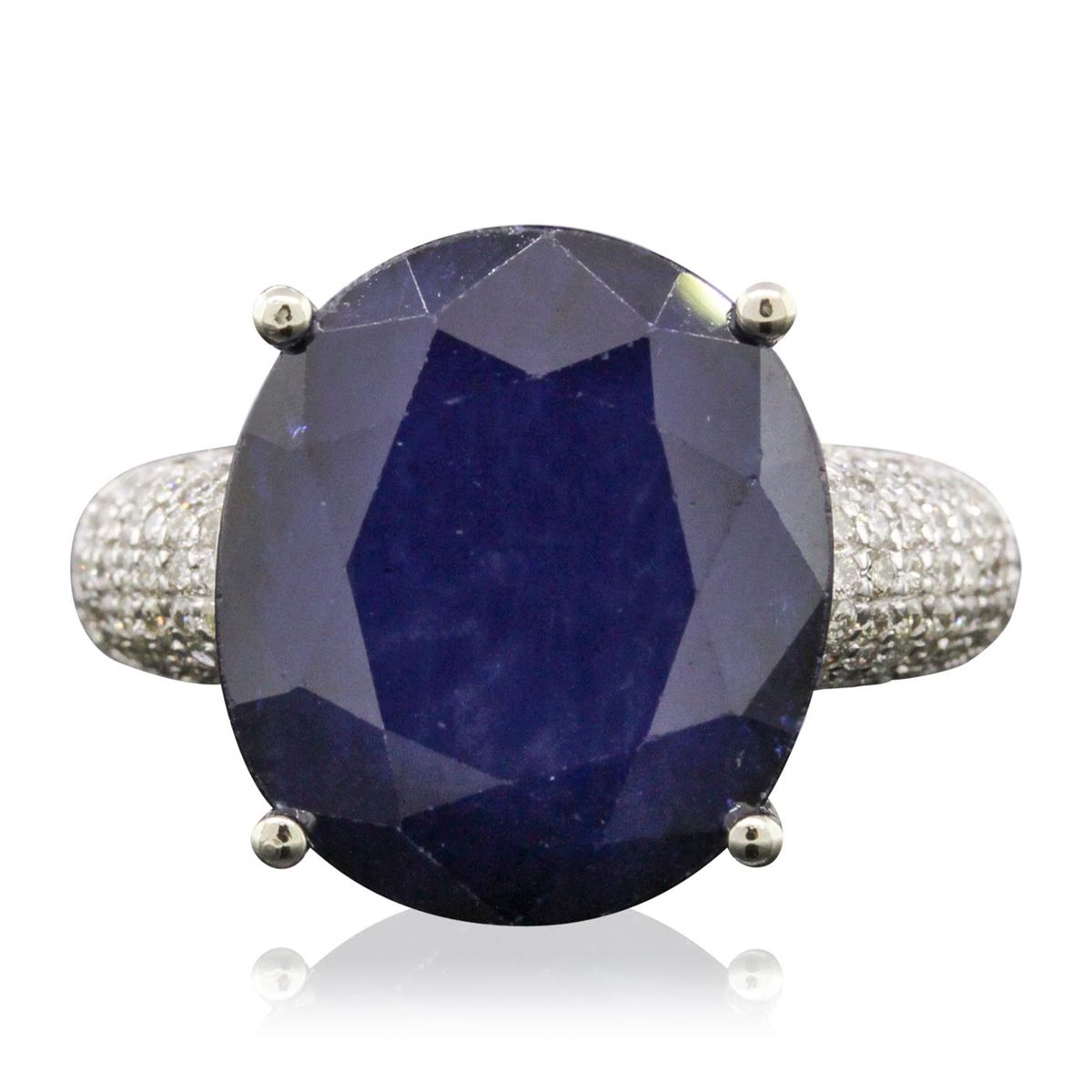 One electronically tested 14KT white gold ladies cast dyed sapphire and diamond ring with a bright polish finish. Condition is new, good workmanship. The featured dyed sapphire is supported by diamond set shoulders, completed by a three millimeter wide band. Identified with markings of "K14". Containing: One prong set oval mixed cut natural dyed sapphire, measuring 16.50 x 14.50 x 8.20mm, 8%. bulge factor, approximate weight of 17.02ct., clarity is severely included, dark, very slightly grayish, blue color, (GIA B 7/3), cut is good. Transmitting light very diffusely, opaque. Naturally occurring internal & external characteristics are present. Indications of multiple laboratory enhancements, including high temperature heat treatment and dye. Graded in the setting. Ninety-Six pav‚ set round brilliant cut diamonds, measuring 1.20 - 1.10 x 0.69mm (depth est.) approximate. Total Weight of 96 Stones = 0.62ct. Graded in the setting. Clarity: SI-1 to I-1. Color: H - J. Total Weight of Colored Stones 17.02ct. Total Weight of Diamonds 0.62ct. Total Weight of Ring 8.77 grams. AIG Appraised at $3,825.00.