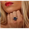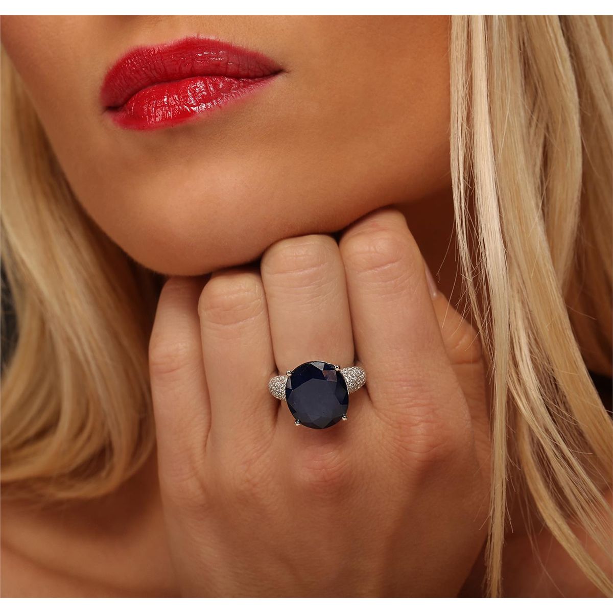 One electronically tested 14KT white gold ladies cast dyed sapphire and diamond ring with a bright polish finish. Condition is new, good workmanship. The featured dyed sapphire is supported by diamond set shoulders, completed by a three millimeter wide band. Identified with markings of "K14". Containing: One prong set oval mixed cut natural dyed sapphire, measuring 16.50 x 14.50 x 8.20mm, 8%. bulge factor, approximate weight of 17.02ct., clarity is severely included, dark, very slightly grayish, blue color, (GIA B 7/3), cut is good. Transmitting light very diffusely, opaque. Naturally occurring internal & external characteristics are present. Indications of multiple laboratory enhancements, including high temperature heat treatment and dye. Graded in the setting. Ninety-Six pav‚ set round brilliant cut diamonds, measuring 1.20 - 1.10 x 0.69mm (depth est.) approximate. Total Weight of 96 Stones = 0.62ct. Graded in the setting. Clarity: SI-1 to I-1. Color: H - J. Total Weight of Colored Stones 17.02ct. Total Weight of Diamonds 0.62ct. Total Weight of Ring 8.77 grams. AIG Appraised at $3,825.00.
