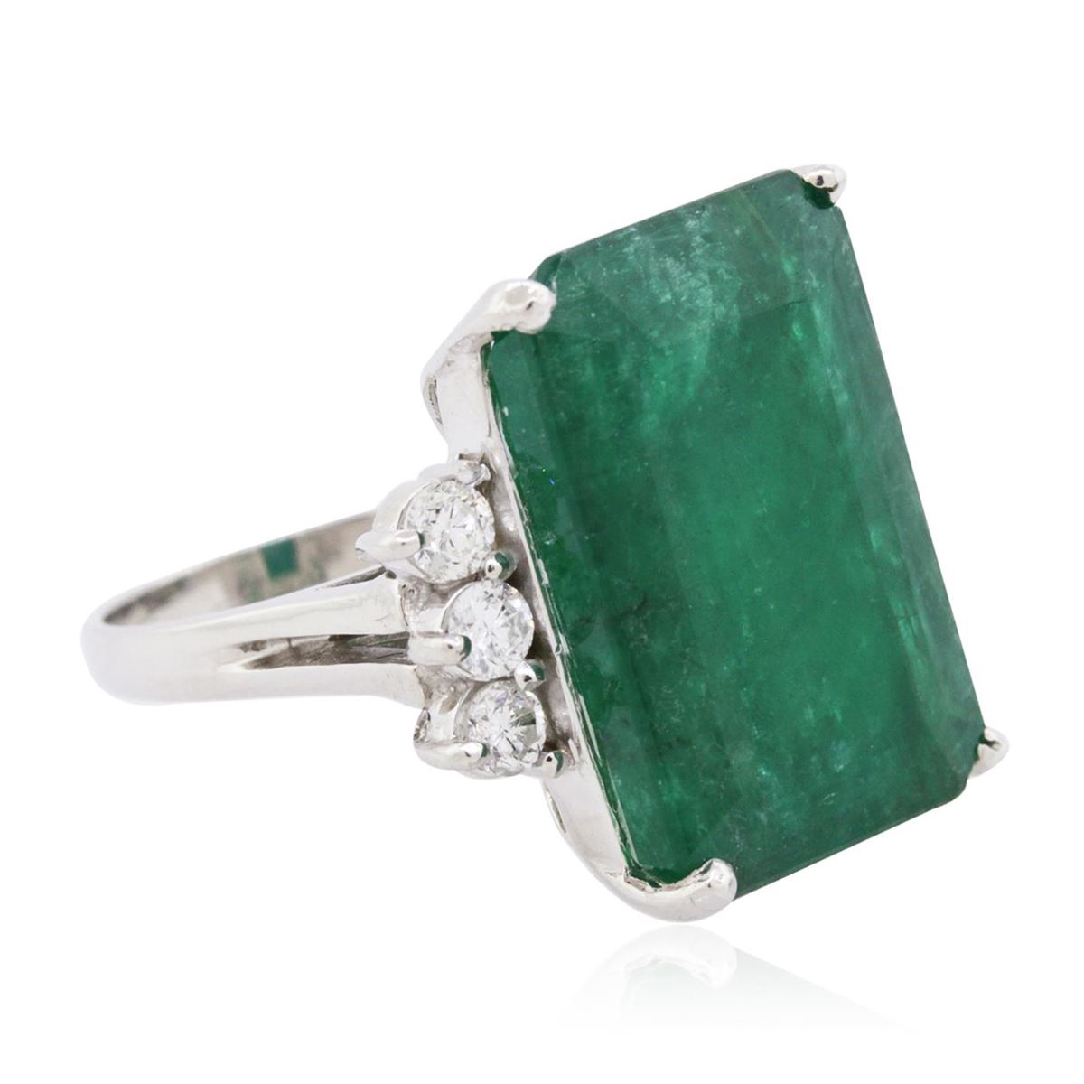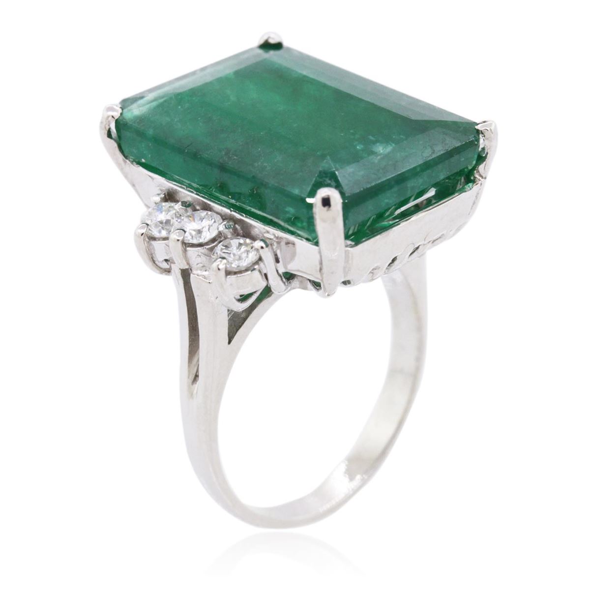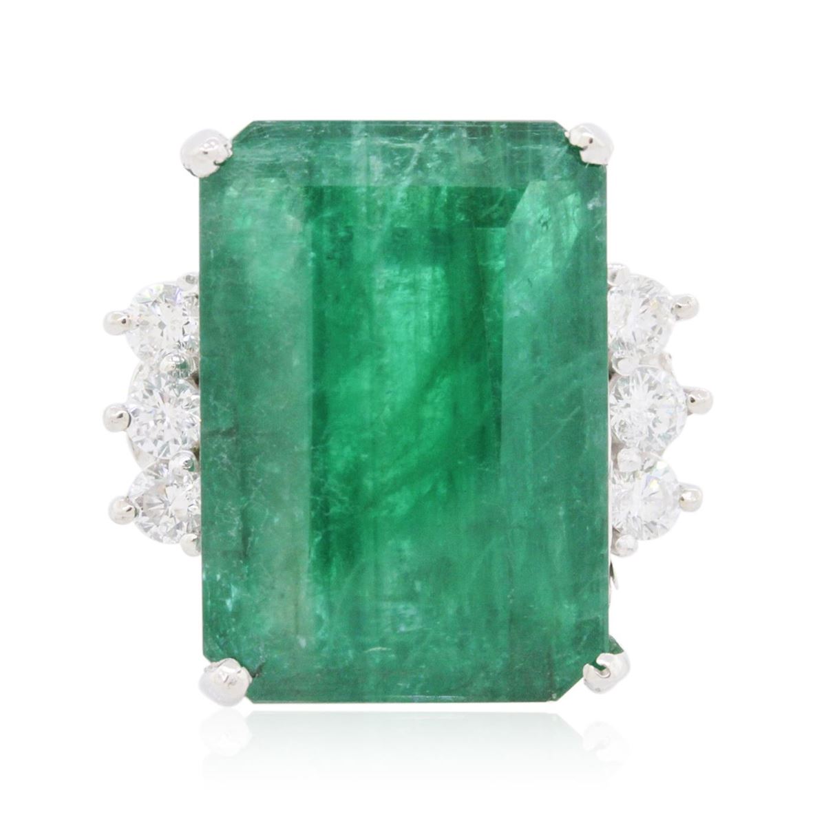 One electronically tested 14KT white gold ladies combination cast & assembled emerald and diamond ring with a bright polish finish. Identified with markings of "K14". Condition is new. Containing: One prong set emerald standard step cut natural emerald, measuring 19.79 x 13.85 x 8.51mm, approximate weight of 17.13ct., clarity is heavily included, type III, medium dark, moderately strong, green color, (GIA G 6/4), cut is good. Six prong set round brilliant cut diamonds, measuring 2.80 - 2.80 x 1.68mm (depth est.) approximate total weight of 6 Stones = 0.48ct. Clarity: SI-2 to I-1. Color: I - J, Cut is Good. Colored gemstones are presumed to have been subjected to commonly used enhancement processes. All diamonds and colored gemstones are graded in the mounting, unless otherwise stated. Total Weight of Colored Stones 17.13ct. Total Weight of Diamonds 0.48ct. Total Weight of Ring 9.40 grams. GGL Appraised at $7,695.00.