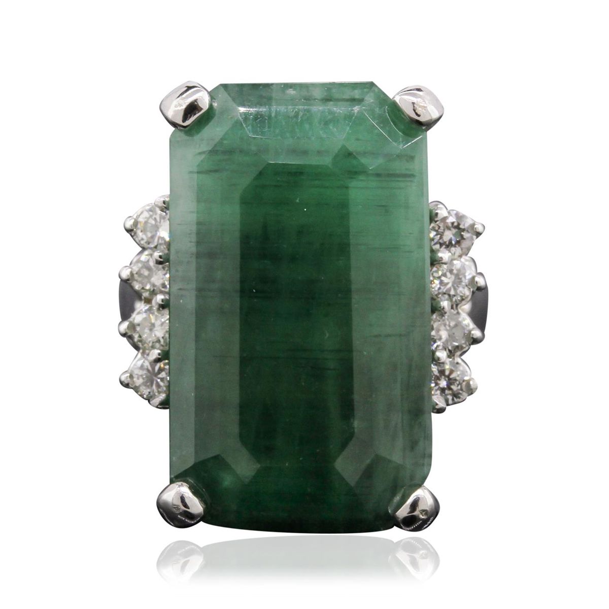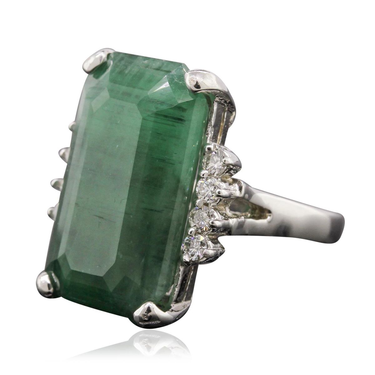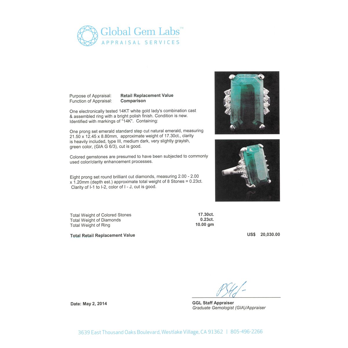 One electronically tested 14KT white gold Ladies combination cast & assembled ring with a bright polish finish. Condition is new. Identified with markings of "14K". Containing: One prong set emerald standard step cut natural emerald, measuring 21.50 x 12.45 x 8.80mm, approximate weight of 17.30ct., clarity is heavily included, type III, medium dark, very slightly grayish, green color, (GIA G 6/3), cut is good. Colored gemstones are presumed to have been subjected to commonly used color/clarity enhancement processes. Eight prong set round brilliant cut diamonds, measuring 2.00 - 2.00 x 1.20mm (depth est.) approximate. Total Weight of 8 Stones = 0.23ct. Clarity: I-1 to I-2. Color: I - J, Cut is Good. Total Weight of Colored Stones 17.30ct. Total Weight of Diamonds 0.23ct. Total Weight of Ring 10.00 grams. GGL Appraised at $20,030.00.