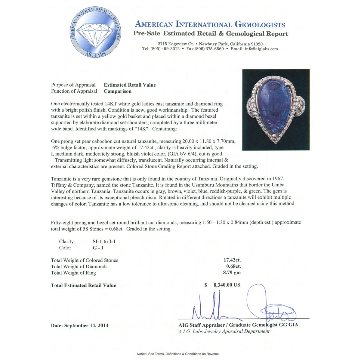 One electronically tested 14KT white gold ladies cast tanzanite and diamond ring with a bright polish finish. The featured tanzanite is set within a yellow gold basket and placed within a diamond bezel supported by elaborate diamond set shoulders, completed by a three millimeter wide band. Identified with markings of "14K". Condition is new, good workmanship. Containing: One prong set pear cabochon cut natural tanzanite, measuring 20.00 x 11.80 x 7.70mm, 6% bulge factor, approximate weight of 17.42ct., clarity is heavily included, type I, medium dark, moderately strong, bluish violet color, (GIA bV 6/4), cut is good. Transmitting light somewhat diffusely, translucent. Naturally occurring internal &external characteristics are present. Colored Stone Grading Report attached. Graded in the setting. Tanzanite is a very rare gemstone that is only found in the country of Tanzania. Originally discovered in 1967. Tiffany & Company, named the stone Tanzanite. It is found in the Usumburu Mountains that border the Umba Valley of northern Tanzania. Tanzanite occurs in gray, brown, violet, blue, reddish-purple, & green. The gem is interesting because of its exceptional pleochroism. Rotated in different directions a tanzanite will exhibit multiple changes of color. Tanzanite has a low tolerance to ultrasonic cleaning, and should not be cleaned using this method. Fifty-Eight prong and bezel set round brilliant cut diamonds, measuring 1.50 - 1.30 x 0.84mm (depth est.) approximate total weight of 58 Stones = 0.68ct. Graded in the setting. Clarity: SI-1 to I-1. Color: G - I. Total Weight of Colored Stones 17.42ct. Total Weight of Diamonds 0.68ct. Total Weight of Ring 8.79 grams. AIG Appraised at $8,340.00.