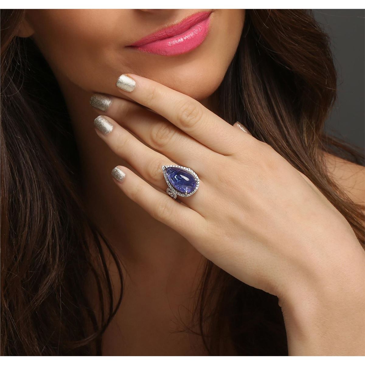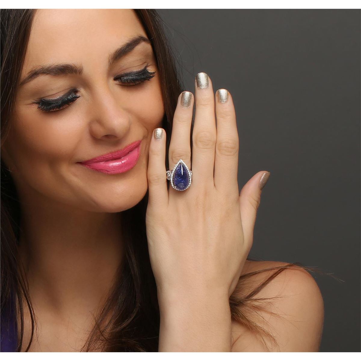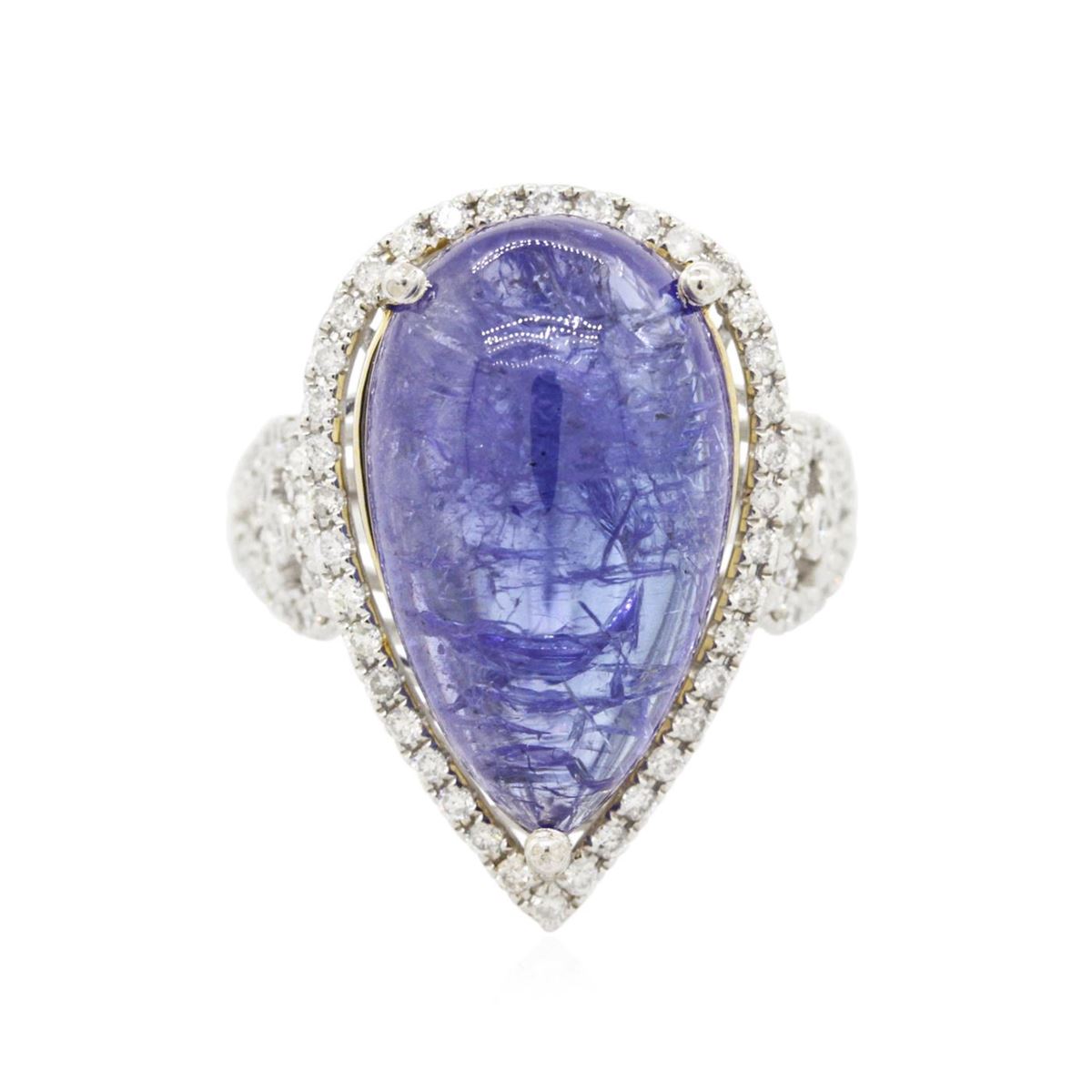 One electronically tested 14KT white gold ladies cast tanzanite and diamond ring with a bright polish finish. The featured tanzanite is set within a yellow gold basket and placed within a diamond bezel supported by elaborate diamond set shoulders, completed by a three millimeter wide band. Identified with markings of "14K". Condition is new, good workmanship. Containing: One prong set pear cabochon cut natural tanzanite, measuring 20.00 x 11.80 x 7.70mm, 6% bulge factor, approximate weight of 17.42ct., clarity is heavily included, type I, medium dark, moderately strong, bluish violet color, (GIA bV 6/4), cut is good. Transmitting light somewhat diffusely, translucent. Naturally occurring internal &external characteristics are present. Colored Stone Grading Report attached. Graded in the setting. Tanzanite is a very rare gemstone that is only found in the country of Tanzania. Originally discovered in 1967. Tiffany & Company, named the stone Tanzanite. It is found in the Usumburu Mountains that border the Umba Valley of northern Tanzania. Tanzanite occurs in gray, brown, violet, blue, reddish-purple, & green. The gem is interesting because of its exceptional pleochroism. Rotated in different directions a tanzanite will exhibit multiple changes of color. Tanzanite has a low tolerance to ultrasonic cleaning, and should not be cleaned using this method. Fifty-Eight prong and bezel set round brilliant cut diamonds, measuring 1.50 - 1.30 x 0.84mm (depth est.) approximate total weight of 58 Stones = 0.68ct. Graded in the setting. Clarity: SI-1 to I-1. Color: G - I. Total Weight of Colored Stones 17.42ct. Total Weight of Diamonds 0.68ct. Total Weight of Ring 8.79 grams. AIG Appraised at $8,340.00.