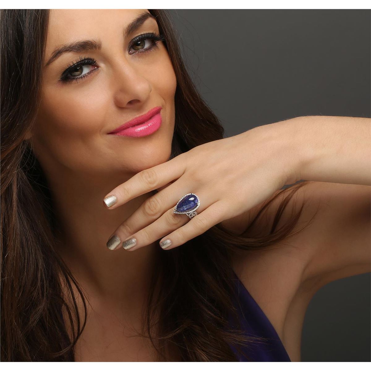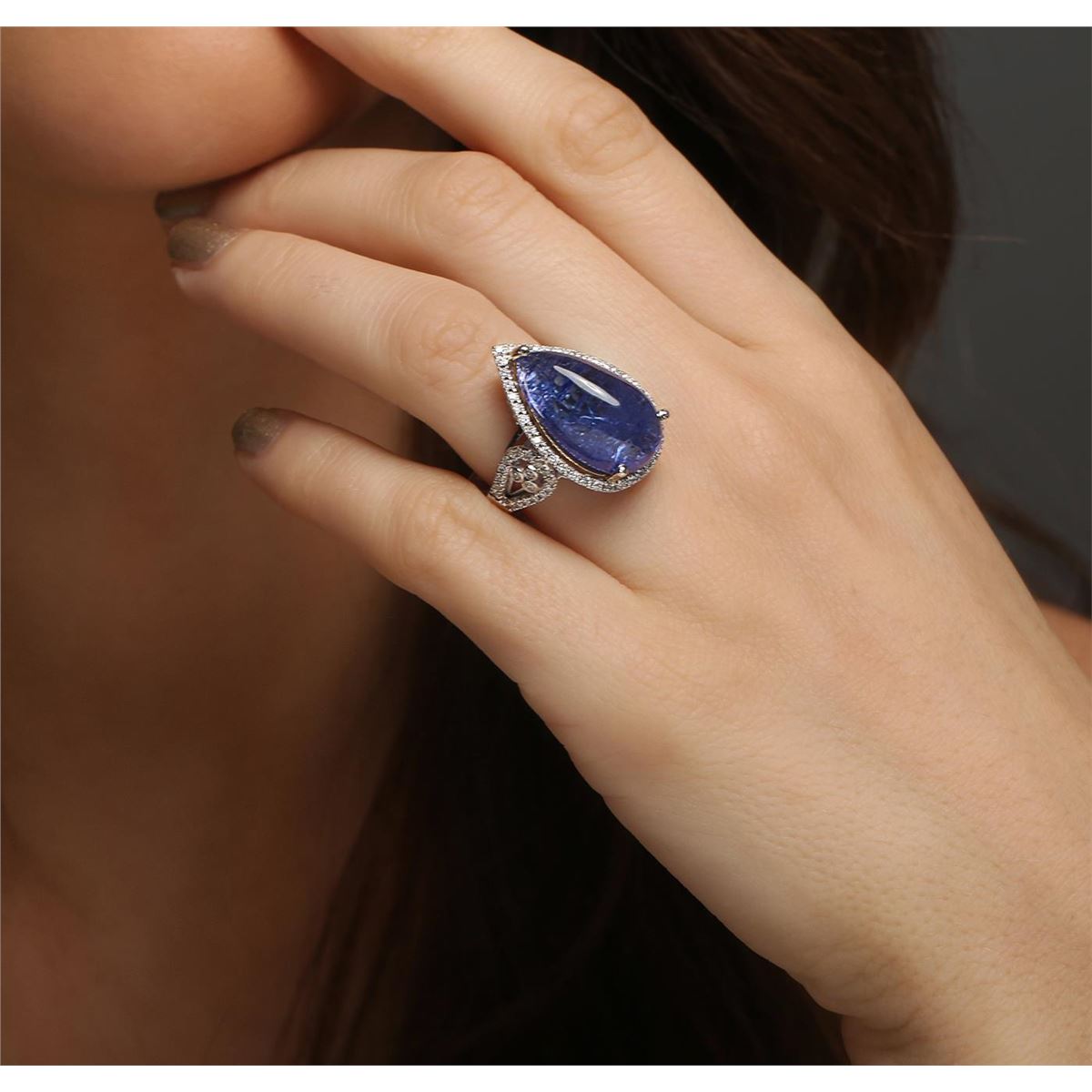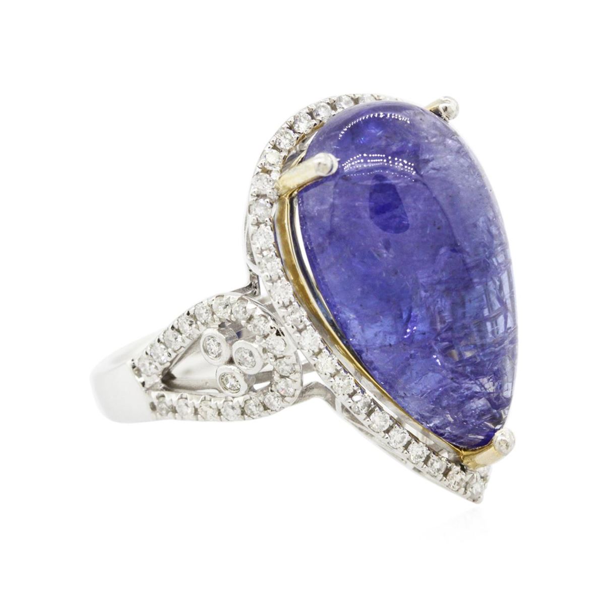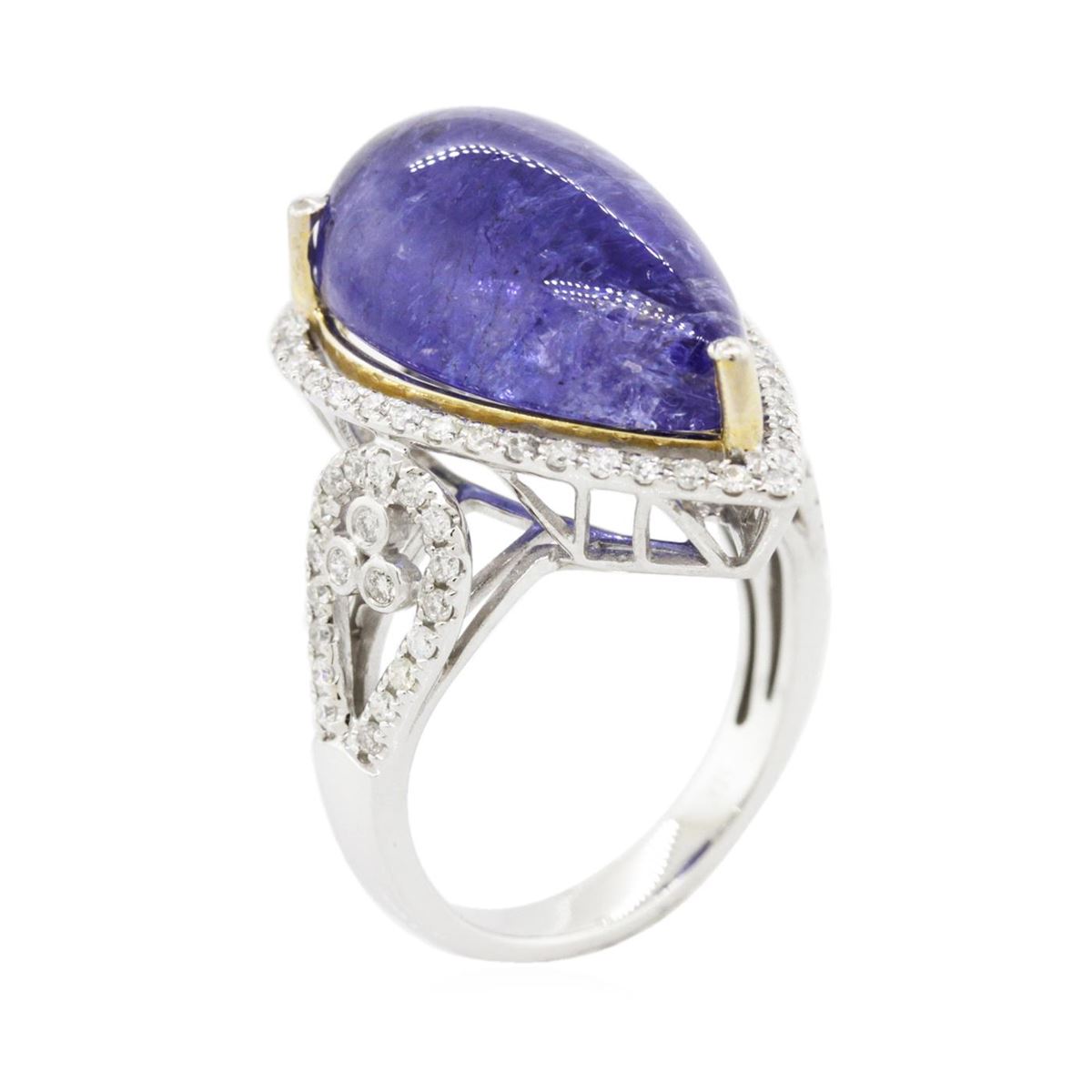 One electronically tested 14KT white gold ladies cast tanzanite and diamond ring with a bright polish finish. The featured tanzanite is set within a yellow gold basket and placed within a diamond bezel supported by elaborate diamond set shoulders, completed by a three millimeter wide band. Identified with markings of "14K". Condition is new, good workmanship. Containing: One prong set pear cabochon cut natural tanzanite, measuring 20.00 x 11.80 x 7.70mm, 6% bulge factor, approximate weight of 17.42ct., clarity is heavily included, type I, medium dark, moderately strong, bluish violet color, (GIA bV 6/4), cut is good. Transmitting light somewhat diffusely, translucent. Naturally occurring internal &external characteristics are present. Colored Stone Grading Report attached. Graded in the setting. Tanzanite is a very rare gemstone that is only found in the country of Tanzania. Originally discovered in 1967. Tiffany & Company, named the stone Tanzanite. It is found in the Usumburu Mountains that border the Umba Valley of northern Tanzania. Tanzanite occurs in gray, brown, violet, blue, reddish-purple, & green. The gem is interesting because of its exceptional pleochroism. Rotated in different directions a tanzanite will exhibit multiple changes of color. Tanzanite has a low tolerance to ultrasonic cleaning, and should not be cleaned using this method. Fifty-Eight prong and bezel set round brilliant cut diamonds, measuring 1.50 - 1.30 x 0.84mm (depth est.) approximate total weight of 58 Stones = 0.68ct. Graded in the setting. Clarity: SI-1 to I-1. Color: G - I. Total Weight of Colored Stones 17.42ct. Total Weight of Diamonds 0.68ct. Total Weight of Ring 8.79 grams. AIG Appraised at $8,340.00.