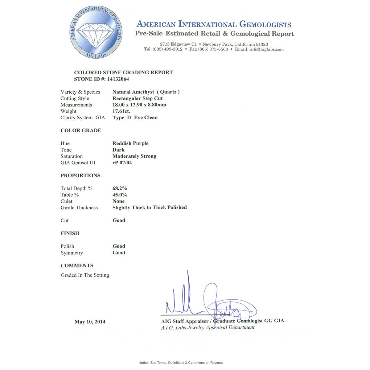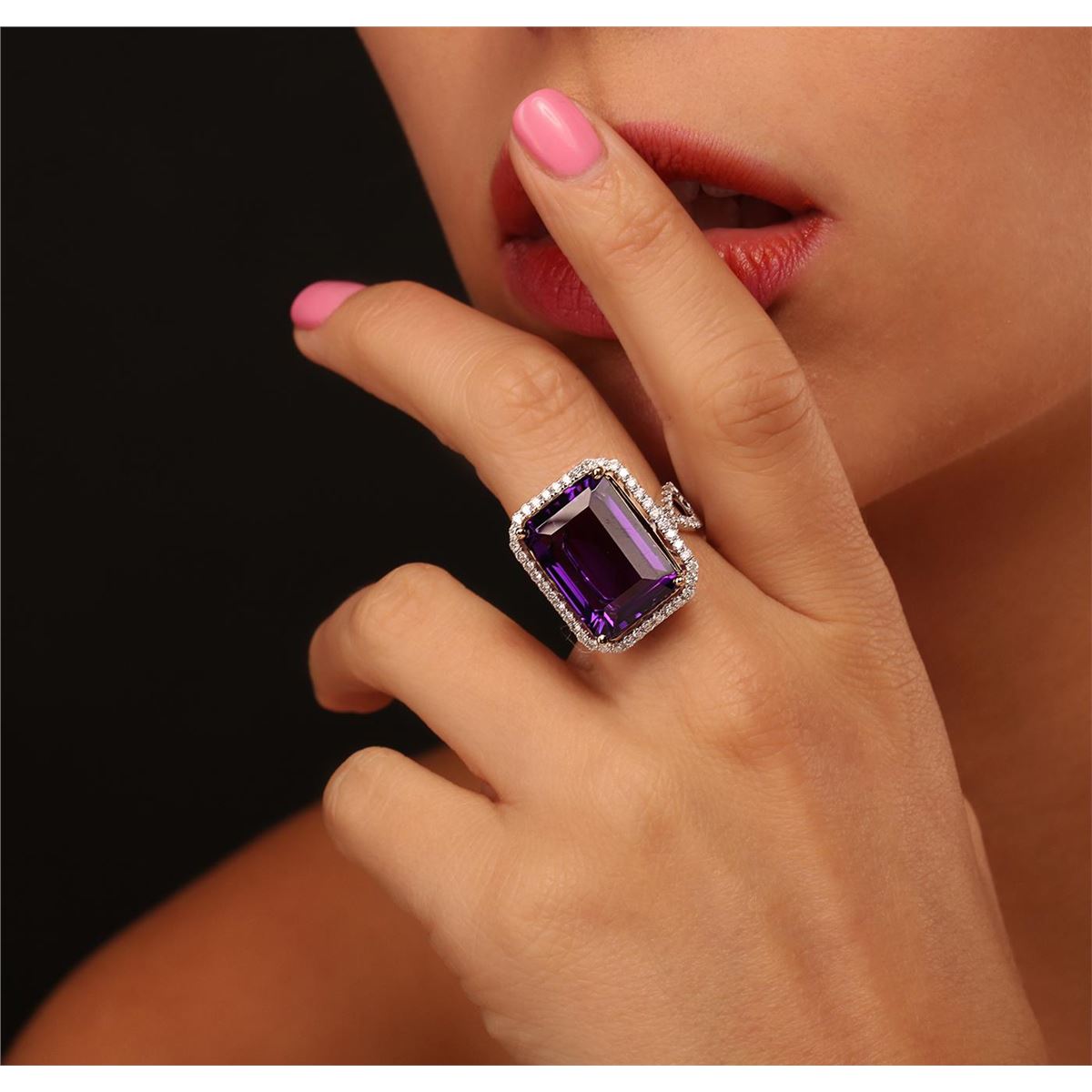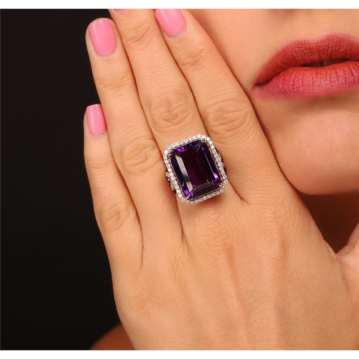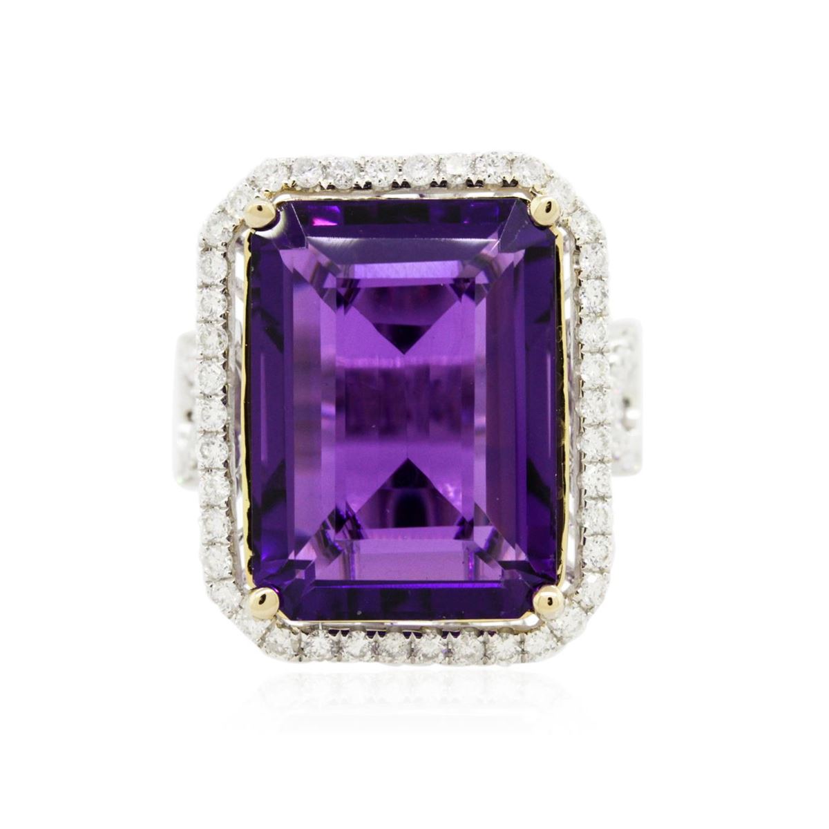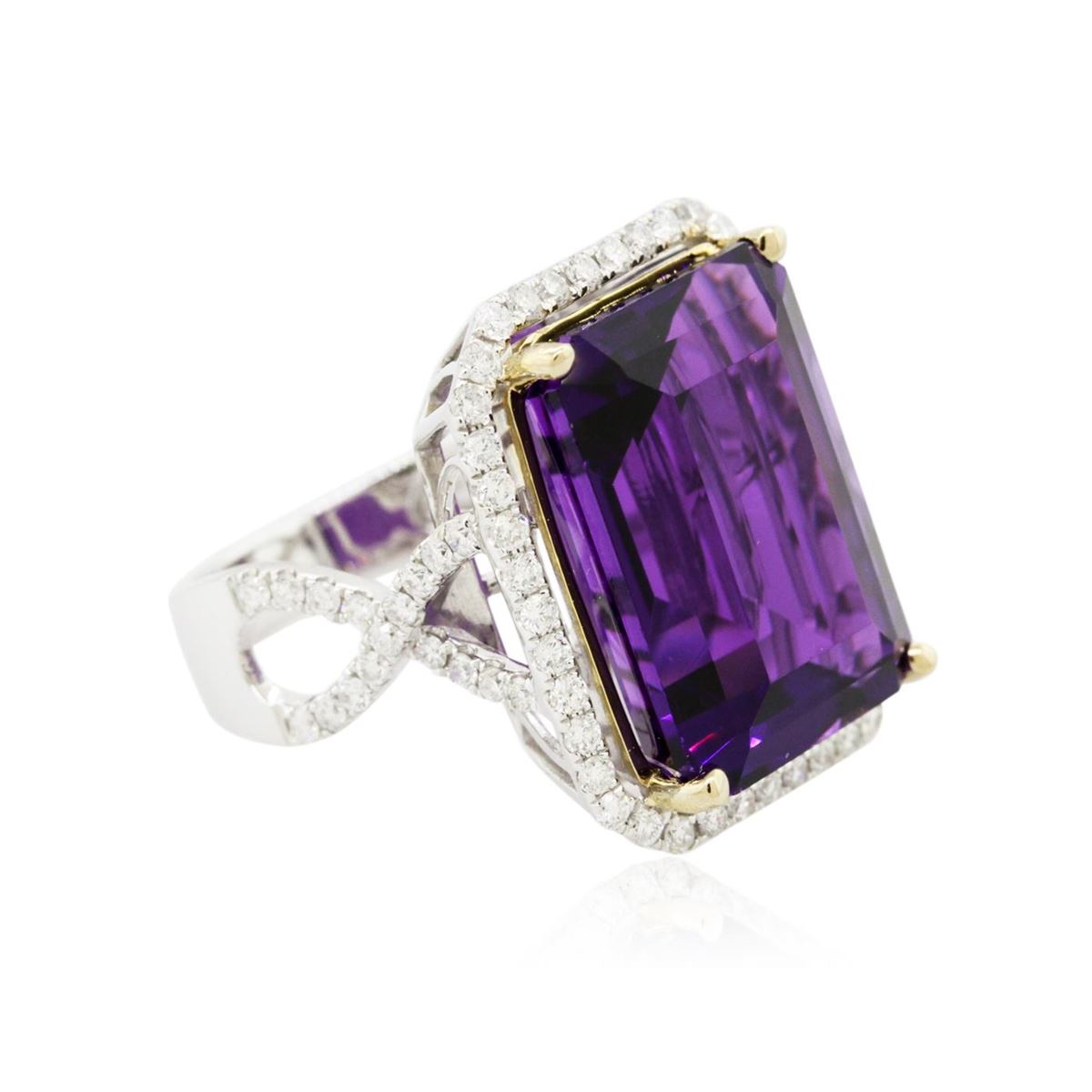 One electronically tested 14KT white gold ladies cast amethyst and diamond ring with a bright polish finish. Condition is new, good workmanship. The featured amethyst is set within a diamond bezel supported by intertwining diamond set shoulders, completed by a three and one-half millimeter wide band. Identified with markings of "14K". Containing: One prong set rectangular step cut natural amethyst, measuring 18.00 x 12.90 x 8.80mm, 8%. bulge factor, approximate weight of 17.61ct., clarity is eye clean, type II, dark, moderately strong, reddish purple color, (GIA rP 7/4), cut is good. Transmitting light with no distortion, transparent. Colored Stone Grading Report attached. Graded in the setting. Seventy-Six prong set round brilliant cut diamonds, measuring 1.60 - 1.50 x 0.93mm (depth est.) approximate. Total Weight of 76 Stones = 1.13ct. Graded in the setting. Clarity: SI-1 to I-1. Color: G - I. Total Weight of Colored Stones 17.61ct. Total Weight of Diamonds 1.13ct. Total Weight of Ring 10.39grams. AIG Appraised at $5,645.00.