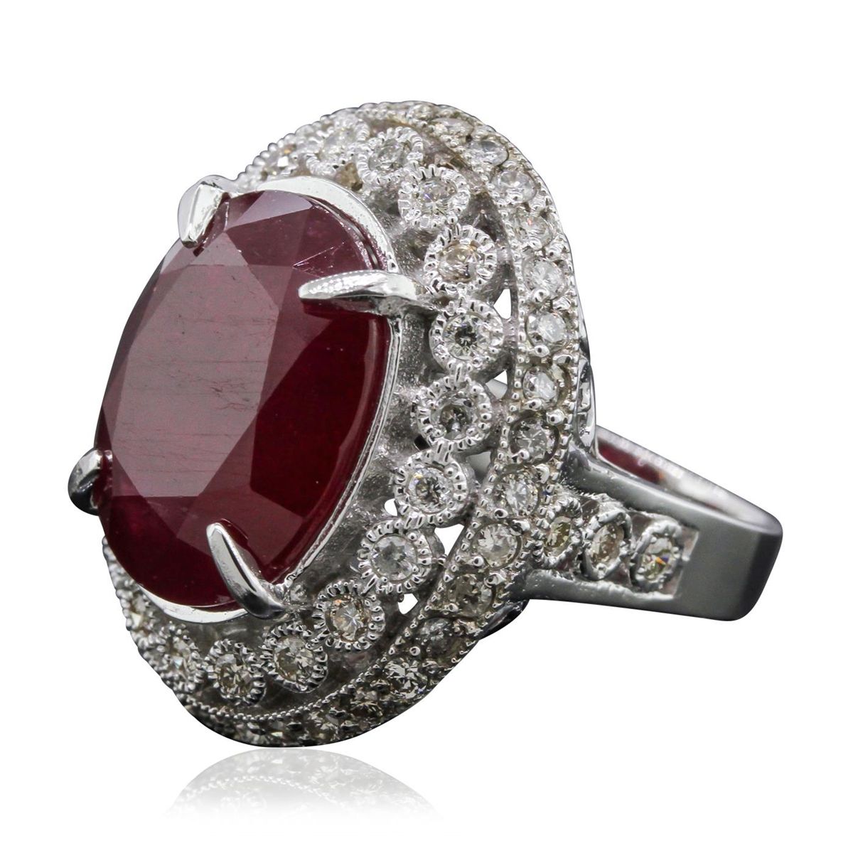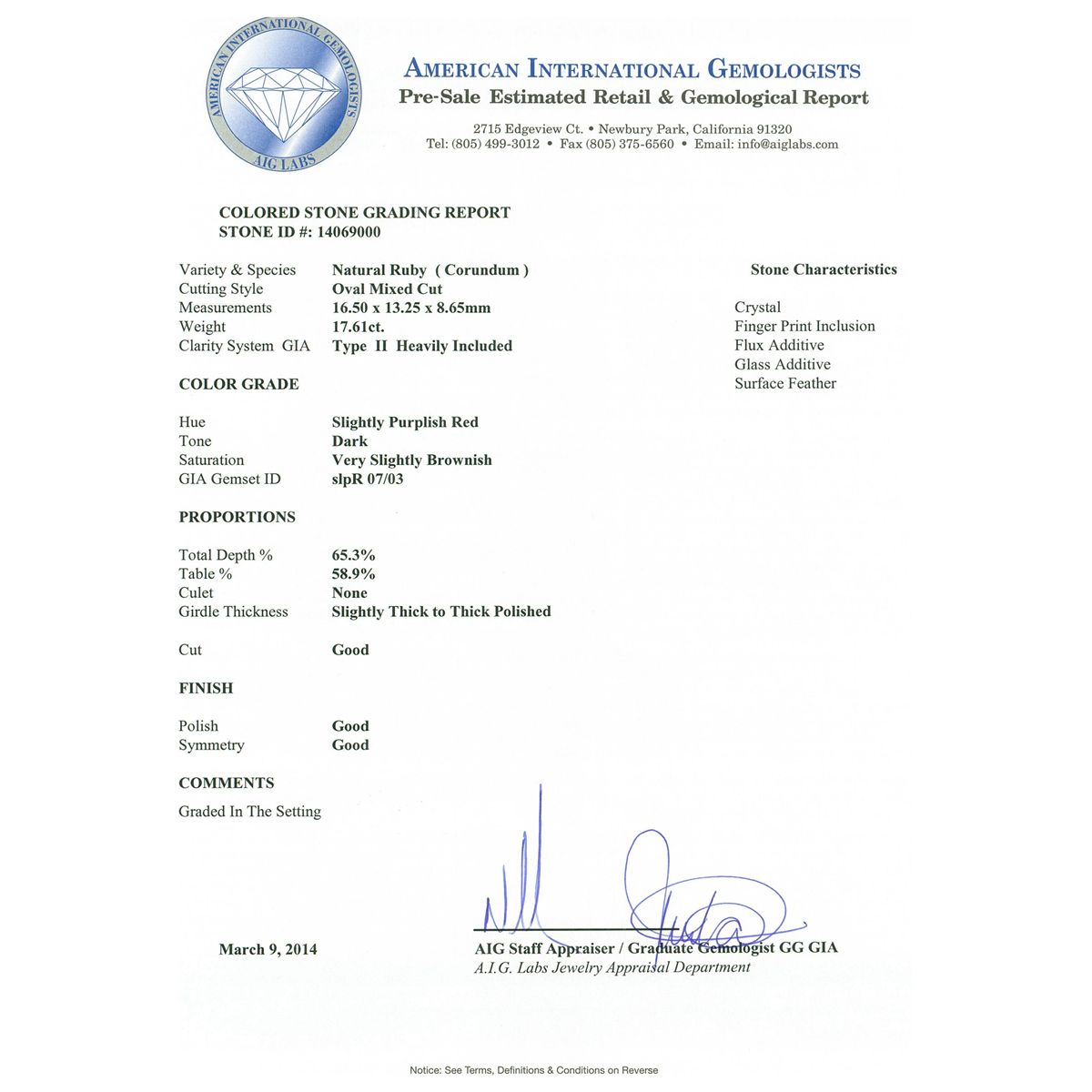 One electronically tested 14KT white gold ladies cast ruby and diamond ring. The featured ruby is set within a diamond lattice gallery supported by diamond set shoulders, complete by a three and one-half millimeter wide band. Bright polish finish with milgrain detailing throughout. Identified with markings of "K14". Condition is new, good workmanship. Containing: One prong set oval mixed cut natural ruby, measuring 16.50 x 13.25 x 8.65mm, 15%. bulge factor, approximate weight of 17.61ct., clarity is heavily included, type II, dark, very slightly brownish, slightly purplish red color, (GIA slpR 7/3), cut is good. Transmitting light somewhat diffusely, transparent to translucent. Naturally occurring internal & external characteristics are present. Indications of laboratory high temperature heat treatment, with glass & flux additives. Colored Stone Grading Report attached. Graded in the setting. Ruby has a low tolerance to rhodium plating, repolishing the surface, & ultrasonic cleaning. Sixty prong and bezel set round brilliant cut diamonds, measuring 1.90 - 1.80 x 1.11mm (depth est.) approximate. Total Weight of 60 Stones = 1.48ct. Graded in the setting. Clarity: SI-1 to I-1. Color: H - J. Total Weight of Colored Stones 17.61ct. Total Weight of Diamonds 1.48ct. AIG Appraised at $11,100.00.
