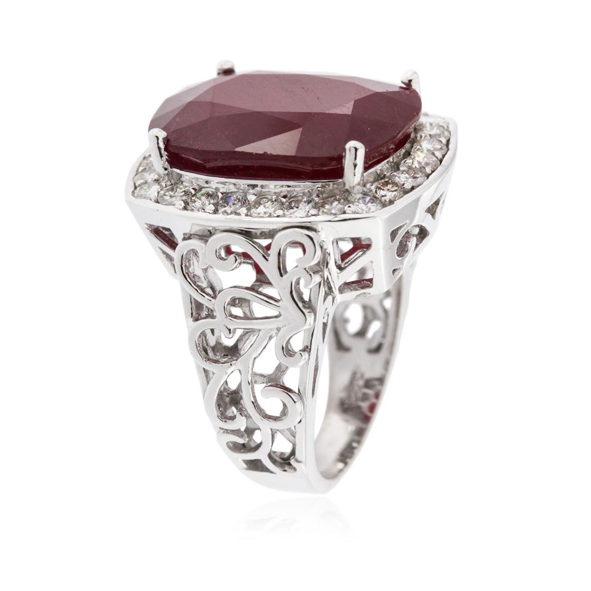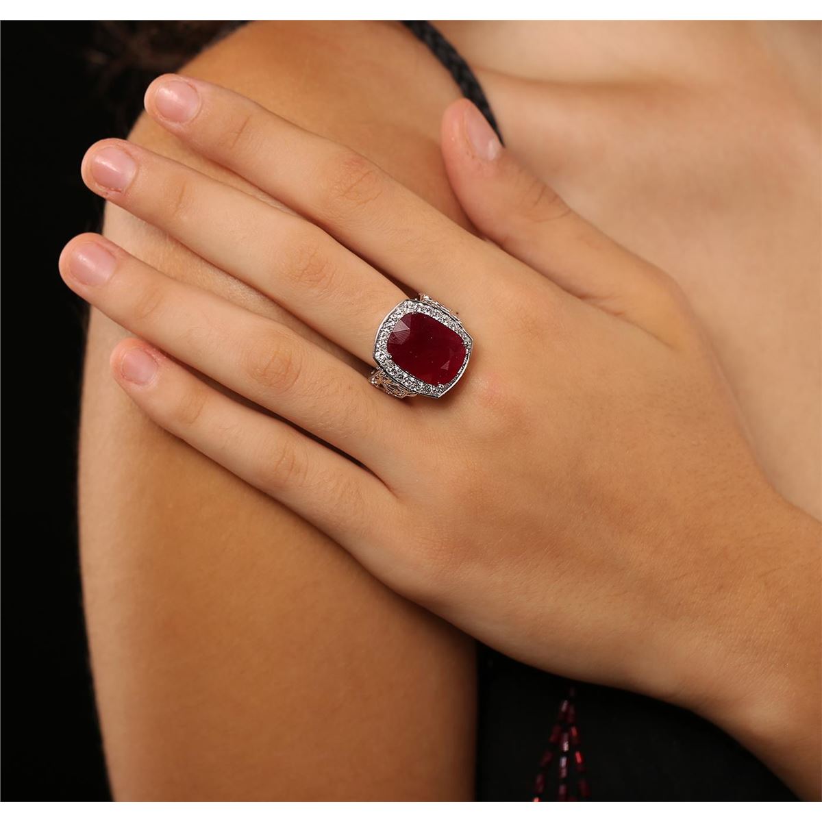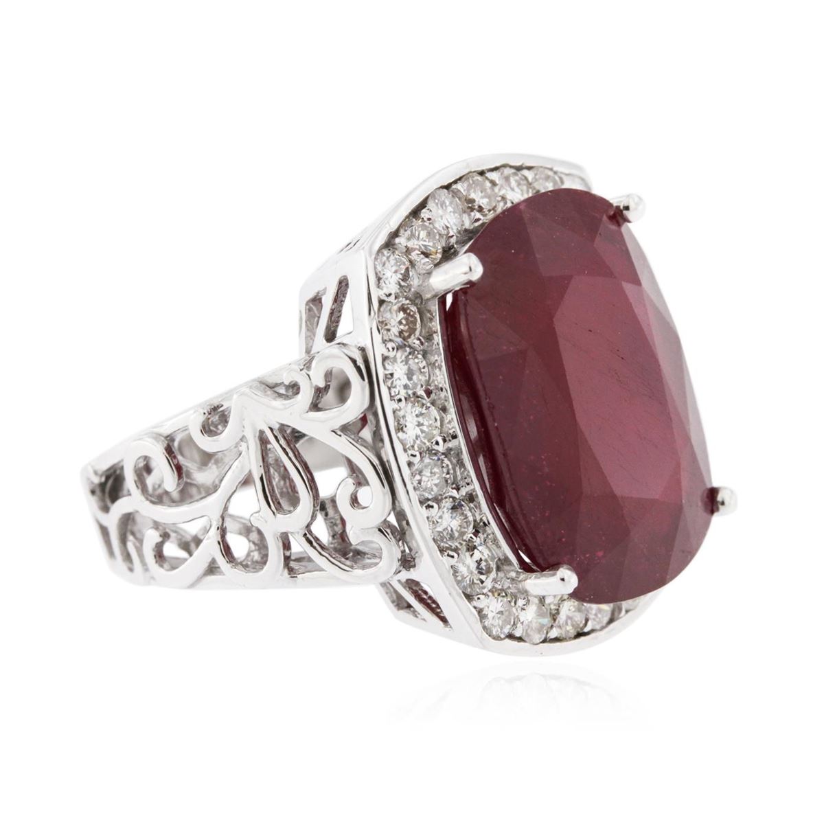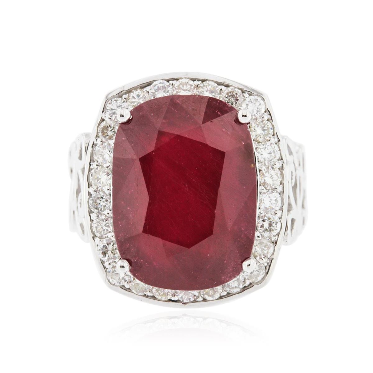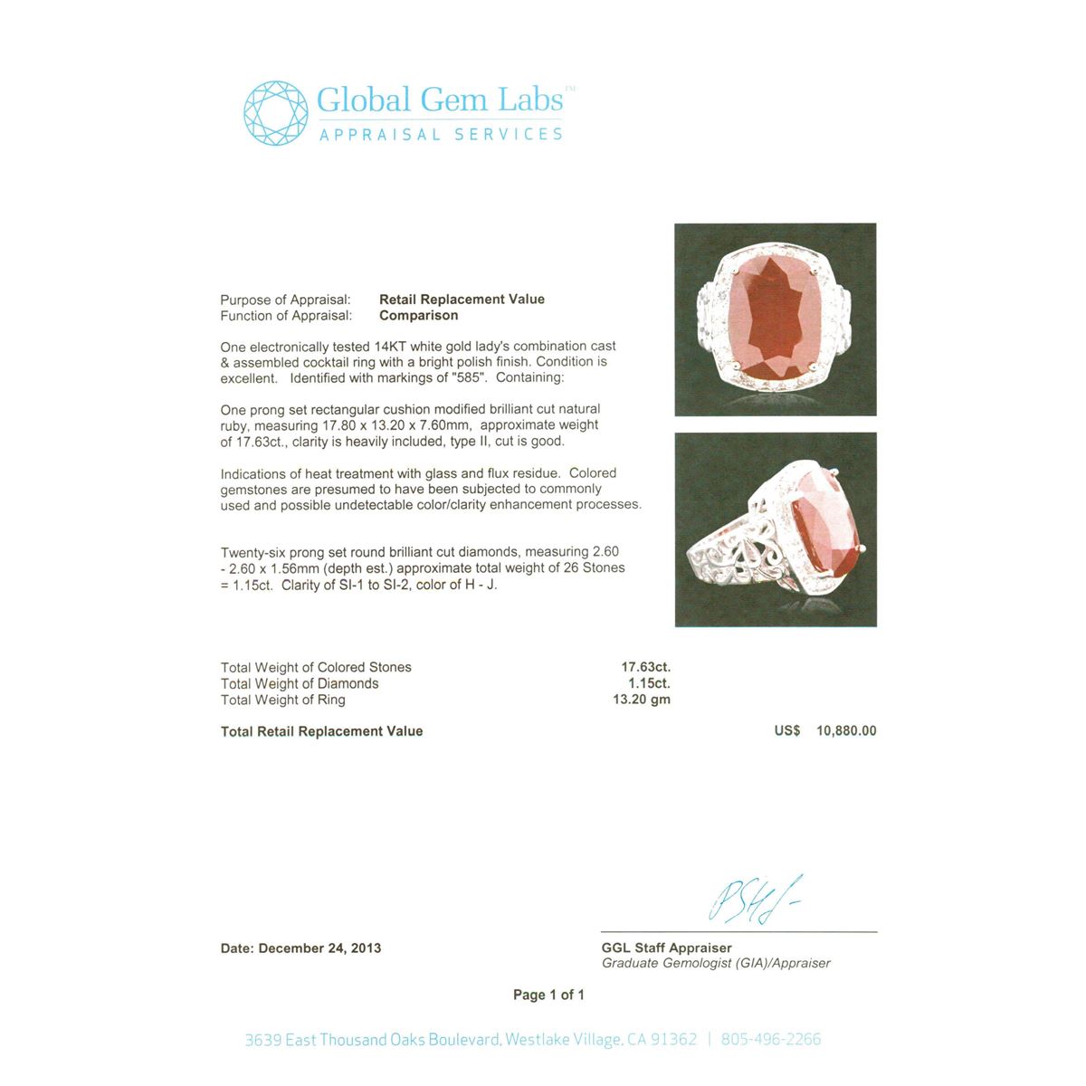 One electronically tested 14KT white gold Ladies combination cast & assembled cocktail ring with a bright polish finish. Identified with markings of "585". Condition is excellent. Containing: One prong set rectangular cushion modified brilliant cut natural ruby, measuring 17.80 x 13.20 x 7.60mm, approximate weight of 17.63ct., clarity is heavily included, type II, cut is good. Indications of heat treatment with glass and flux residue. Colored gemstones are presumed to have been subjected to commonly used and possible undetectable color/clarity enhancement processes. Twenty-Six prong set round brilliant cut diamonds, measuring 2.60 - 2.60 x 1.56mm (depth est.) approximate total weight of 26 Stones = 1.15ct. Clarity of SI-1 to SI-2, Color of H - J. Total Weight of Colored Stones 17.63ct. Total Weight of Diamonds 1.15ct. Total Weight of Ring 13.20gm. GGL Appraised at $10,880.00.