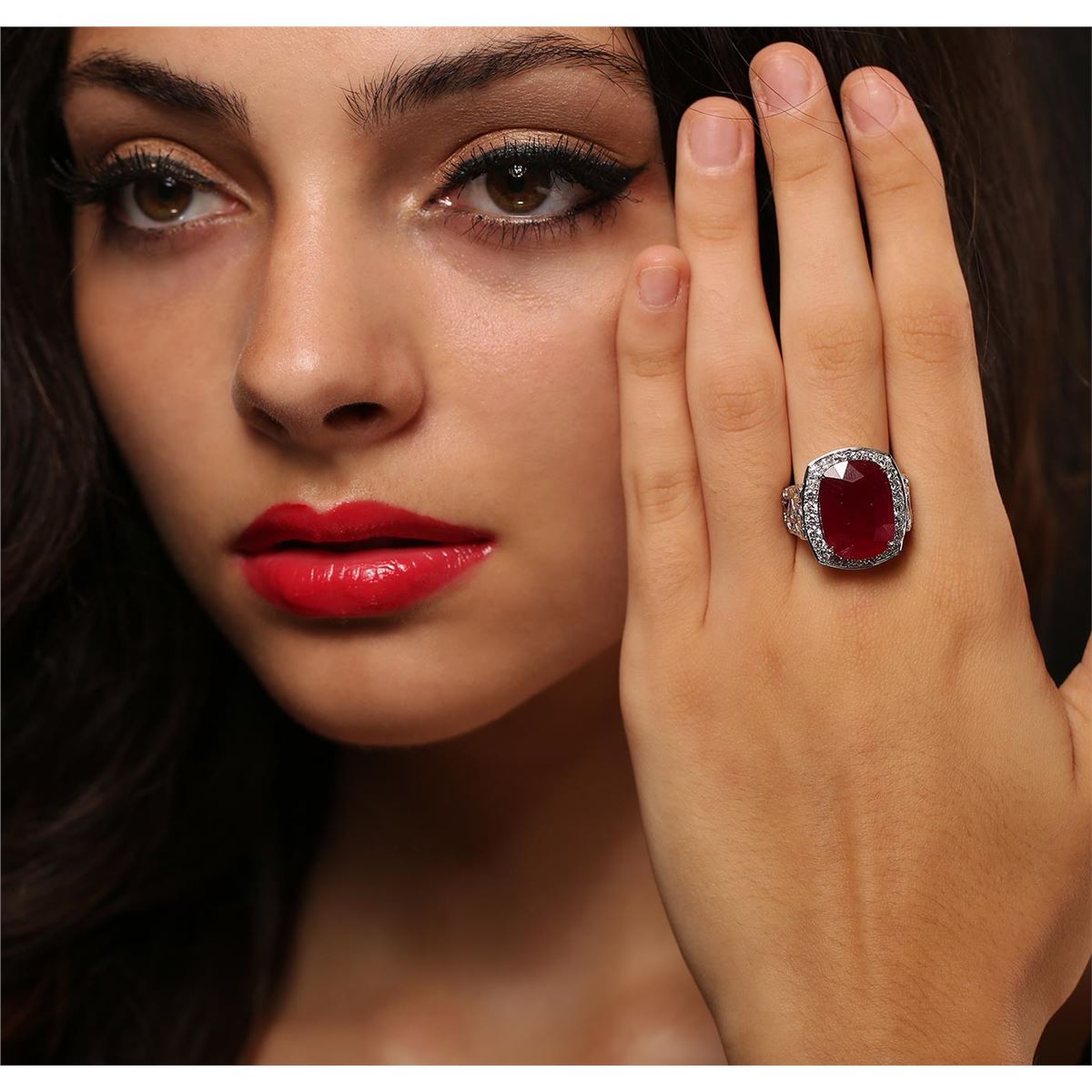 One electronically tested 14KT white gold Ladies combination cast & assembled cocktail ring with a bright polish finish. Identified with markings of "585". Condition is excellent. Containing: One prong set rectangular cushion modified brilliant cut natural ruby, measuring 17.80 x 13.20 x 7.60mm, approximate weight of 17.63ct., clarity is heavily included, type II, cut is good. Indications of heat treatment with glass and flux residue. Colored gemstones are presumed to have been subjected to commonly used and possible undetectable color/clarity enhancement processes. Twenty-Six prong set round brilliant cut diamonds, measuring 2.60 - 2.60 x 1.56mm (depth est.) approximate total weight of 26 Stones = 1.15ct. Clarity of SI-1 to SI-2, Color of H - J. Total Weight of Colored Stones 17.63ct. Total Weight of Diamonds 1.15ct. Total Weight of Ring 13.20gm. GGL Appraised at $10,880.00.