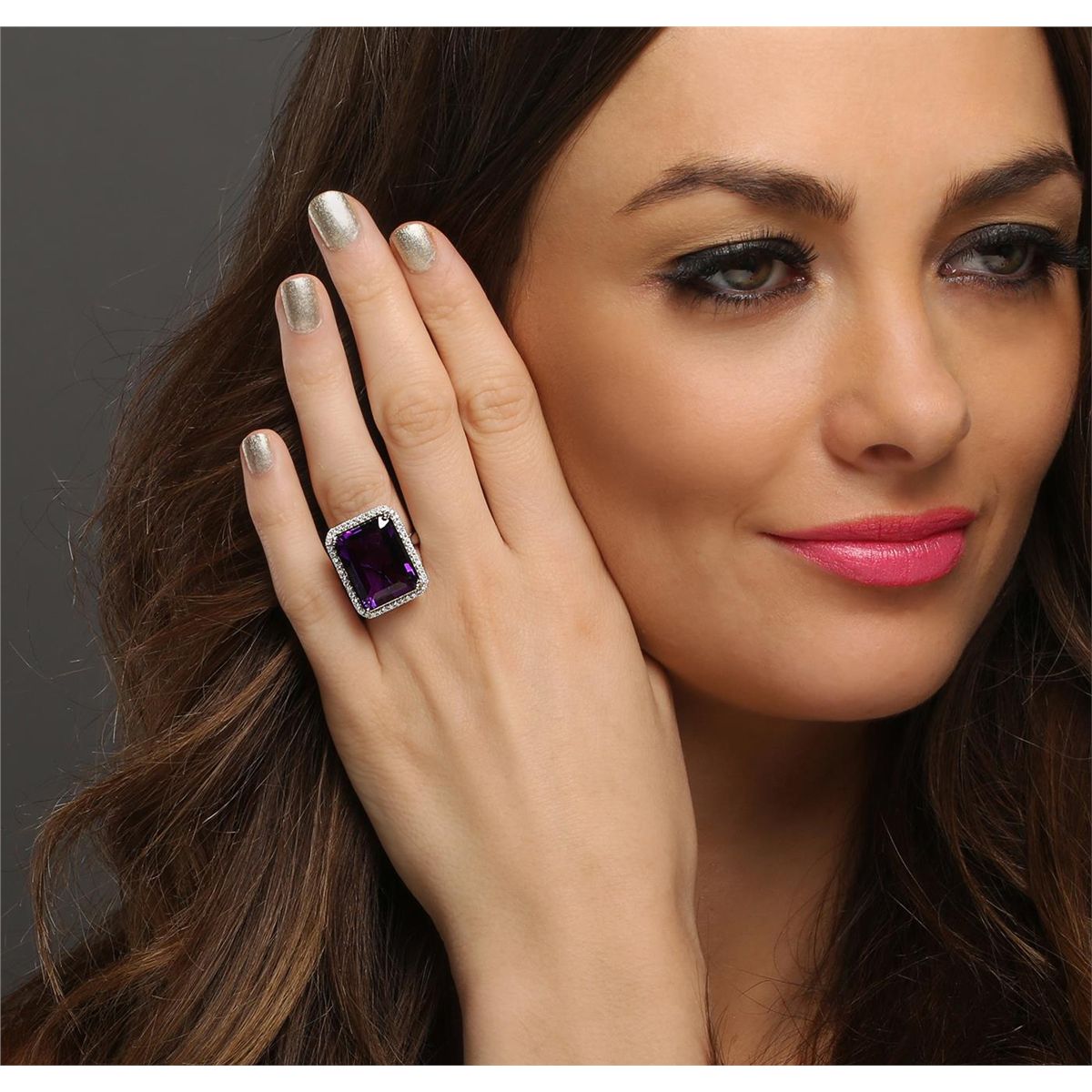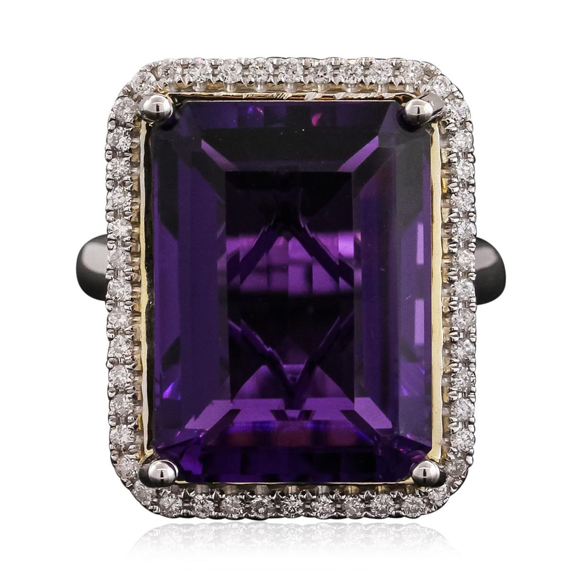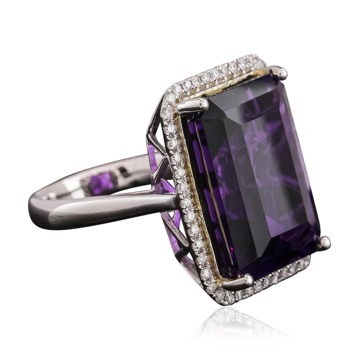 One electronically tested 14KT white gold ladies cast amethyst and diamond ring with a bright polish finish. The featured amethyst is set within a diamond bezel, completed by a three millimeter wide band. Identified with markings of "14K". Condition is new, good workmanship. Containing: One prong set rectangular step cut natural amethyst, measuring 18.50 x 13.50 x 8.90mm, approximate weight of 17.74ct., clarity is eye clean, type II, dark, very slightly grayish, reddish purple color, (GIA rP 7/3), cut is good. Transmitting light with no distortion, transparent. Colored Stone Grading Report attached. Graded in the setting. Forty-Eight prong set round brilliant cut diamonds, measuring 1.30 - 1.20 x 0.75mm (depth est.) approximate total weight of 48 Stones = 0.44ct. Graded in the setting. Clarity: SI-1 to I-1. Color: G - I. Total Weight of Colored Stones 17.74ct. Total Weight of Diamonds 0.44ct. Total Weight of Ring 9.76 grams. AIG Appraised at $3,355.00.
