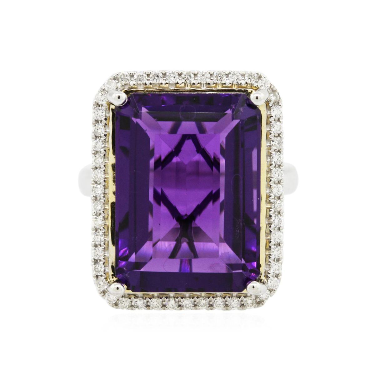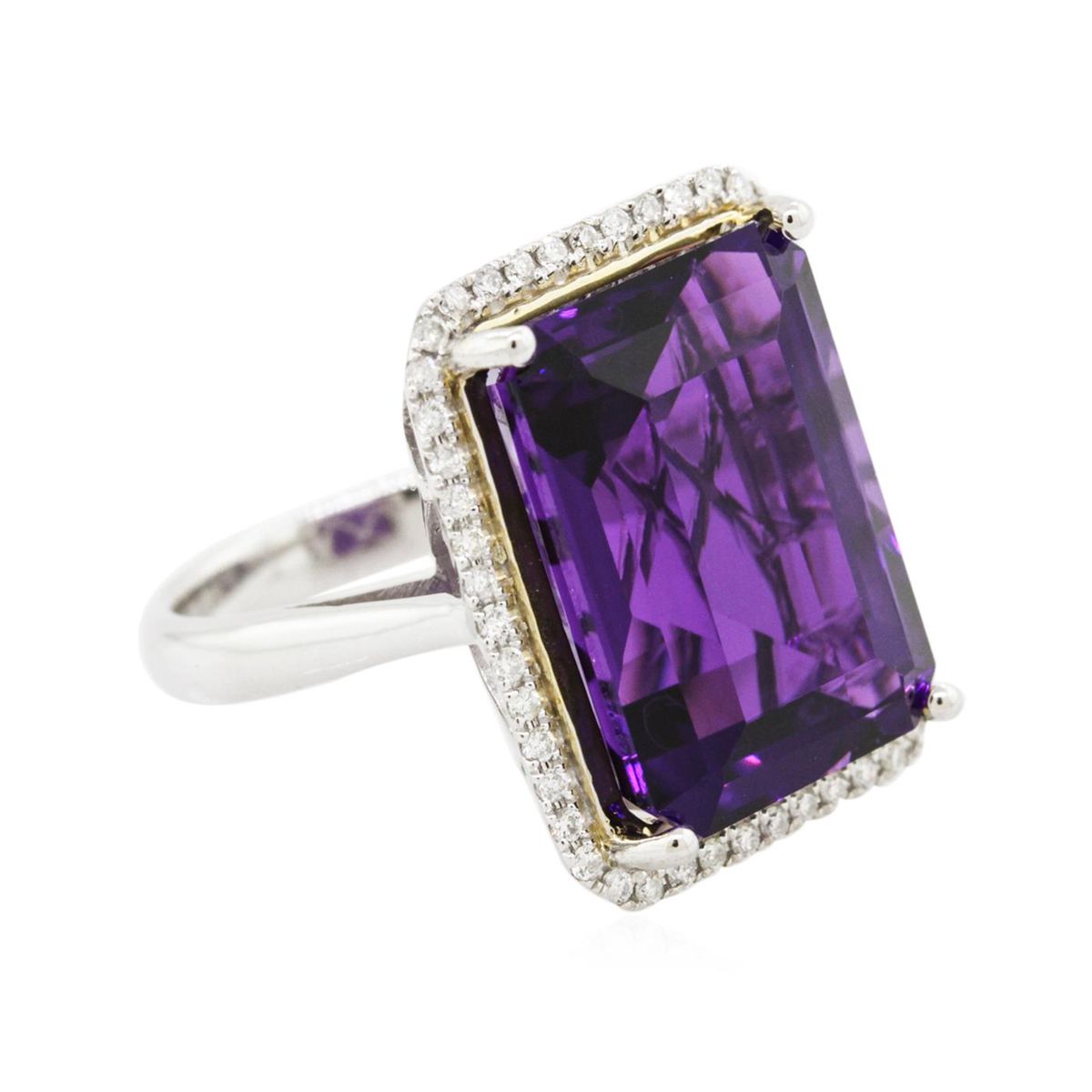 One electronically tested 14KT white gold ladies cast amethyst and diamond ring with a bright polish finish. The featured amethyst is set within a diamond bezel, completed by a three millimeter wide band. Identified with markings of "14K". Condition is new, good workmanship. Containing: One prong set rectangular step cut natural amethyst, measuring 18.50 x 13.50 x 8.90mm, approximate weight of 17.74ct., clarity is eye clean, type II, dark, very slightly grayish, reddish purple color, (GIA rP 7/3), cut is good. Transmitting light with no distortion, transparent. Colored Stone Grading Report attached. Graded in the setting. Forty-Eight prong set round brilliant cut diamonds, measuring 1.30 - 1.20 x 0.75mm (depth est.) approximate total weight of 48 Stones = 0.44ct. Graded in the setting. Clarity: SI-1 to I-1. Color: G - I. Total Weight of Colored Stones 17.74ct. Total Weight of Diamonds 0.44ct. Total Weight of Ring 9.76 grams. AIG Appraised at $3,355.00.