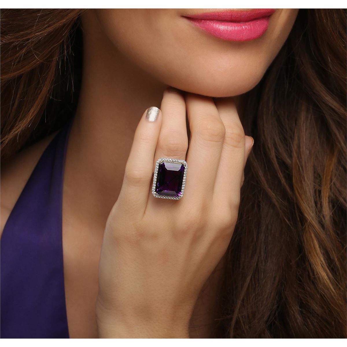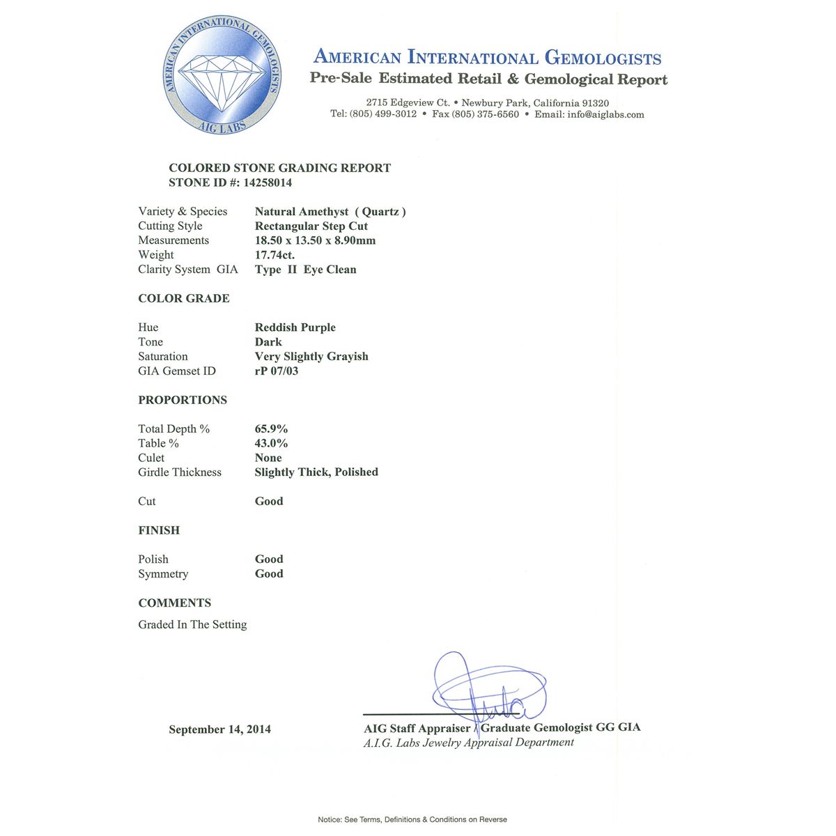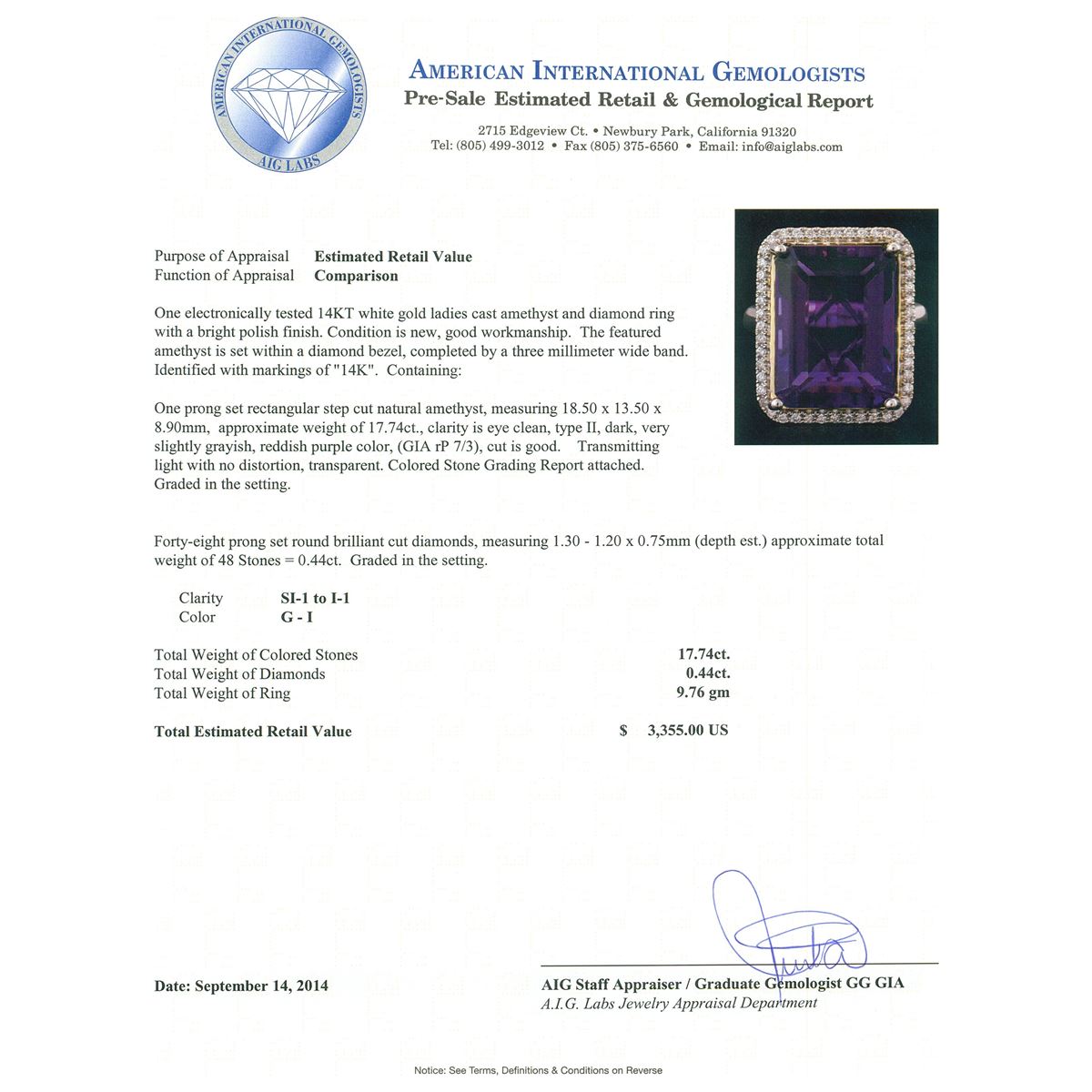 One electronically tested 14KT white gold ladies cast amethyst and diamond ring with a bright polish finish. The featured amethyst is set within a diamond bezel, completed by a three millimeter wide band. Identified with markings of "14K". Condition is new, good workmanship. Containing: One prong set rectangular step cut natural amethyst, measuring 18.50 x 13.50 x 8.90mm, approximate weight of 17.74ct., clarity is eye clean, type II, dark, very slightly grayish, reddish purple color, (GIA rP 7/3), cut is good. Transmitting light with no distortion, transparent. Colored Stone Grading Report attached. Graded in the setting. Forty-Eight prong set round brilliant cut diamonds, measuring 1.30 - 1.20 x 0.75mm (depth est.) approximate total weight of 48 Stones = 0.44ct. Graded in the setting. Clarity: SI-1 to I-1. Color: G - I. Total Weight of Colored Stones 17.74ct. Total Weight of Diamonds 0.44ct. Total Weight of Ring 9.76 grams. AIG Appraised at $3,355.00.