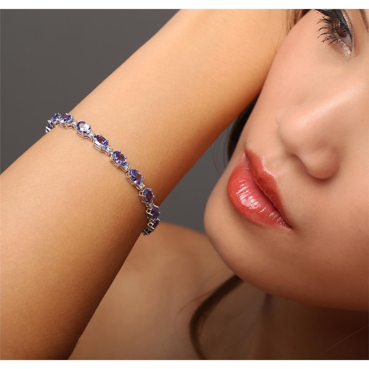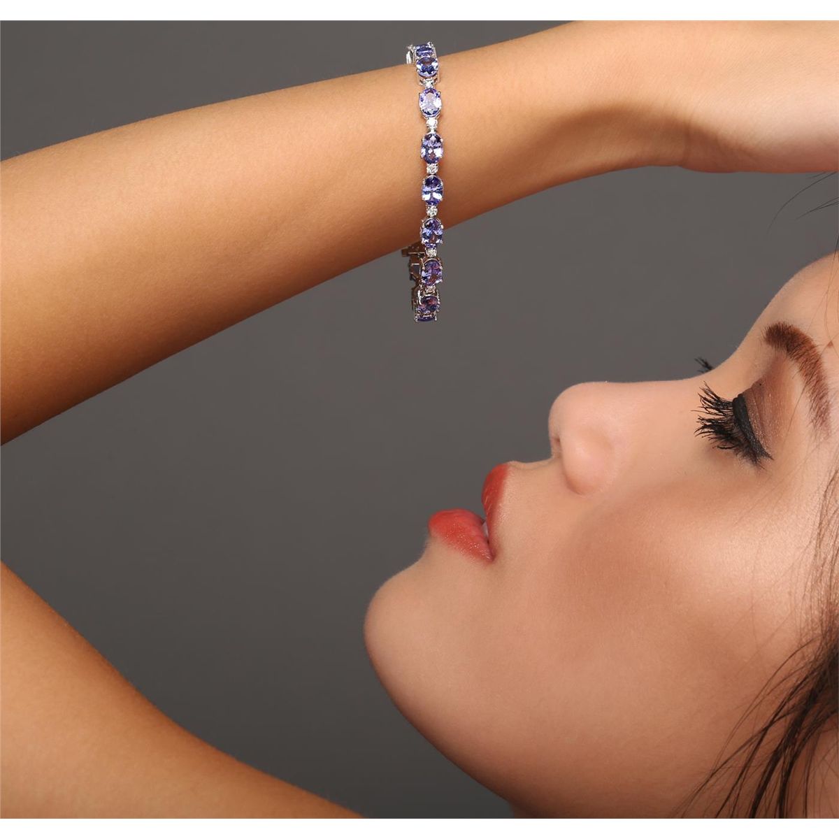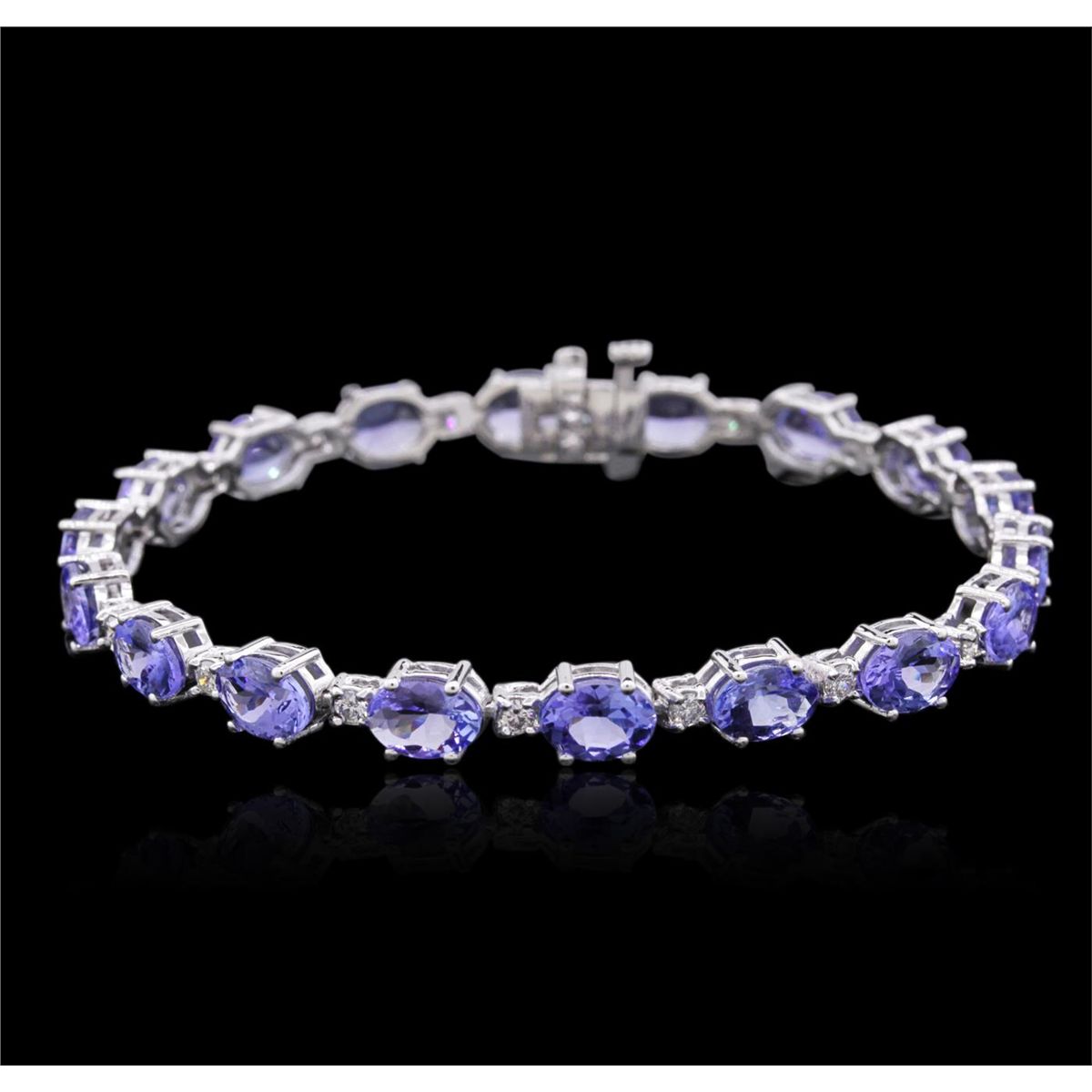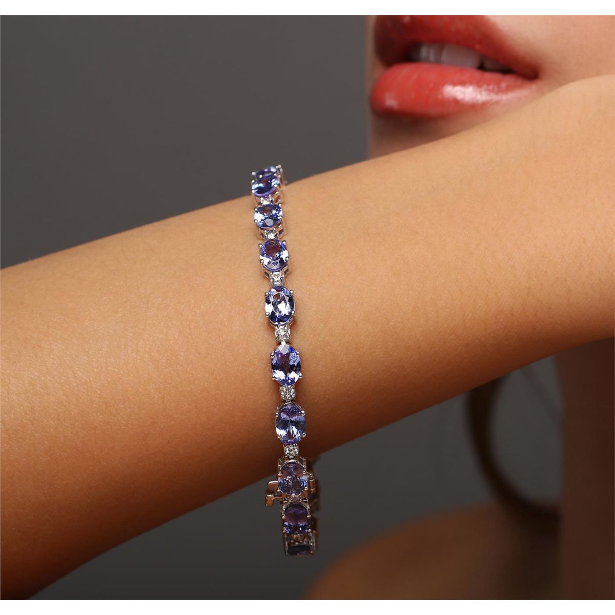 One electronically tested 14KT white gold ladies combination cast & assembled tanzanite and diamond bracelet with a bright polish finish. Measurements: 7" in length. Identified with markings of "14K". Condition is new. Containing: Eighteen prong set oval modified brilliant cut natural tanzanites, measuring 7.70 x 4.97 x 3.69mm, approximate total weight of 17.82ct., clarity is eye clean, type I, medium light, very slightly grayish, violet color, (GIA V 4/3), cut is good. Eighteen prong set round brilliant cut diamonds, measuring 2.00 - 2.00 x 1.20mm (depth est.) approximate total weight of 18 Stones = 0.53ct. Clarity: SI-1 to SI-2. Color: J, Cut is Good. Colored gemstones are presumed to have been subjected to commonly used enhancement processes. All diamonds and colored gemstones are graded in the mounting, unless otherwise stated. Total Weight of Colored Stones 17.82ct. Total Weight of Diamonds 0.53ct. Total Weight of Bracelet 11.20 grams. GGL Appraised at $10,185.00.