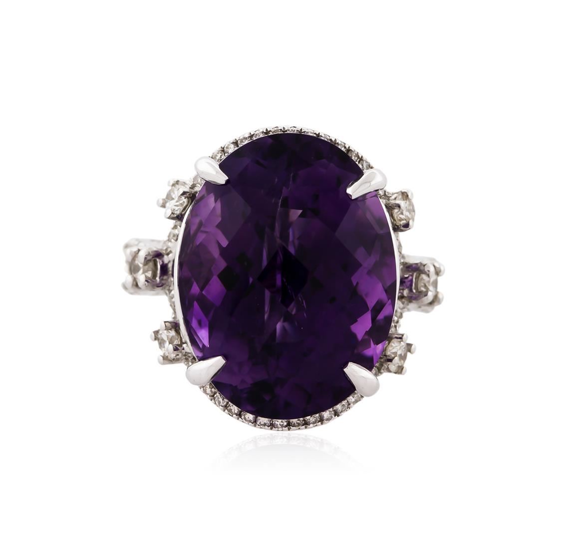 One 14KT white gold amethyst and diamond ring. An oval cut amethyst gemstone is prong mounted in the center of the ring with a total weight of 17.85ct. 96 round brilliant cut diamonds accent the ring around the center gemstone and on both sides with a total weight of 0.68. The ring is cast stamped "14K" and has a gross weight of 6.50 Grams. GGA Appraised at $6,490.00.