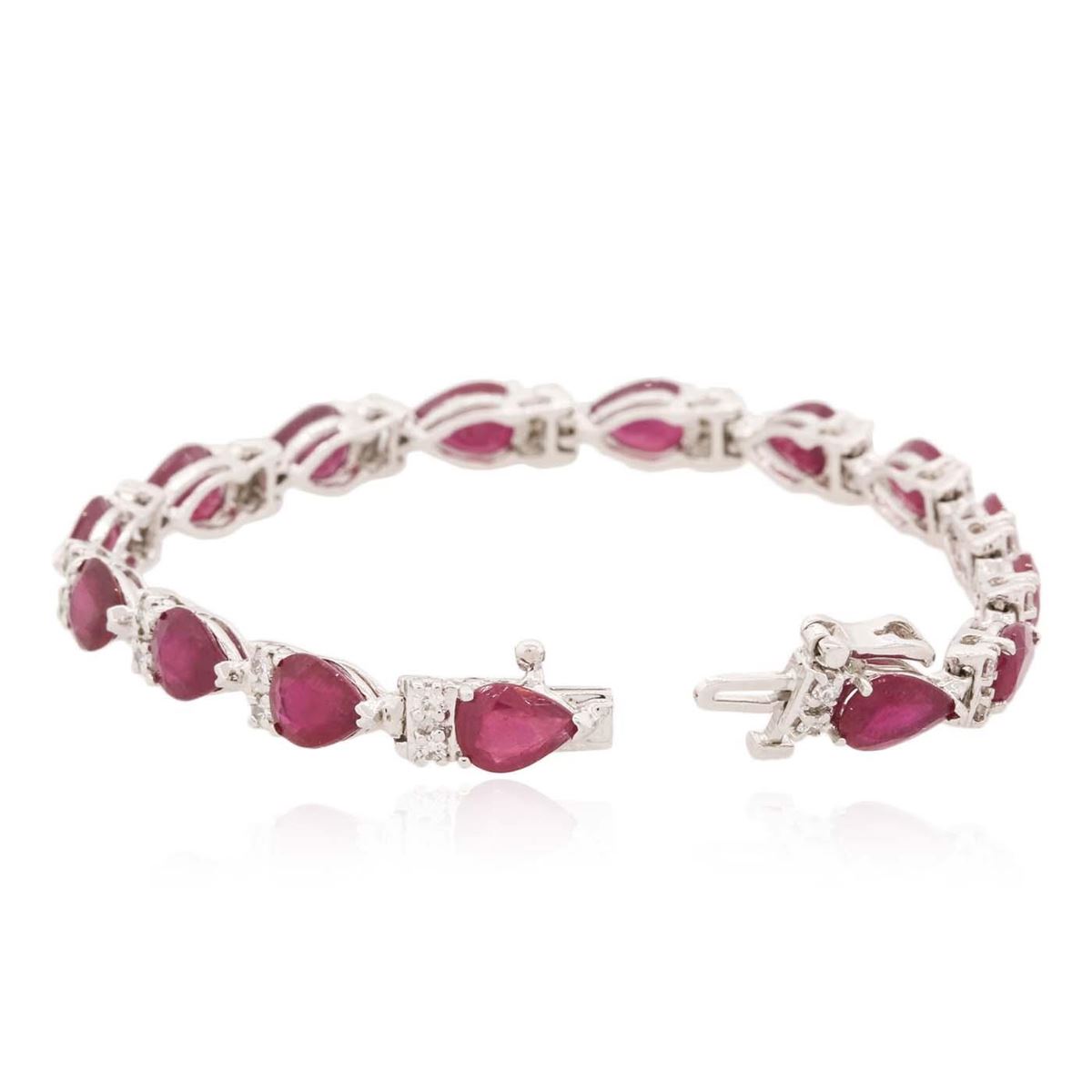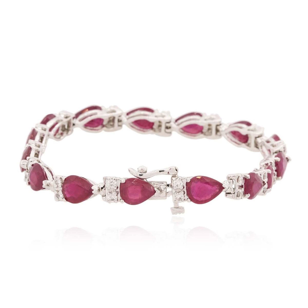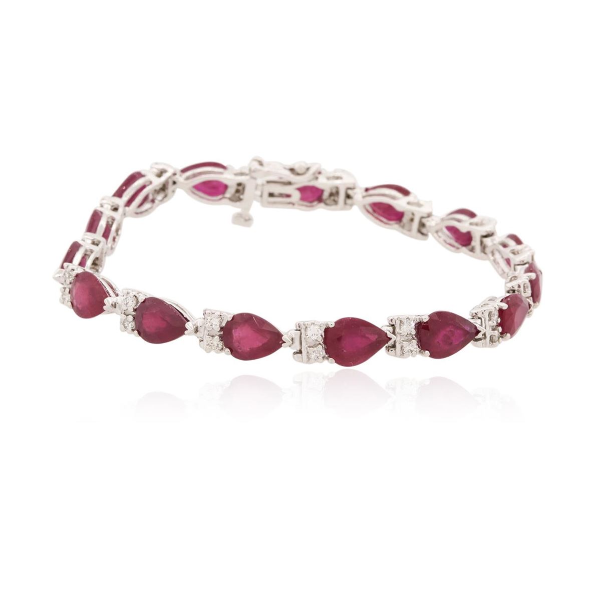 One electronically tested 14KT white gold ladies cast & assembled ruby and diamond bracelet. Seven inch length bracelet features a flexible ruby and diamond duo ribbon, terminating in a concealed clasp with safety. Bright polish finish. Identified with markings of "14K". Condition is new, good workmanship. Containing: Fifteen prong set pear mixed cut natural rubies, measuring 8.00 x 6.00 x 3.00mm, 5%. bulge factor, approximate total weight of 18.15ct., clarity is heavily included, type II, medium dark, very slightly brownish, slightly purplish red color, (GIA slpR 6/3), cut is good. Transmitting light somewhat diffusely, transparent to translucent. Naturally occurring internal & external characteristics are present. Indications of laboratory high temperature heat treatment, with glass & flux additives. Measurements & the color grade are an average for the group. Graded in the setting. Ruby has a low tolerance to rhodium plating, repolishing the surface, & ultrasonic cleaning. Thirty bead set round brilliant cut diamonds, measuring 1.90 - 1.80 x 1.11mm (depth est.) approximate total weight of 30 Stones = 0.80ct. Graded in the setting. Clarity: VS-2 to SI-1. Color: G - I. Total Weight of Colored Stones 18.15ct. Total Weight of Diamonds 0.80ct. Total Weight of Bracelet 13.84 grams. AIG Appraised at $6,930.00.