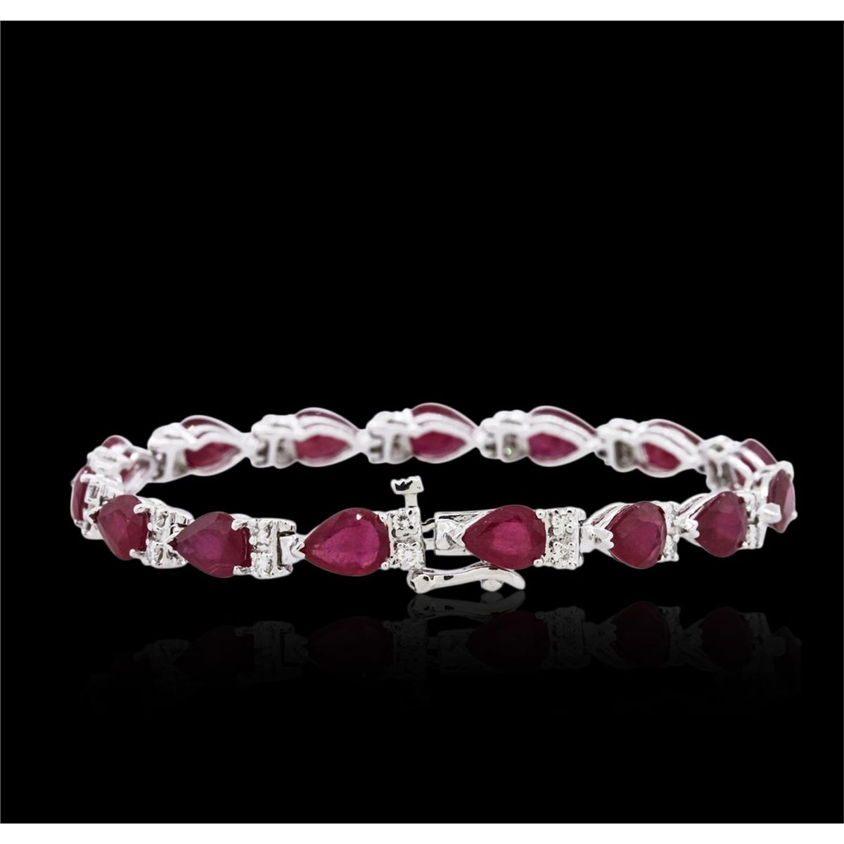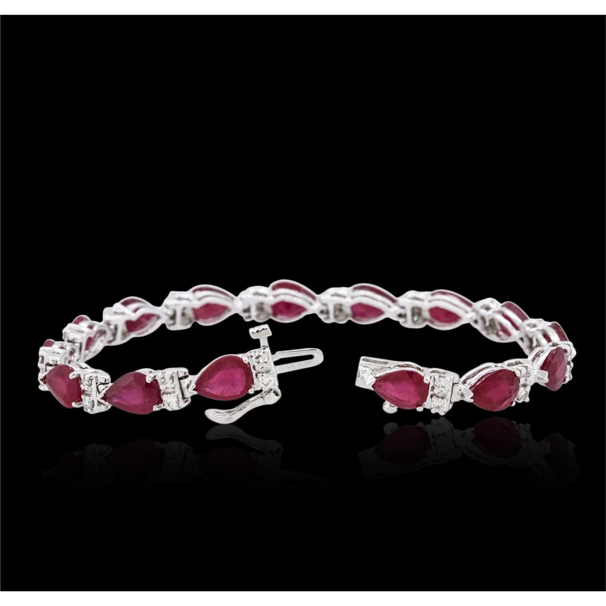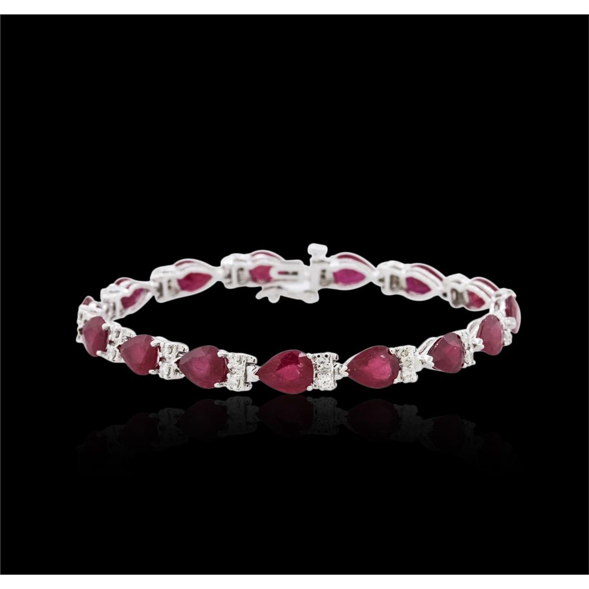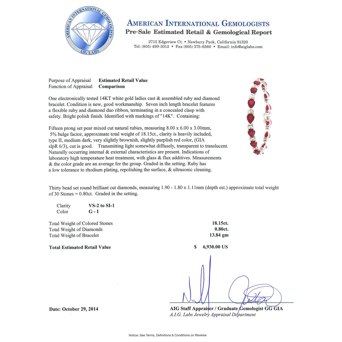 One electronically tested 14KT white gold ladies cast & assembled ruby and diamond bracelet. Seven inch length bracelet features a flexible ruby and diamond duo ribbon, terminating in a concealed clasp with safety. Bright polish finish. Identified with markings of "14K". Condition is new, good workmanship. Containing: Fifteen prong set pear mixed cut natural rubies, measuring 8.00 x 6.00 x 3.00mm, 5%. bulge factor, approximate total weight of 18.15ct., clarity is heavily included, type II, medium dark, very slightly brownish, slightly purplish red color, (GIA slpR 6/3), cut is good. Transmitting light somewhat diffusely, transparent to translucent. Naturally occurring internal & external characteristics are present. Indications of laboratory high temperature heat treatment, with glass & flux additives. Measurements & the color grade are an average for the group. Graded in the setting. Ruby has a low tolerance to rhodium plating, repolishing the surface, & ultrasonic cleaning. Thirty bead set round brilliant cut diamonds, measuring 1.90 - 1.80 x 1.11mm (depth est.) approximate total weight of 30 Stones = 0.80ct. Graded in the setting. Clarity: VS-2 to SI-1. Color: G - I. Total Weight of Colored Stones 18.15ct. Total Weight of Diamonds 0.80ct. Total Weight of Bracelet 13.84 grams. AIG Appraised at $6,930.00.