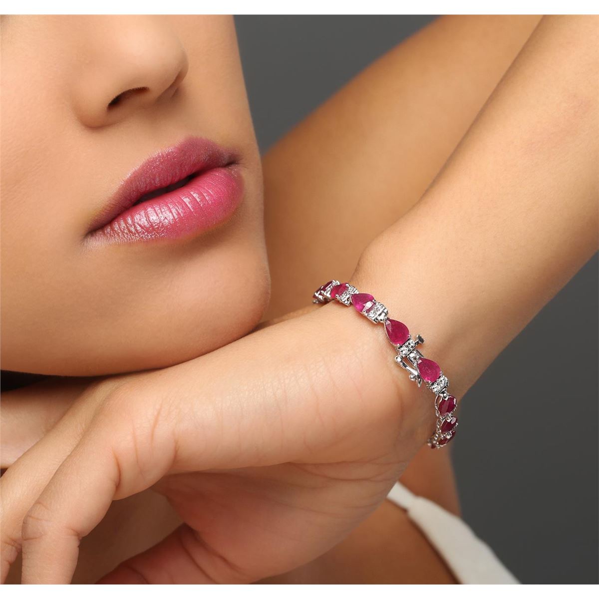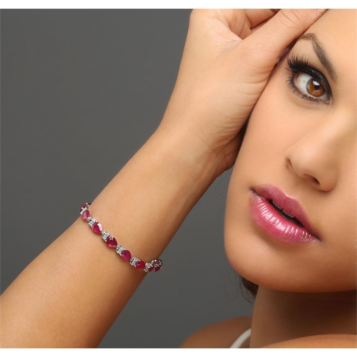 One electronically tested 14KT white gold ladies cast & assembled ruby and diamond bracelet. Seven inch length bracelet features a flexible ruby and diamond duo ribbon, terminating in a concealed clasp with safety. Bright polish finish. Identified with markings of "14K". Condition is new, good workmanship. Containing: Fifteen prong set pear mixed cut natural rubies, measuring 8.00 x 6.00 x 3.00mm, 5%. bulge factor, approximate total weight of 18.15ct., clarity is heavily included, type II, medium dark, very slightly brownish, slightly purplish red color, (GIA slpR 6/3), cut is good. Transmitting light somewhat diffusely, transparent to translucent. Naturally occurring internal & external characteristics are present. Indications of laboratory high temperature heat treatment, with glass & flux additives. Measurements & the color grade are an average for the group. Graded in the setting. Ruby has a low tolerance to rhodium plating, repolishing the surface, & ultrasonic cleaning. Thirty bead set round brilliant cut diamonds, measuring 1.90 - 1.80 x 1.11mm (depth est.) approximate total weight of 30 Stones = 0.80ct. Graded in the setting. Clarity: VS-2 to SI-1. Color: G - I. Total Weight of Colored Stones 18.15ct. Total Weight of Diamonds 0.80ct. Total Weight of Bracelet 13.84 grams. AIG Appraised at $6,930.00.