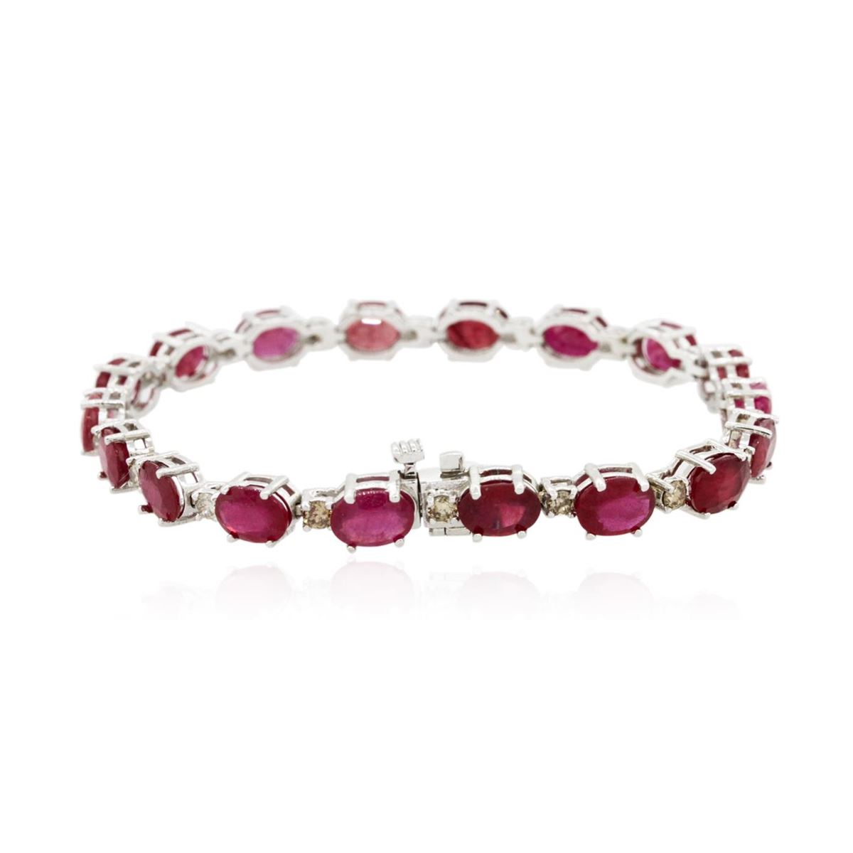 One electronically tested 14KT white gold ladies cast & assembled ruby and diamond bracelet with a bright polish finish. Condition is new, good workmanship. Seven inch length bracelet features a flexible ribbon of rubies alternated by diamonds terminating in a concealed clasp with safety bar. Identified with markings of "14K". Containing: Eighteen prong set oval mixed cut natural rubies, measuring 7.00 x 5.00 x 3.25mm, 8%. bulge factor, approximate. Total Weight of 18.18ct., clarity is heavily included, type II, medium dark, moderately strong, slightly purplish red color, (GIA slpR 6/4), cut is good. Transmitting light somewhat diffusely, transparent to translucent. Naturally occurring internal & external characteristics are present. Indications of laboratory high temperature heat treatment, with glass & flux additives. Measurements & the color grade are an average for the group. Graded in the setting. Ruby has a low tolerance to rhodium plating, repolishing the surface, & ultrasonic cleaning. Eighteen prong set round brilliant cut diamonds, measuring 2.70 - 2.60 x 1.59mm (depth est.) approximate. Total Weight of 18 Stones = 1.32ct. Color grade is an average for the group. Graded in the setting. Clarity: SI-1 to I-1. Total Weight of Colored Stones 18.18ct. Total Weight of Diamonds 1.32ct. Total Weight of Bracelet 12.10 grams. AIG Appraised at $5,445.00.