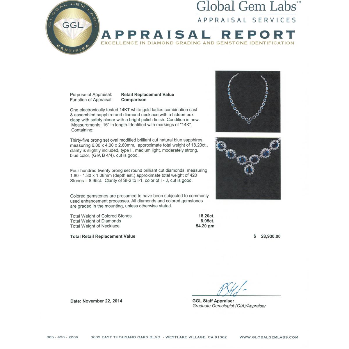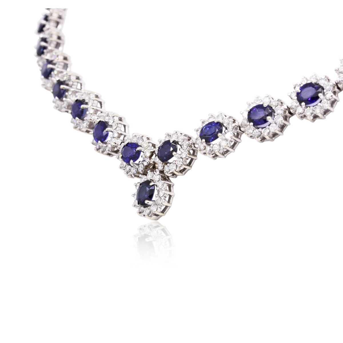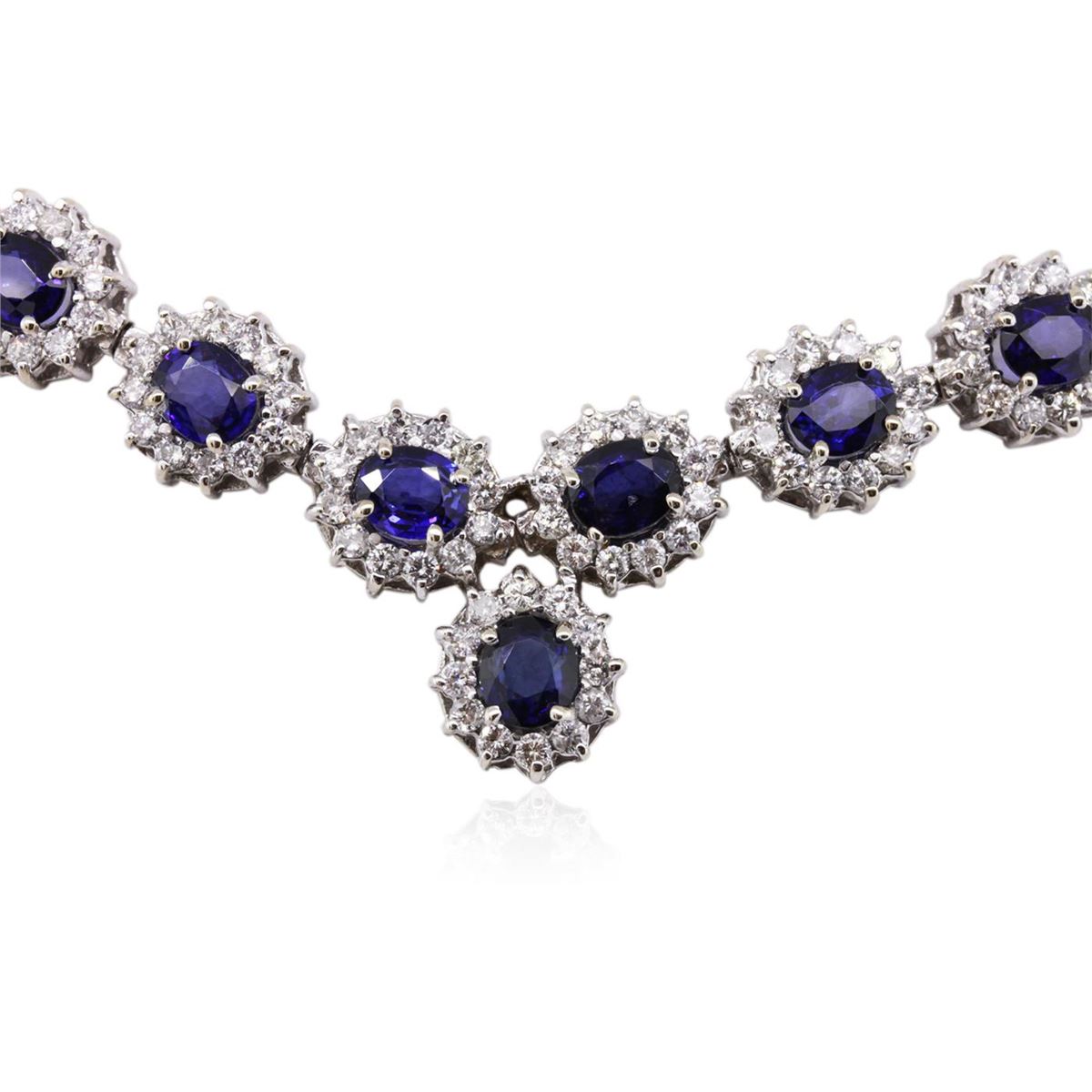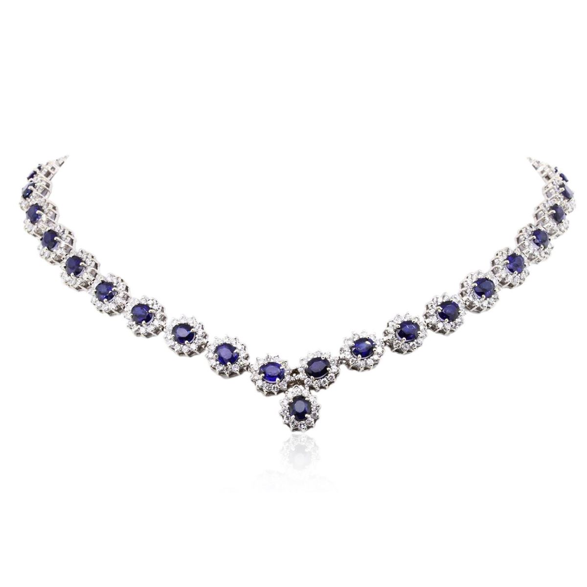 One electronically tested 14KT white gold ladies combination cast & assembled sapphire and diamond necklace with a hidden box clasp with safety closer with a bright polish finish. Measurements: 16" in length Identified with markings of "14K". Condition is new. Containing: Thirty-five prong set oval modified brilliant cut natural blue sapphires, measuring 6.00 x 4.00 x 2.60mm, approximate total weight of 18.20ct., clarity is slightly included, type II, medium light, moderately strong, blue color, (GIA B 4/4), cut is good. Four Hundred Twenty prong set round brilliant cut diamonds, measuring 1.80 - 1.80 x 1.08mm (depth est.) approximate total weight of 420 Stones = 8.95ct. Clarity: SI-2 to I-1. Color: I - J, Cut is Good. Colored gemstones are presumed to have been subjected to commonly used enhancement processes. All diamonds and colored gemstones are graded in the mounting, unless otherwise stated. Total Weight of Colored Stones 18.20ct. Total Weight of Diamonds 8.95ct. Total Weight of Necklace 54.20 grams. GGL Appraised at $28,930.00.